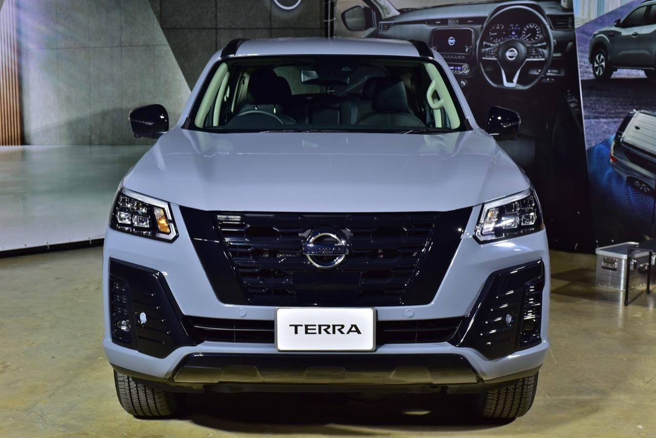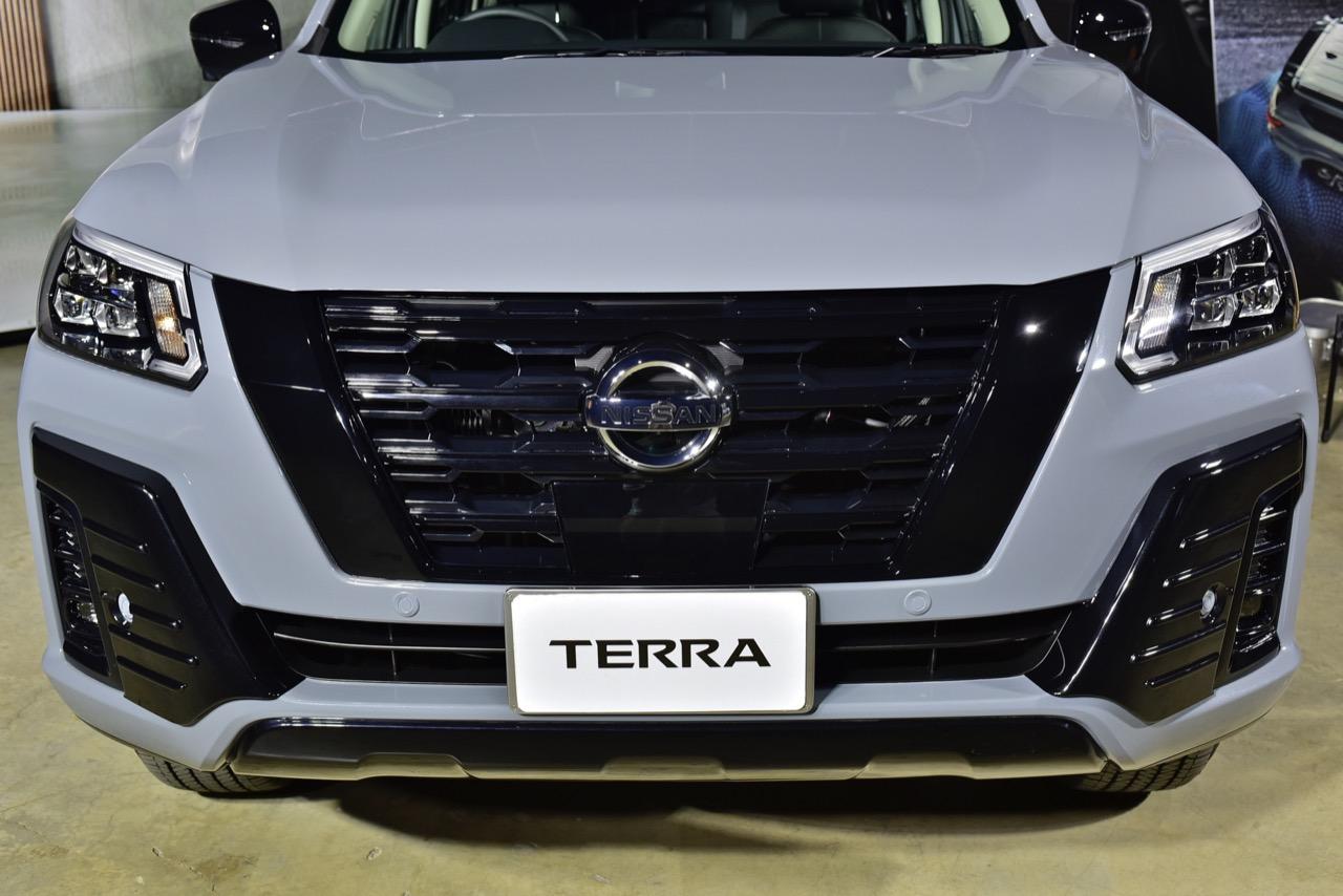 Terra Sport เปลี่ยนดีไซน์กันชนด้านหน้าและด้านหลัง เพื่อเพิ่มความเฉียบคมและลงตัว แม้จะดูแข็งทื่อเหมือนเดิม แต่ภาพรวมของงานปรับปรุงทำให้หน้าตาของ Terra ดูดีขึ้น ถ้าจะอวยกันตรงๆ ก็ได้ความหมายว่า การลงมือปรับหน้าตาใหม่ของ Terra ทำได้ดีกว่ารุ่นก่อนปรับโฉม ไฟหน้าและกระจังหน้าที่ดูลงตัวขึ้น กระจังที่ออกแบบให้มีขนาดใหญ่ตามสมัยนิยมใช้พลาสติกสีดำเงาแทนที่งานโครเมียม แนวนอนด้านในกระจัง สอดรับกับเส้นสายที่ต่อเนื่องจากฝากระโปรง แผ่นกันกระแทกด้านล่างที่เป็นสีเงินเปลี่ยนมาเป็นสีดำ สไตล์พีพีวีเอสยูวีที่ประกอบในประเทศไทย จุดเด่นของใบหน้า Terra Sport ก็คือ ไฟหน้า Quad LED 4 ดวง Nissan แจ้งว่า ไฟหน้า LED แบบใหม่ มีประสิทธิภาพการส่องสว่างสูง ตัวโคมไฟดีไซน์ให้เพรียวบาง ควบรวม ไฟ Daytime Running Light แบบใหม่ ไฟตัดหมอก LED ประสิทธิภาพสูง ล้อมรอบด้วยแถบโครเมียม ลดการแพร่ความร้อน เพื่อยืดอายุการใช้งาน