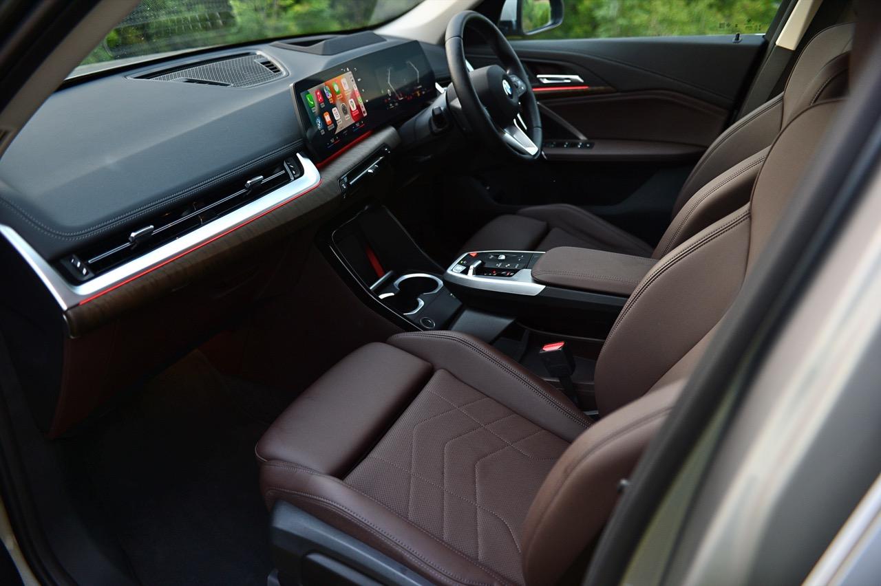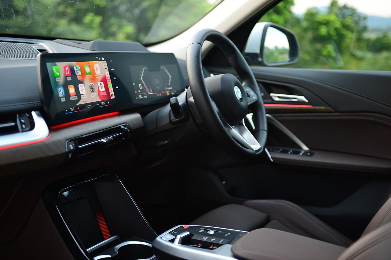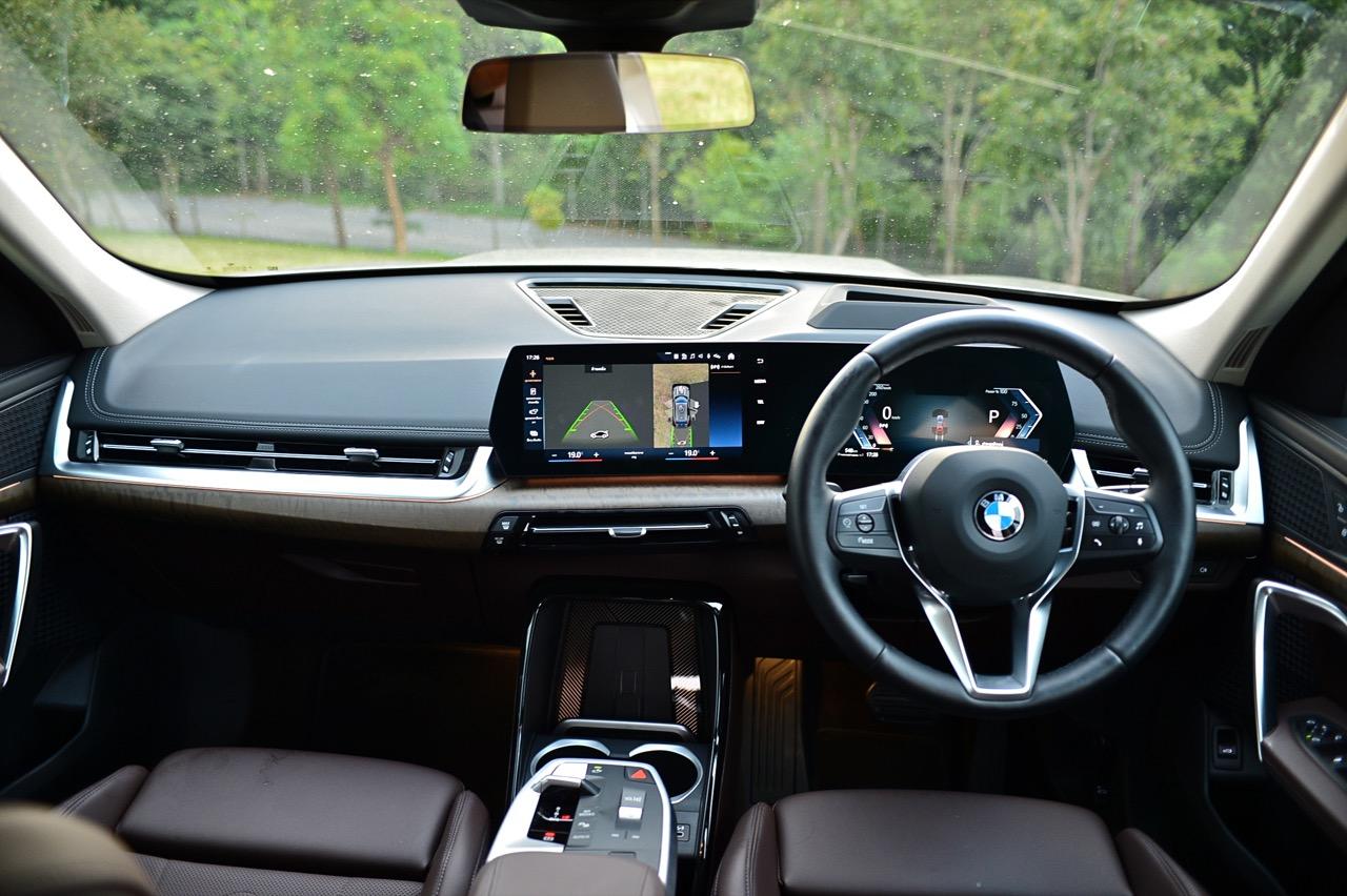 ภายใน BMW X1 sDrive20i xLine สเปกไทย มาพร้อมกับจอแสดงผลทรงโค้ง BMW OS8 (BMW Operating System 8) จอแสดงผลประกอบด้วยแผงหน้าปัดมาตรวัดดิจิทัล (ที่อ่านค่าค่อนข้างยาก) ขนาด 10.25 นิ้ว และจอแสดงผลกลางควบคุมด้วยระบบสัมผัสขนาด 10.7 นิ้ว ระบบ BMW Live Cockpit Plus เบาะนั่ง Sensatec แบบเจาะรูสีน้ำตาล เบาะคนขับและผู้โดยสารตอนหน้าปรับไฟฟ้า เบาะคู่หน้ามีพื้นที่กว้างกว่าเดิม นั่งสบายและปรับท่านั่งได้อย่างครอบคลุม แดชบอร์ดคอนโซล ตกแต่งด้วยลายไม้สีน้ำตาล ด้านบนของแดชบอร์ดหุ้มหนังสังเคราะห์สีดำเย็บเดินตะเข็บด้วยด้ายสีขาว ช่องแอร์ทรงสี่เหลี่ยมดีไซน์ให้เข้ากับแผงแดชบอร์ดและชิ้นงานตกแต่งบริเวณคอนโซล ที่ชาร์จมือถือแบบ wireless ช่องเชื่อมต่อ USB Type C