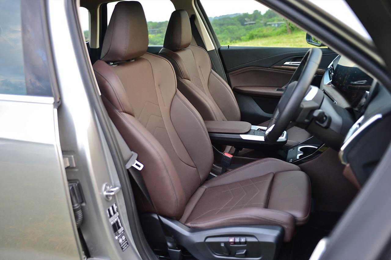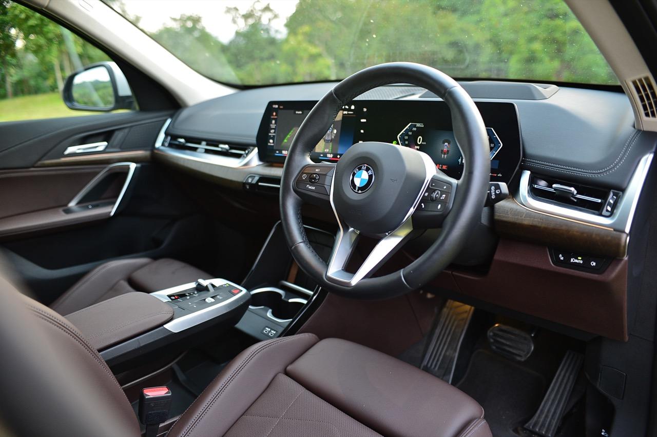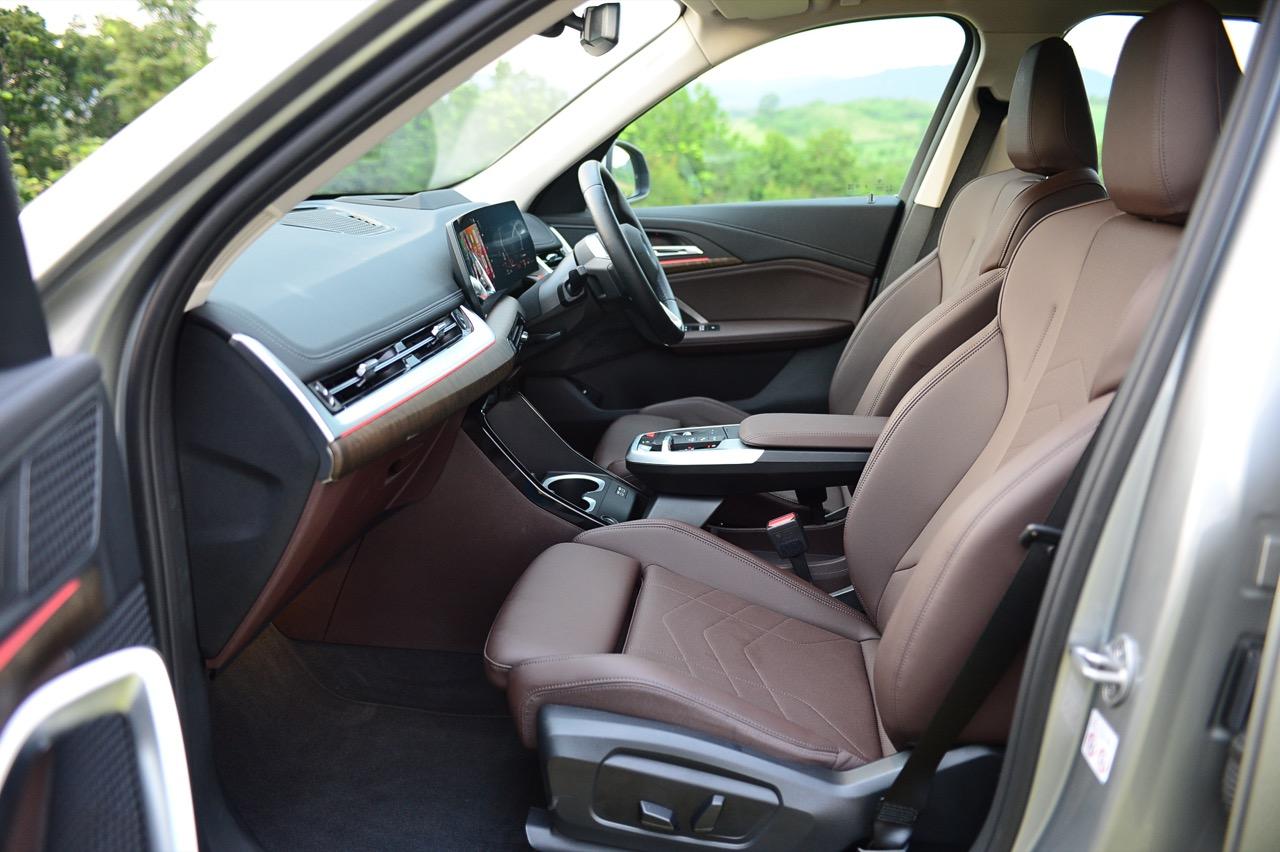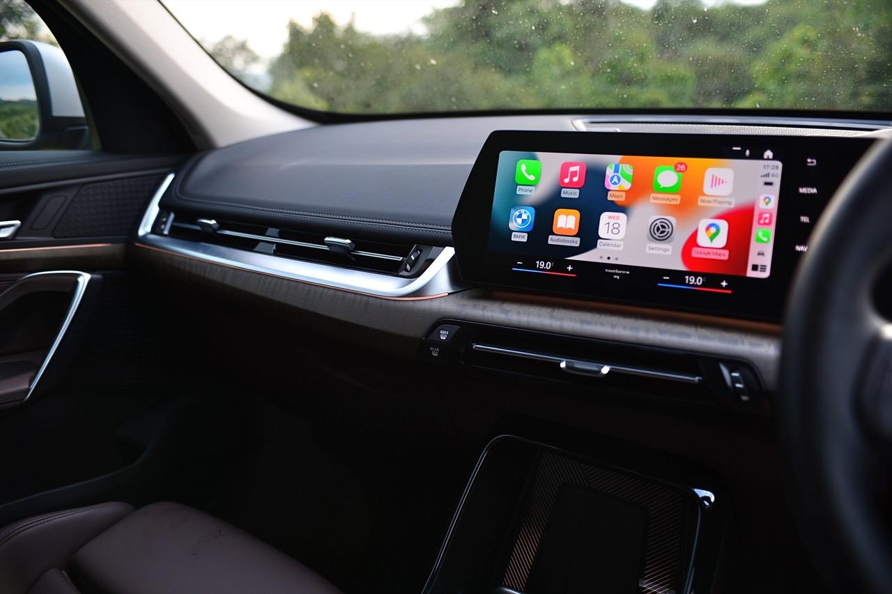 ภายใน BMW X1 sDrive20i xLine สเปกไทย มาพร้อมกับจอแสดงผลทรงโค้ง BMW OS8 (BMW Operating System 8) จอแสดงผลประกอบด้วยแผงหน้าปัดมาตรวัดดิจิทัล (ที่อ่านค่าค่อนข้างยาก) ขนาด 10.25 นิ้ว และจอแสดงผลกลางควบคุมด้วยระบบสัมผัสขนาด 10.7 นิ้ว ระบบ BMW Live Cockpit Plus เบาะนั่ง Sensatec แบบเจาะรูสีน้ำตาล เบาะคนขับและผู้โดยสารตอนหน้าปรับไฟฟ้า เบาะคู่หน้ามีพื้นที่กว้างกว่าเดิม นั่งสบายและปรับท่านั่งได้อย่างครอบคลุม แดชบอร์ดคอนโซล ตกแต่งด้วยลายไม้สีน้ำตาล ด้านบนของแดชบอร์ดหุ้มหนังสังเคราะห์สีดำเย็บเดินตะเข็บด้วยด้ายสีขาว ช่องแอร์ทรงสี่เหลี่ยมดีไซน์ให้เข้ากับแผงแดชบอร์ดและชิ้นงานตกแต่งบริเวณคอนโซล ที่ชาร์จมือถือแบบ wireless ช่องเชื่อมต่อ USB Type C