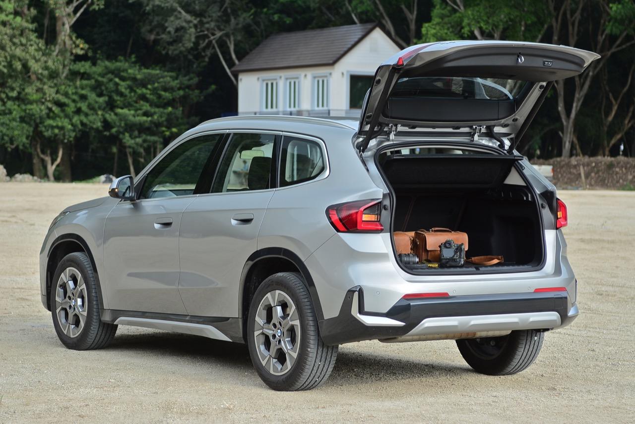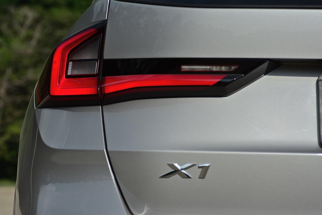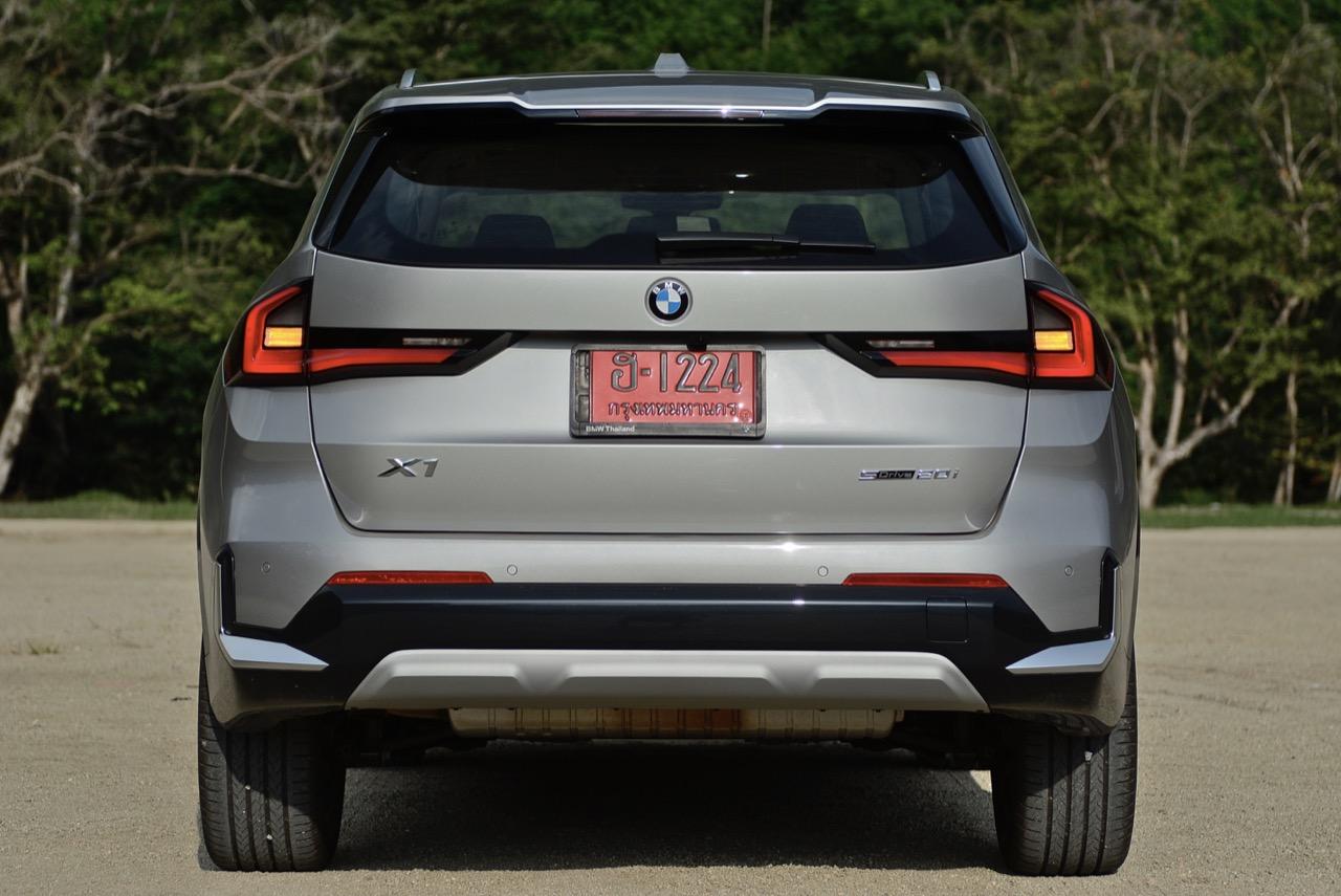 บั้นท้ายออกแบบได้อย่างเฉียบคมและทำให้รถดูสปอร์ตมากยิ่งขึ้นด้วยไฟท้าย LED แบบใหม่ กันชนหลังเล่นเหลี่ยมมุม ตกแต่งขอบของกันชนหลังด้วยพลาสติกโครเมียม พลาสติกสะท้อนแสงมัลติรีเฟคเตอร์ เซนเซอร์ท้ายสี่จุด ฝาท้ายไฟฟ้า ไฟเบรกดวงที่สาม ติดตั้งอยู่บนสปอยเลอร์ครอบกรอบกระจกบานฝาท้าย เสาอากาศครีบฉลามหายไป แทนที่ด้วยเสาอากาศแบบใหม่รูปทรงคล้ายพีระมิด กระจกบานฝาท้ายมาพร้อมกับใบปัดน้ำฝนด้านหลัง มิติตัวถังของ BMW X1 X Line SDrive 20i มีขนาดความยาว 4,500 มิลลิเมตร กว้าง 1,845 มิลลิเมตร สูง 1,642 มิลลิเมตร ความยาวฐานล้อ 2,692 มิลลิเมตร ระยะโอเวอร์แฮงค์หน้า 875 มิลลิเมตร ระยะโอเวอร์แฮงค์หลัง 933 มิลลิเมตร ความกว้างฐานล้อหน้า 1,592 มิลลิเมตร ความกว้างฐานล้อหลัง 1,593 มิลลิเมตร พื้นที่เก็บสัมภาระส่วนท้ายเมื่อไม่พับเบาะ 540 ลิตร และเพิ่มเป็น 1,600 ลิตร เมื่อพับเบาะหลัง น้ำหนักรถ 1,625 กิโลกรัม