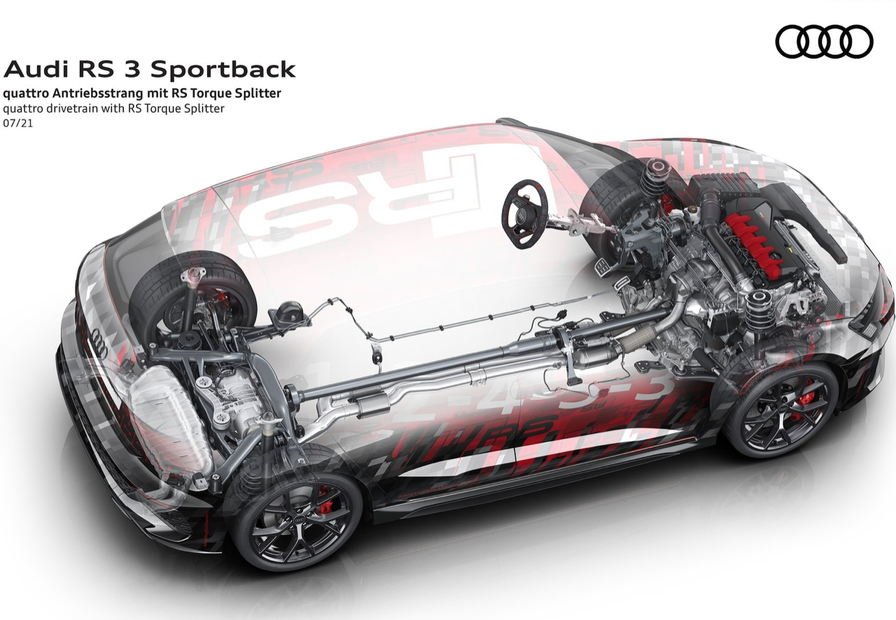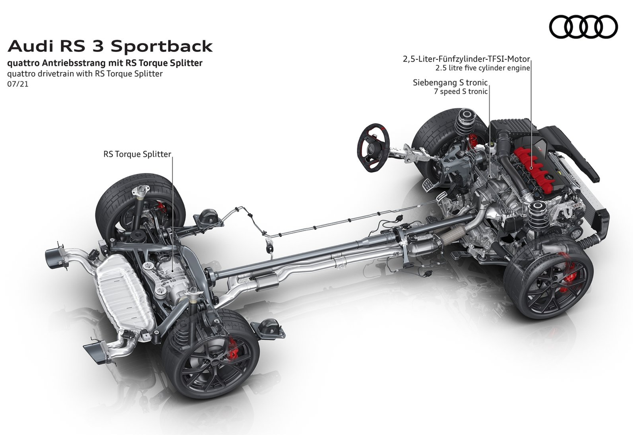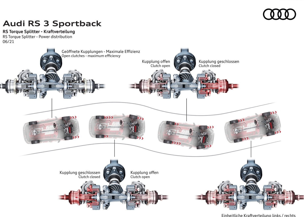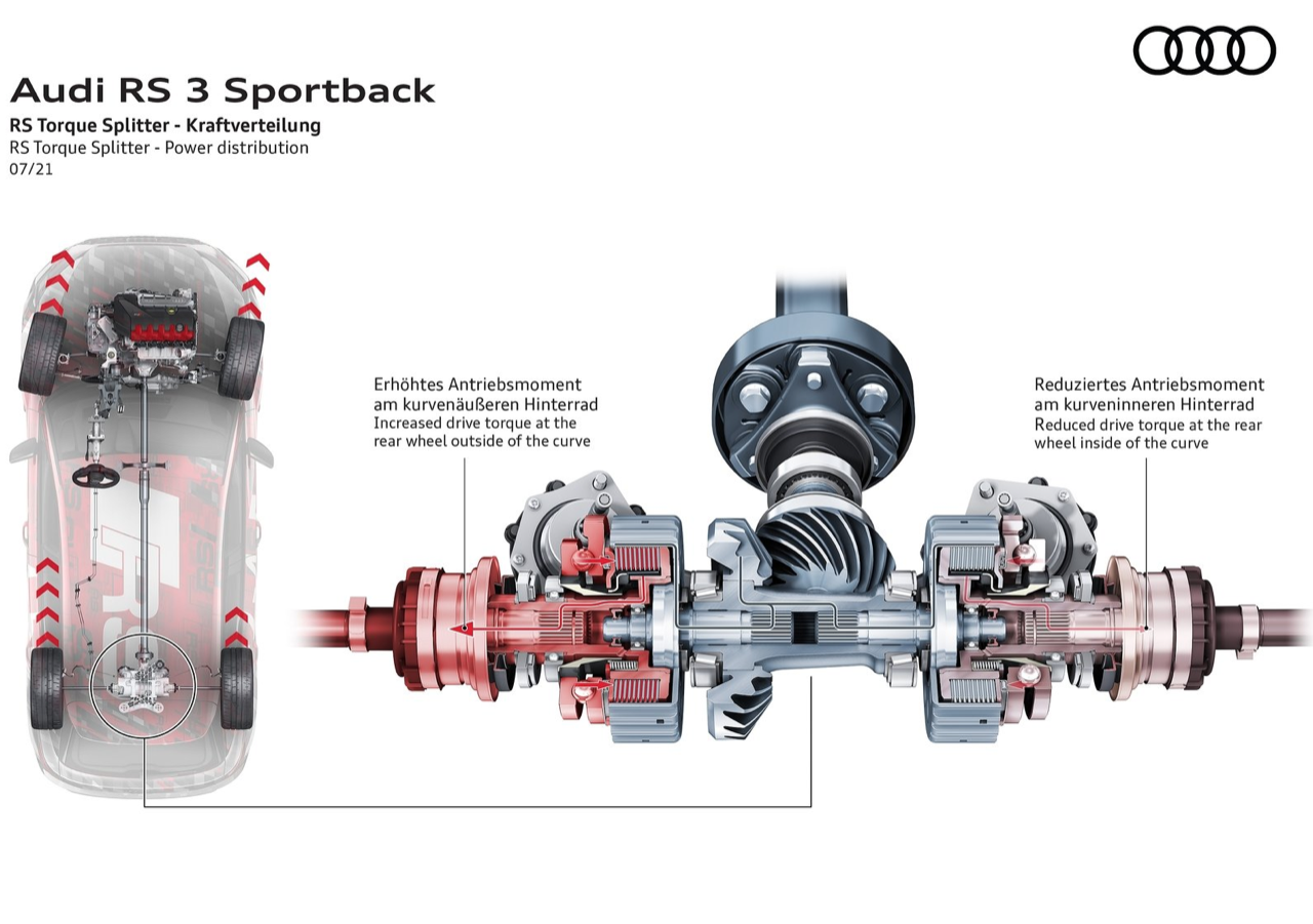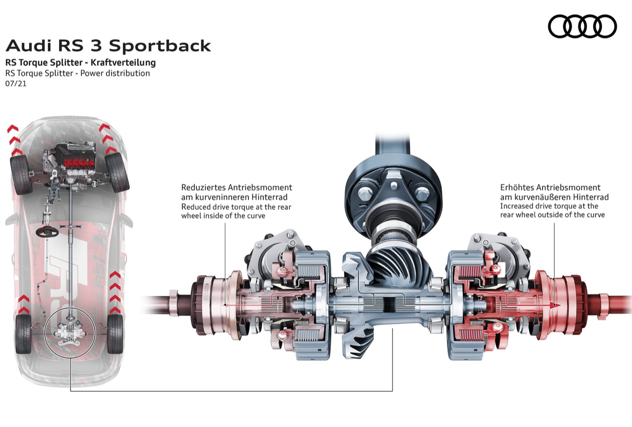 RS Torque Splitter สามารถกระจายแรงบิดแบบแปรผันได้อย่างต่อเนื่องและรวดเร็ว การทดกำลังจะเกิดขึ้นที่ล้อหลังโดยตรง แตกต่างจากเฟืองท้ายของเพลาล้อหลัง และแพ็กเกจดิสก์คลัตช์หลายแผ่น ซึ่งก่อนหน้านี้ที่เคยติดตั้งบนเพลาหลังของ RS3 โฉมท่ีแล้ว ใน RS3 รุ่นใหม่ ตัวแยกแรงบิด RS Torque Splitter ใช้คลัตช์หลายแผ่นควบคุมด้วยระบบอิเล็กทรอนิกส์ แต่ละตัวอยู่บนเพลาทดกำลังที่เกี่ยวข้อง ในระหว่างการขับอย่างรุนแรงซึ่งเน้นไปที่ไดนามิกของรถ ตัวแยกแรงบิดจะเพิ่มแรงบิดในการขับเคลื่อน ส่งตรงไปยังล้อหลังด้านนอก เนื่องจากภารกรรมของล้อหลังด้านนอกที่สูงกว่า ช่วยลดแนวโน้มที่จะเกิดอาการอันเดอร์สเตียร์ได้อย่างมาก จุดที่สมดุลนี้ ทำให้รถเข้าออกโค้งได้เร็วขึ้น ในโค้งซ้ายระบบจะส่งแรงบิดไปยังล้อหลังขวา ส่วนในโค้งขวาแรงบิดจะเทไปยังล้อหลังซ้าย เมื่อขับตรงไปข้างหน้า ระบบจะกระจายแรงเพื่อความสมดุลที่ล้อหลัง 100% ผลลัพธ์ที่ได้จากการทำหน้าที่ของ RS Torque Splitter ก็คือ ความเสถียรและความคล่องตัวในระดับสูงสุด โดยเฉพาะอย่างยิ่งเมื่อเข้าโค้งด้วยความเร็วสูง อัดเต็มกำลังในสนามแข่ง ตัวแยกแรงบิด ช่วยควบคุมการดริฟต์ได้โดยการส่งกำลังเครื่องยนต์ทั้งหมดไปที่เพลาหลังโดยตัดกำลังล้อหน้า 100% ด้วยแรงบิดสูงสุด 500 นิวตันเมตร การกระจายแรงบิดทั้งหมด ขึ้นอยู่กับโหมดที่เลือกและสถานการณ์การขับ RS Torque Rear ส่งแรงบิดไปยังล้อหลังแบบ 100% คลัตช์ดิสก์หลายแผ่น แต่ละตัวมีหน่วยควบคุมของตัวเอง เซนเซอร์ความเร็วล้อของระบบควบคุมเสถียรภาพแบบอิเล็กทรอนิกส์ ทำหน้าที่ตรวจจับหรือวัดความเร็วรอบของล้อ ปัจจัยที่มีอิทธิพลอื่นๆ กับการทำงานของระบบนี้ ได้แก่ การเร่งความเร็วทางตรงหรือในโค้ง มุมบังคับเลี้ยว ตำแหน่งของคันเร่ง ตำแหน่งของเกียร์ที่เลือก (ในโหมดแมนนวล) และมุมองศาของการหันเห เช่น การเคลื่อนที่ หมุนรอบแกนแบบการทำโดนัทด้วยการดริฟต์ นอกจากนี้ ตัวแยกแรงบิดยังเชื่อมต่อกับตัวควบคุมไดนามิกแบบโมดูลาร์เพื่อความแม่นยำและตอบสนองอย่างรวดเร็ว