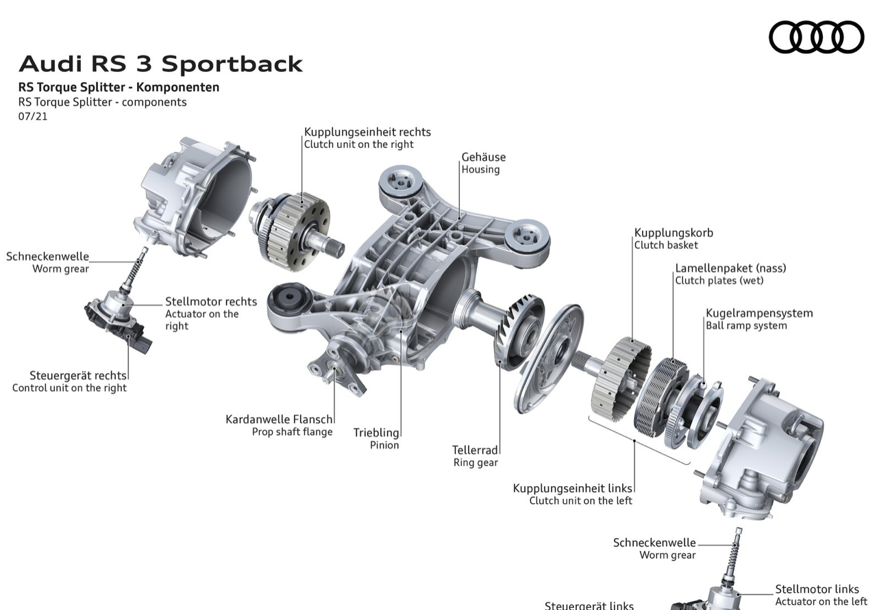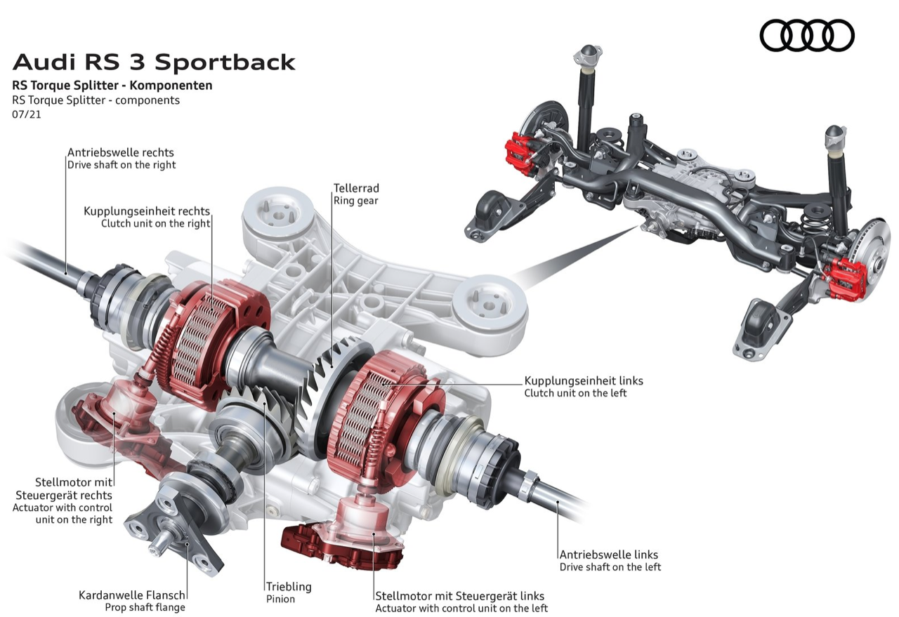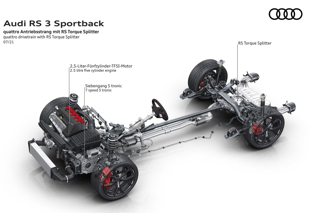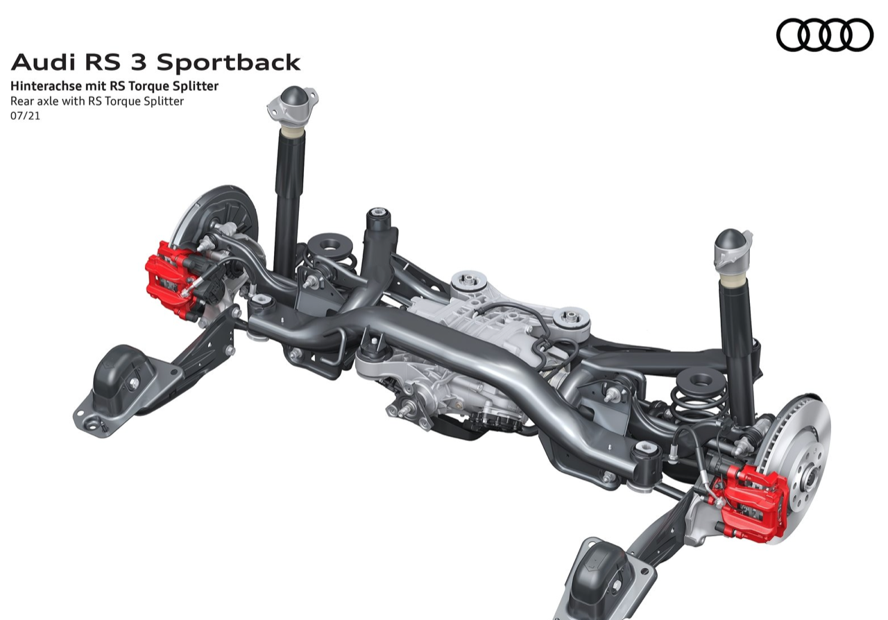 RS Torque Splitter สามารถกระจายแรงบิดแบบแปรผันได้อย่างต่อเนื่องและรวดเร็ว การทดกำลังจะเกิดขึ้นที่ล้อหลังโดยตรง แตกต่างจากเฟืองท้ายของเพลาล้อหลัง และแพ็กเกจดิสก์คลัตช์หลายแผ่น ซึ่งก่อนหน้านี้ที่เคยติดตั้งบนเพลาหลังของ RS3 โฉมท่ีแล้ว ใน RS3 รุ่นใหม่ ตัวแยกแรงบิด RS Torque Splitter ใช้คลัตช์หลายแผ่นควบคุมด้วยระบบอิเล็กทรอนิกส์ แต่ละตัวอยู่บนเพลาทดกำลังที่เกี่ยวข้อง ในระหว่างการขับอย่างรุนแรงซึ่งเน้นไปที่ไดนามิกของรถ ตัวแยกแรงบิดจะเพิ่มแรงบิดในการขับเคลื่อน ส่งตรงไปยังล้อหลังด้านนอก เนื่องจากภารกรรมของล้อหลังด้านนอกที่สูงกว่า ช่วยลดแนวโน้มที่จะเกิดอาการอันเดอร์สเตียร์ได้อย่างมาก จุดที่สมดุลนี้ ทำให้รถเข้าออกโค้งได้เร็วขึ้น ในโค้งซ้ายระบบจะส่งแรงบิดไปยังล้อหลังขวา ส่วนในโค้งขวาแรงบิดจะเทไปยังล้อหลังซ้าย เมื่อขับตรงไปข้างหน้า ระบบจะกระจายแรงเพื่อความสมดุลที่ล้อหลัง 100% ผลลัพธ์ที่ได้จากการทำหน้าที่ของ RS Torque Splitter ก็คือ ความเสถียรและความคล่องตัวในระดับสูงสุด โดยเฉพาะอย่างยิ่งเมื่อเข้าโค้งด้วยความเร็วสูง อัดเต็มกำลังในสนามแข่ง ตัวแยกแรงบิด ช่วยควบคุมการดริฟต์ได้โดยการส่งกำลังเครื่องยนต์ทั้งหมดไปที่เพลาหลังโดยตัดกำลังล้อหน้า 100% ด้วยแรงบิดสูงสุด 500 นิวตันเมตร การกระจายแรงบิดทั้งหมด ขึ้นอยู่กับโหมดที่เลือกและสถานการณ์การขับ RS Torque Rear ส่งแรงบิดไปยังล้อหลังแบบ 100% คลัตช์ดิสก์หลายแผ่น แต่ละตัวมีหน่วยควบคุมของตัวเอง เซนเซอร์ความเร็วล้อของระบบควบคุมเสถียรภาพแบบอิเล็กทรอนิกส์ ทำหน้าที่ตรวจจับหรือวัดความเร็วรอบของล้อ ปัจจัยที่มีอิทธิพลอื่นๆ กับการทำงานของระบบนี้ ได้แก่ การเร่งความเร็วทางตรงหรือในโค้ง มุมบังคับเลี้ยว ตำแหน่งของคันเร่ง ตำแหน่งของเกียร์ที่เลือก (ในโหมดแมนนวล) และมุมองศาของการหันเห เช่น การเคลื่อนที่ หมุนรอบแกนแบบการทำโดนัทด้วยการดริฟต์ นอกจากนี้ ตัวแยกแรงบิดยังเชื่อมต่อกับตัวควบคุมไดนามิกแบบโมดูลาร์เพื่อความแม่นยำและตอบสนองอย่างรวดเร็ว