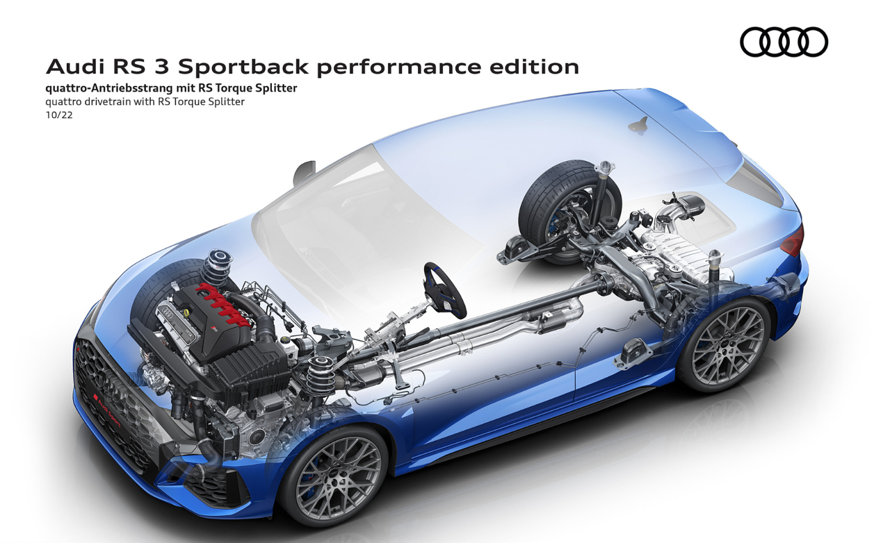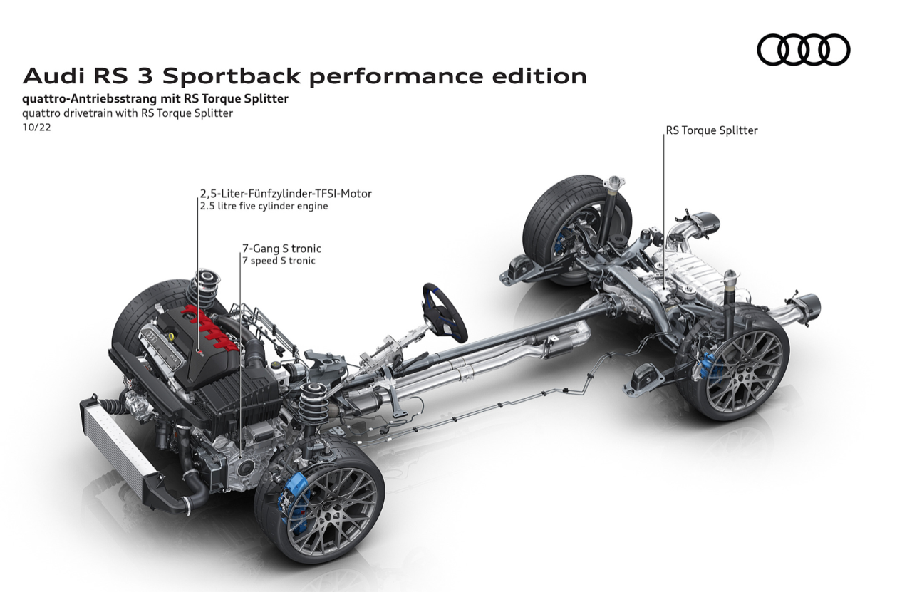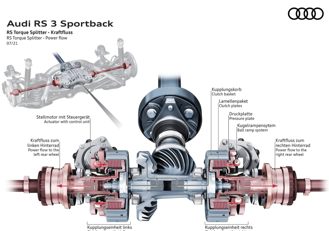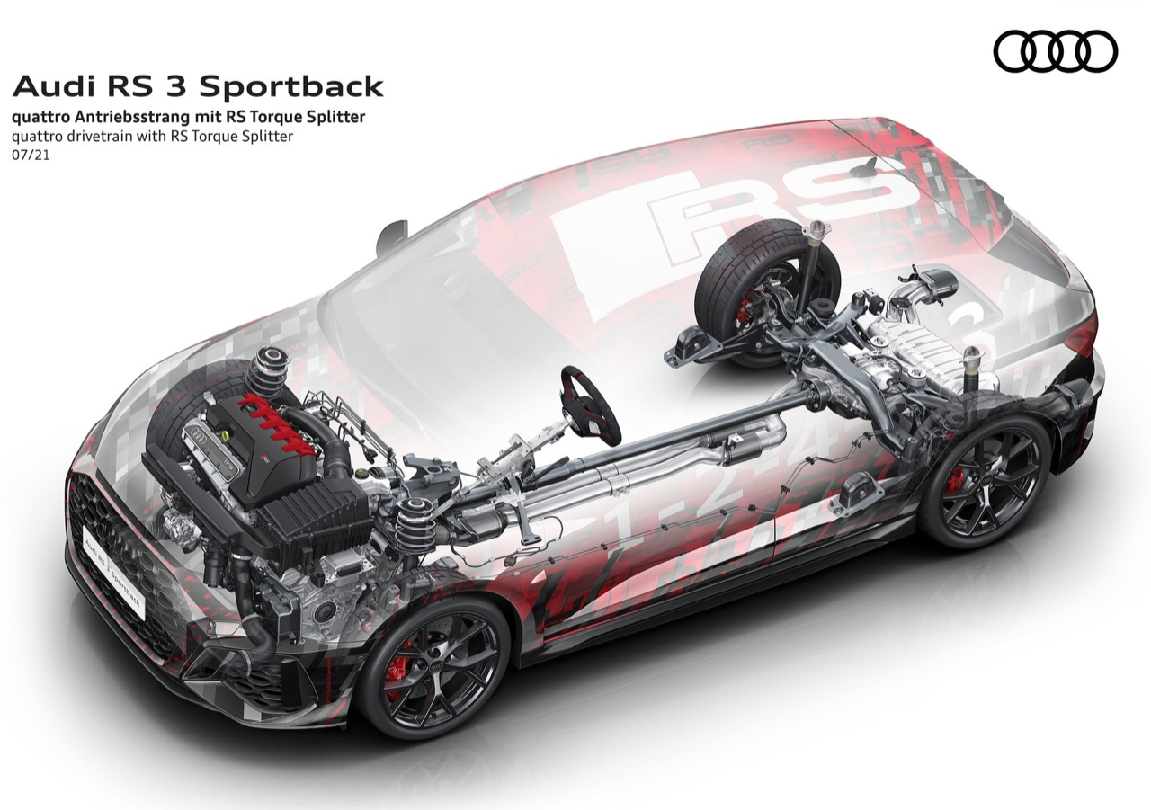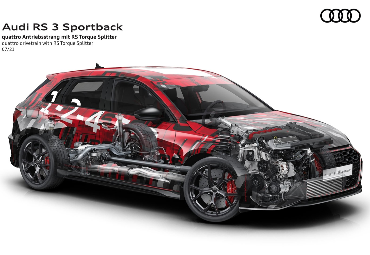 RS Torque Splitter สามารถกระจายแรงบิดแบบแปรผันได้อย่างต่อเนื่องและรวดเร็ว การทดกำลังจะเกิดขึ้นที่ล้อหลังโดยตรง แตกต่างจากเฟืองท้ายของเพลาล้อหลัง และแพ็กเกจดิสก์คลัตช์หลายแผ่น ซึ่งก่อนหน้านี้ที่เคยติดตั้งบนเพลาหลังของ RS3 โฉมท่ีแล้ว ใน RS3 รุ่นใหม่ ตัวแยกแรงบิด RS Torque Splitter ใช้คลัตช์หลายแผ่นควบคุมด้วยระบบอิเล็กทรอนิกส์ แต่ละตัวอยู่บนเพลาทดกำลังที่เกี่ยวข้อง ในระหว่างการขับอย่างรุนแรงซึ่งเน้นไปที่ไดนามิกของรถ ตัวแยกแรงบิดจะเพิ่มแรงบิดในการขับเคลื่อน ส่งตรงไปยังล้อหลังด้านนอก เนื่องจากภารกรรมของล้อหลังด้านนอกที่สูงกว่า ช่วยลดแนวโน้มที่จะเกิดอาการอันเดอร์สเตียร์ได้อย่างมาก จุดที่สมดุลนี้ ทำให้รถเข้าออกโค้งได้เร็วขึ้น ในโค้งซ้ายระบบจะส่งแรงบิดไปยังล้อหลังขวา ส่วนในโค้งขวาแรงบิดจะเทไปยังล้อหลังซ้าย เมื่อขับตรงไปข้างหน้า ระบบจะกระจายแรงเพื่อความสมดุลที่ล้อหลัง 100% ผลลัพธ์ที่ได้จากการทำหน้าที่ของ RS Torque Splitter ก็คือ ความเสถียรและความคล่องตัวในระดับสูงสุด โดยเฉพาะอย่างยิ่งเมื่อเข้าโค้งด้วยความเร็วสูง อัดเต็มกำลังในสนามแข่ง ตัวแยกแรงบิด ช่วยควบคุมการดริฟต์ได้โดยการส่งกำลังเครื่องยนต์ทั้งหมดไปที่เพลาหลังโดยตัดกำลังล้อหน้า 100% ด้วยแรงบิดสูงสุด 500 นิวตันเมตร การกระจายแรงบิดทั้งหมด ขึ้นอยู่กับโหมดที่เลือกและสถานการณ์การขับ RS Torque Rear ส่งแรงบิดไปยังล้อหลังแบบ 100% คลัตช์ดิสก์หลายแผ่น แต่ละตัวมีหน่วยควบคุมของตัวเอง เซนเซอร์ความเร็วล้อของระบบควบคุมเสถียรภาพแบบอิเล็กทรอนิกส์ ทำหน้าที่ตรวจจับหรือวัดความเร็วรอบของล้อ ปัจจัยที่มีอิทธิพลอื่นๆ กับการทำงานของระบบนี้ ได้แก่ การเร่งความเร็วทางตรงหรือในโค้ง มุมบังคับเลี้ยว ตำแหน่งของคันเร่ง ตำแหน่งของเกียร์ที่เลือก (ในโหมดแมนนวล) และมุมองศาของการหันเห เช่น การเคลื่อนที่ หมุนรอบแกนแบบการทำโดนัทด้วยการดริฟต์ นอกจากนี้ ตัวแยกแรงบิดยังเชื่อมต่อกับตัวควบคุมไดนามิกแบบโมดูลาร์เพื่อความแม่นยำและตอบสนองอย่างรวดเร็ว