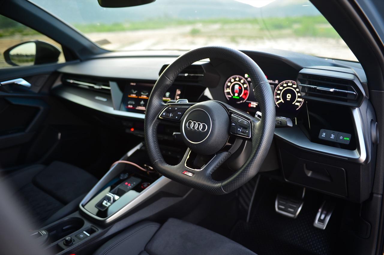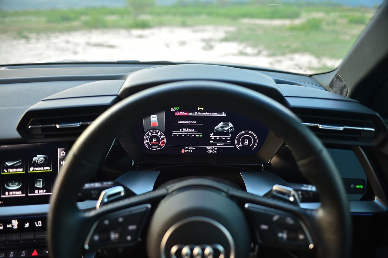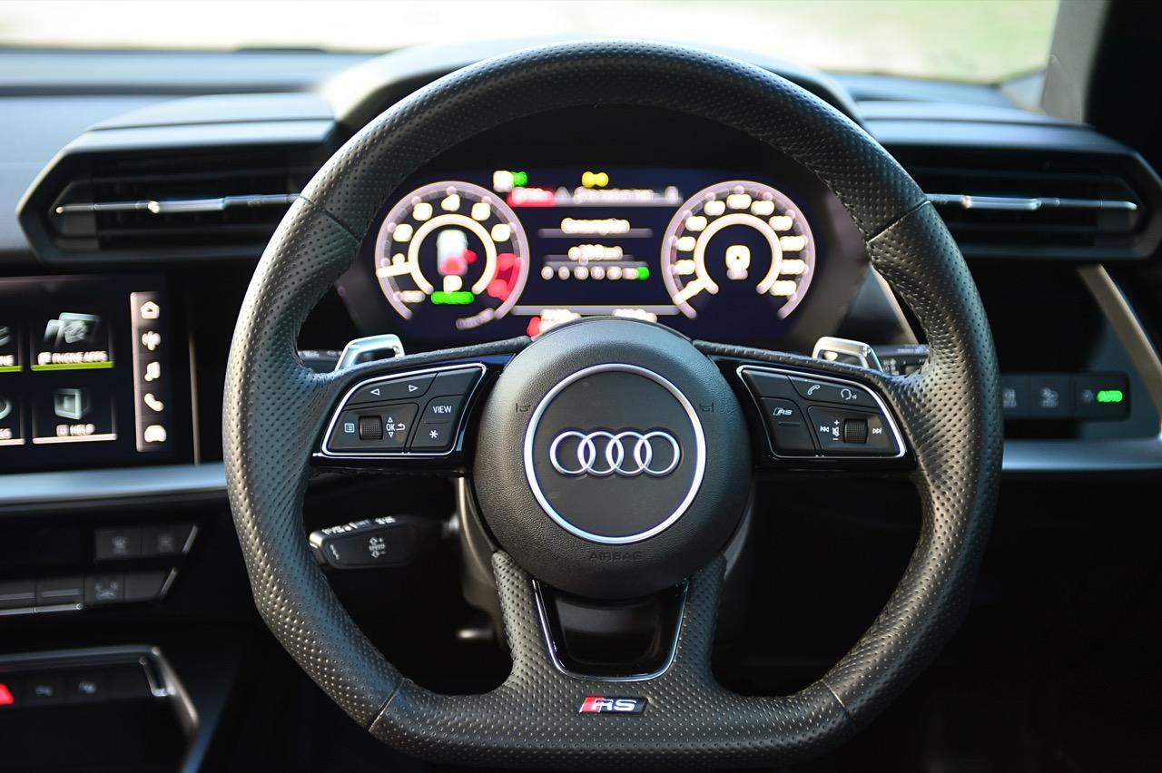 5 สูบ 2.5 TFSI ใน RS3 เป็นเครื่องยนต์ที่สมดุล แม้จะมีตำแหน่งสูบแบบเลขคี่ แต่การปรับจูนทำให้เครื่องยนต์รุ่นนี้ ทั้งแรงและประหยัด เดินเบานิ่งเหมือนเครื่องสูบเลขคู่ ลองนึกภาพ Honda City Hatchback มีแรงบิดถึง 500 นิวตันเมตร ดูครับ แรงบิดในรถคันเล็กจิ๋วที่มีพลังงานเท่ากับ BMW M340i แต่อย่าลืมว่า M performance M340i นั้นมีสูบมากกว่า RS3 1 สูบ และมีความจุมากกว่า 500 ซีซี. จุดที่ชอบก็คือ เมื่อยกเท้าออกจากแป้นคันเร่ง ที่ความเร็วสูงกว่า 110 กิโลเมตรต่อชั่วโมง รอบเครื่องยนต์จะเข้าสู่โหมดเดินเบา เพื่อประหยัดเชื้อเพลิง และเมื่อเท้าของเรา แตะที่คันเร่ง หรือเบรก รอบเครื่องยนต์จะกลับไปเชื่อมกับความเร็วรถในขณะนั้นอีกครั้งอย่างรวดเร็ว ในรถ 400 ม้า อัตราสิ้นเปลือง 11.7 กิโลเมตรต่อลิตร หายากครับ