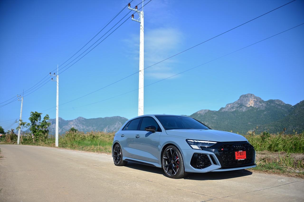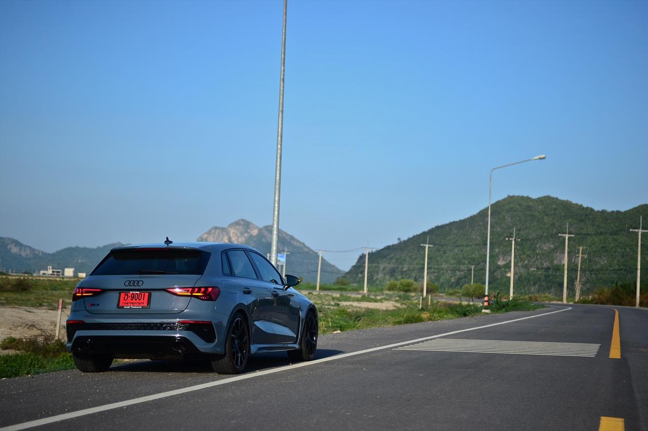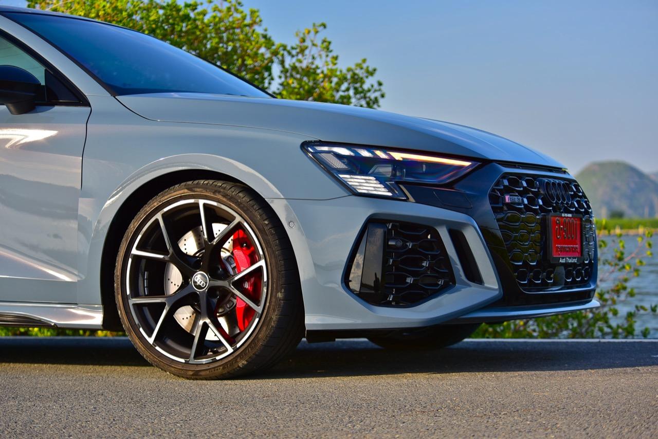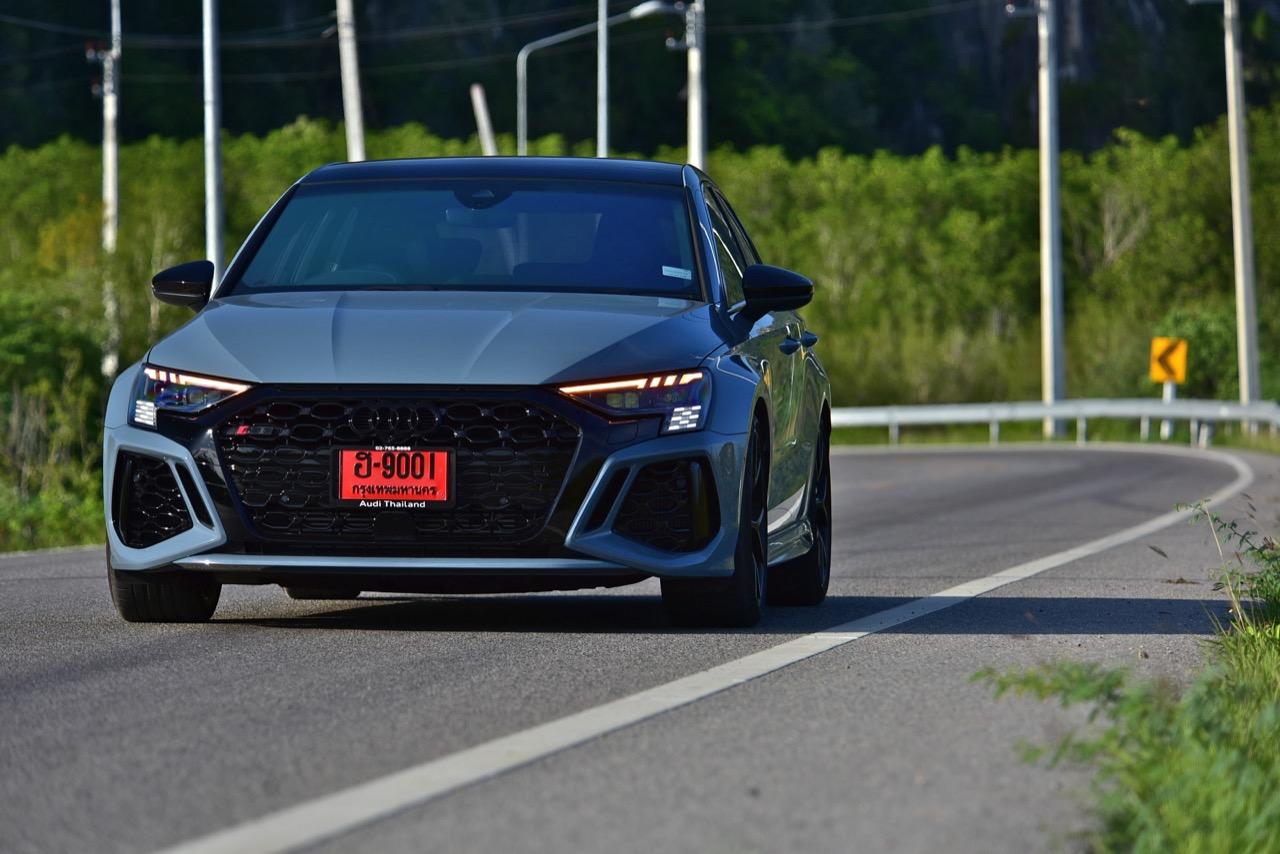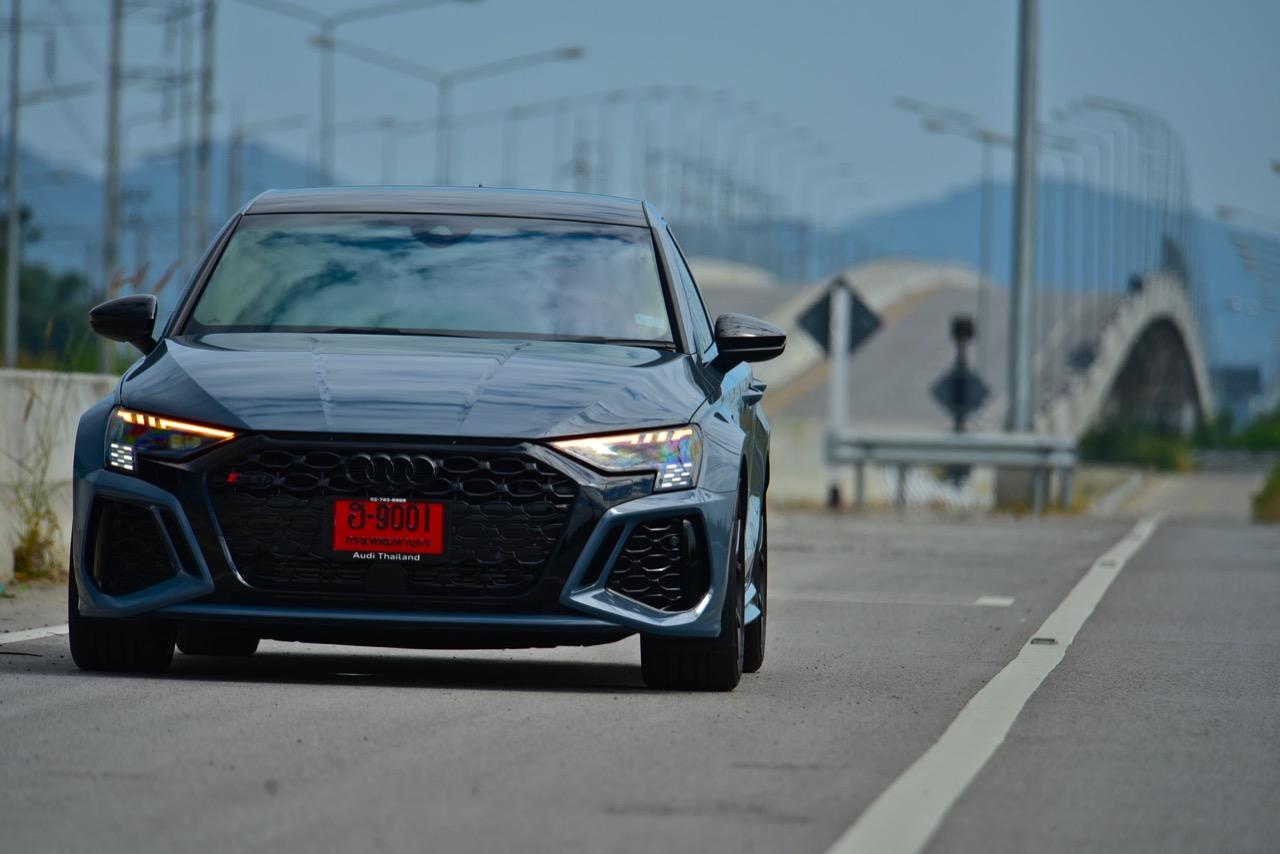 เมื่อใช้สมาธิจดจ่ออยู่กับการขับ เพื่อซึมซับการตอบสนองของแฮตช์แบ็กเด็กเล็ก Audi RS3 สีเทา Kemora gray metallic ทรงของรถแบบ 5 ประตูไซส์เล็ก บวกยางแก้มเตี้ย แสดงให้เห็นถึงความคล่องตัวในการขับขี่ ที่ดูเหมือนจะไร้การปรุงแต่ง แต่จริงๆ แล้วโคตรจะปรุงแต่ง ไม่ว่าจะเป็นเฟืองทดกำลัง ซอฟต์แวร์สั่งงาน เทอร์โบที่แลคน้อยมาก กับล้อและยางที่ถือว่าสำคัญไม่แพ้องคาพยบจุดอื่นๆ RS3 เป็นรถคันแรกของ Audi ที่ติดตั้งกลไก RS Torque Splitter ซึ่งเป็นชุดเฟืองกระจายแรงบิดในการขับเคลื่อนระหว่างล้อหลัง ในลักษณะที่แปรผันอย่างต่อเนื่อง เมื่อผสมผสานกับลูกระเบิดอย่างเครื่องยนต์ห้าสูบ 400 แรงม้า ทำให้รถสปอร์ตขนาดกะทัดรัดคันนี้ มีความคล่องตัวอย่างเหนือชั้น คุณสามารถกระชากร่างหนัก 1.6 ตัน ให้พุ่งทะยานได้อย่างใจนึก เครื่อง 2.5 TFSI ให้แรงบิด 500 นิวตันเมตร เท่ากับ BMW M340i X Drive แต่ M ปลอมรุ่นนี้ มีสูบมากกว่าหนึ่งตำแหน่ง แถมความจุก็ยังมากกว่า 500 ซีซี แรงบิดของ New RS3 ลำล่าสุด จัดมาหนักข้อมากกว่ารุ่นก่อนถึง 20 นิวตันเมตร แพ็กเกจปลดล็อกความเร็วสูงสุดสามารถทะยานไปได้ถึง 290 กม./ชม. (ออปชันเสริมที่ต้องจ่ายเพิ่ม) ซึ่งถือเป็นสถิติสูงสุดในเซ็กเมนต์แฮตช์แบ็ก ณ เวลานี้ การเร่งที่น่ากลัวของปิศาจสี่ห่วงคันจิ๋ว เกิดจากการประดังเทคโนโลยีในระบบขับเคลื่อน เพื่อสร้างรถที่เชื่อมโยงกับลัทธิ Quattro ได้อย่างสมบูรณ์แบบ