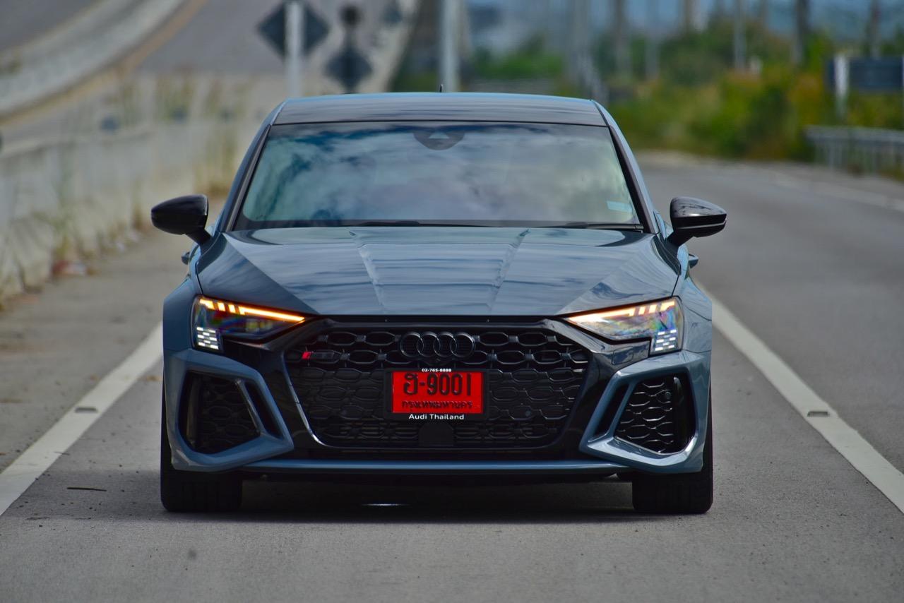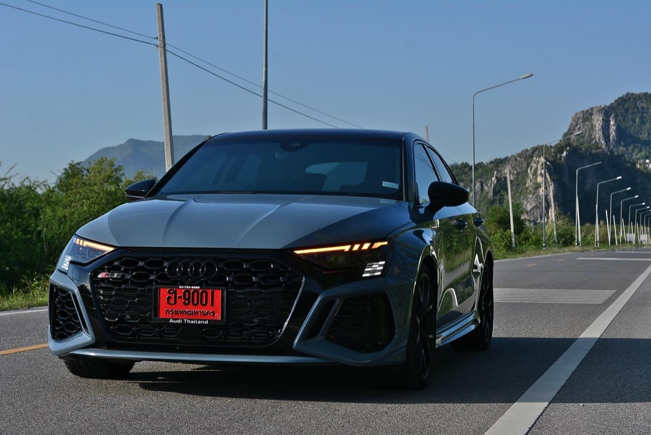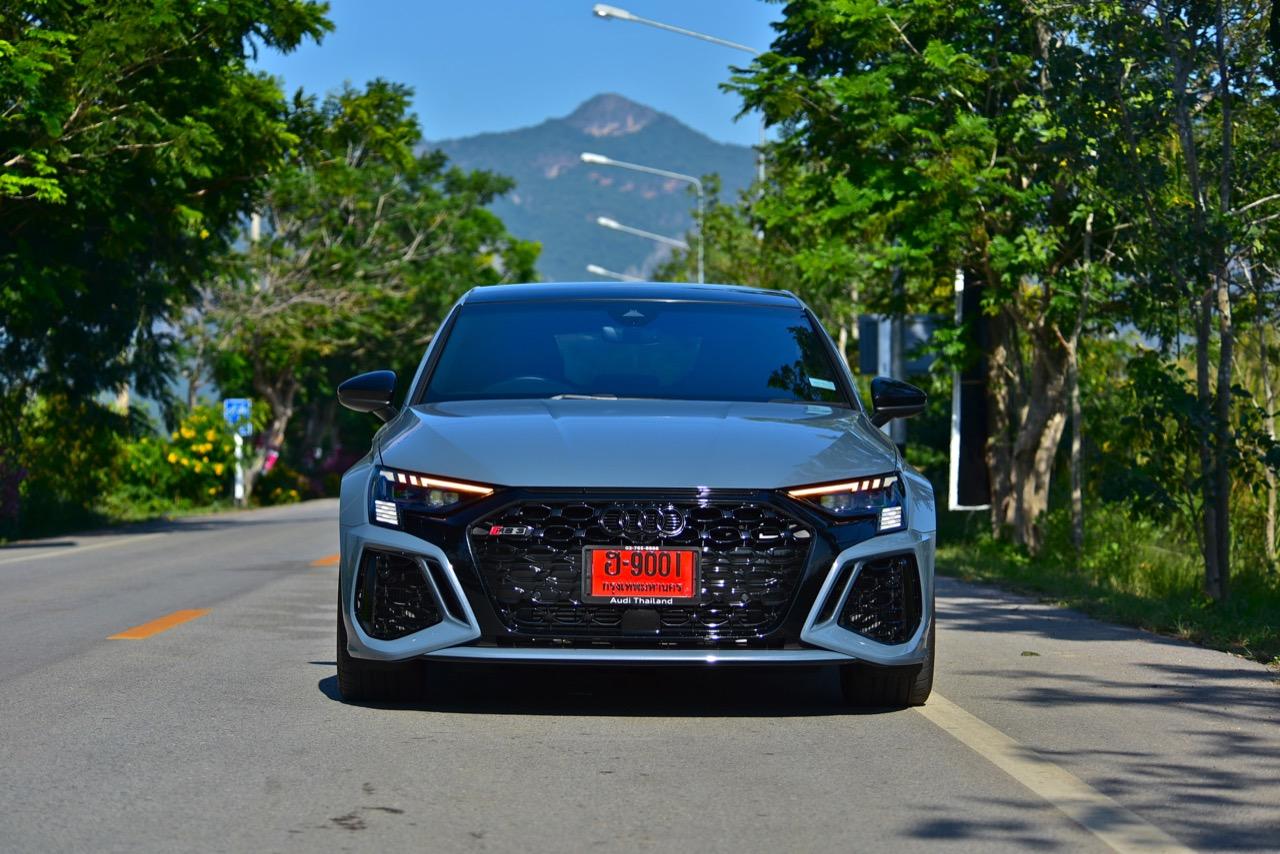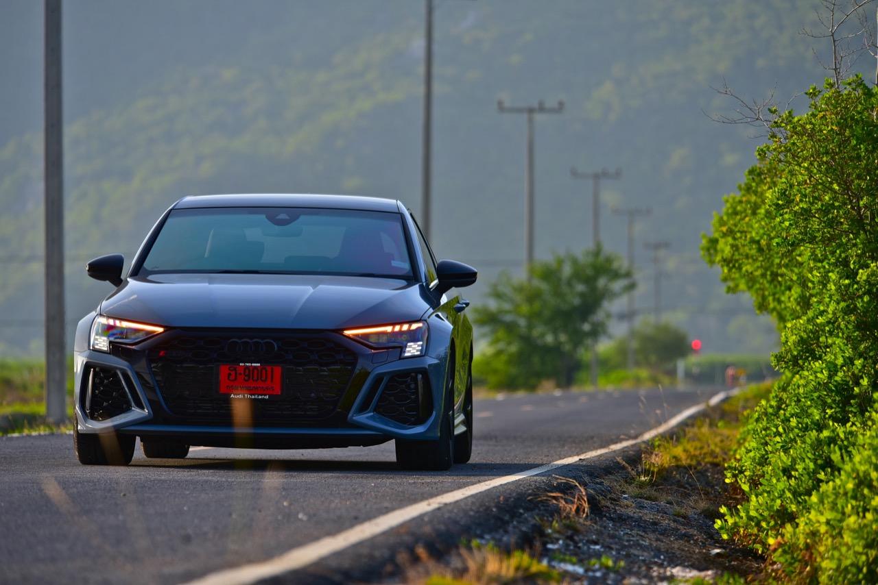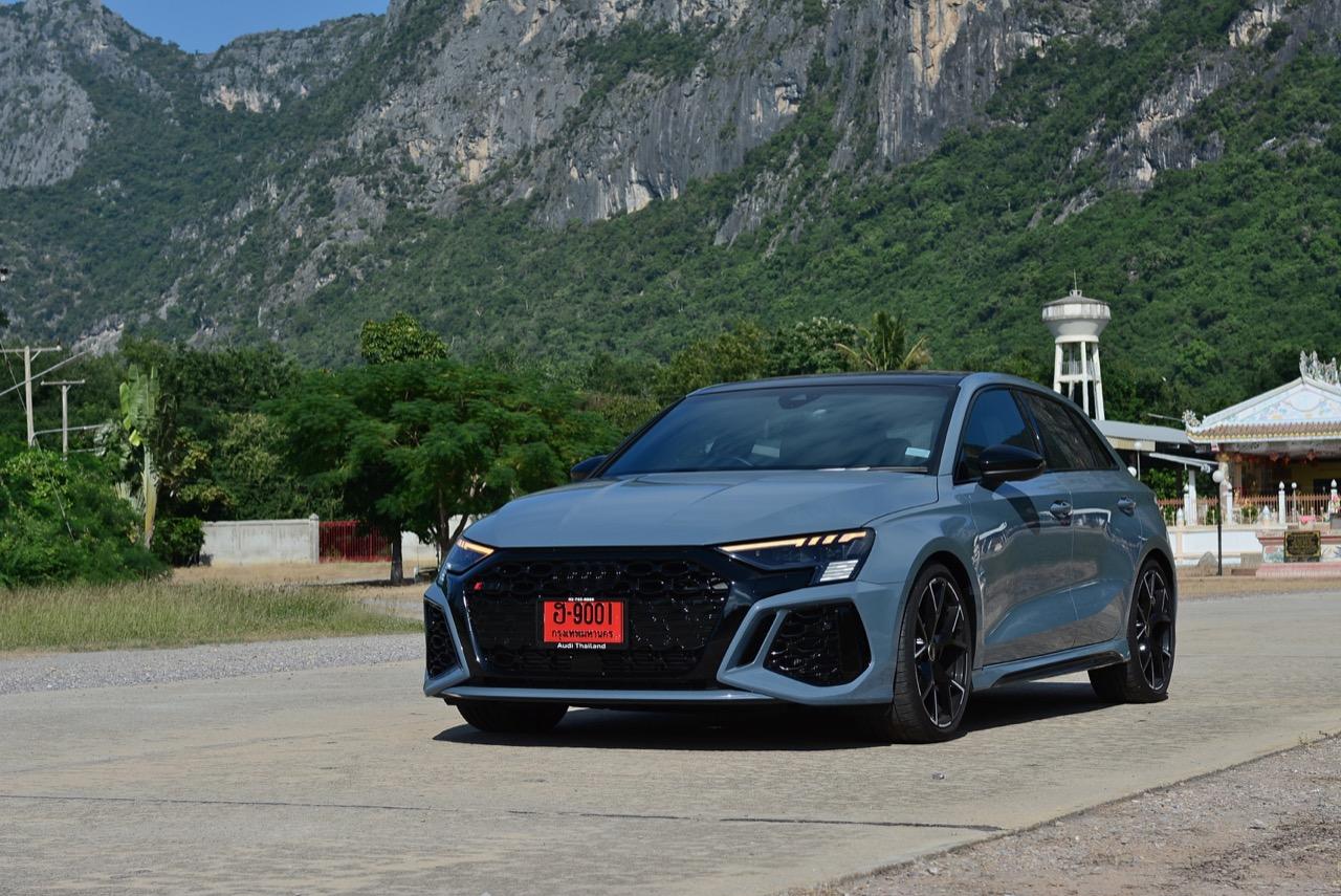 เมื่อใช้สมาธิจดจ่ออยู่กับการขับ เพื่อซึมซับการตอบสนองของแฮตช์แบ็กเด็กเล็ก Audi RS3 สีเทา Kemora gray metallic ทรงของรถแบบ 5 ประตูไซส์เล็ก บวกยางแก้มเตี้ย แสดงให้เห็นถึงความคล่องตัวในการขับขี่ ที่ดูเหมือนจะไร้การปรุงแต่ง แต่จริงๆ แล้วโคตรจะปรุงแต่ง ไม่ว่าจะเป็นเฟืองทดกำลัง ซอฟต์แวร์สั่งงาน เทอร์โบที่แลคน้อยมาก กับล้อและยางที่ถือว่าสำคัญไม่แพ้องคาพยบจุดอื่นๆ RS3 เป็นรถคันแรกของ Audi ที่ติดตั้งกลไก RS Torque Splitter ซึ่งเป็นชุดเฟืองกระจายแรงบิดในการขับเคลื่อนระหว่างล้อหลัง ในลักษณะที่แปรผันอย่างต่อเนื่อง เมื่อผสมผสานกับลูกระเบิดอย่างเครื่องยนต์ห้าสูบ 400 แรงม้า ทำให้รถสปอร์ตขนาดกะทัดรัดคันนี้ มีความคล่องตัวอย่างเหนือชั้น คุณสามารถกระชากร่างหนัก 1.6 ตัน ให้พุ่งทะยานได้อย่างใจนึก เครื่อง 2.5 TFSI ให้แรงบิด 500 นิวตันเมตร เท่ากับ BMW M340i X Drive แต่ M ปลอมรุ่นนี้ มีสูบมากกว่าหนึ่งตำแหน่ง แถมความจุก็ยังมากกว่า 500 ซีซี แรงบิดของ New RS3 ลำล่าสุด จัดมาหนักข้อมากกว่ารุ่นก่อนถึง 20 นิวตันเมตร แพ็กเกจปลดล็อกความเร็วสูงสุดสามารถทะยานไปได้ถึง 290 กม./ชม. (ออปชันเสริมที่ต้องจ่ายเพิ่ม) ซึ่งถือเป็นสถิติสูงสุดในเซ็กเมนต์แฮตช์แบ็ก ณ เวลานี้ การเร่งที่น่ากลัวของปิศาจสี่ห่วงคันจิ๋ว เกิดจากการประดังเทคโนโลยีในระบบขับเคลื่อน เพื่อสร้างรถที่เชื่อมโยงกับลัทธิ Quattro ได้อย่างสมบูรณ์แบบ