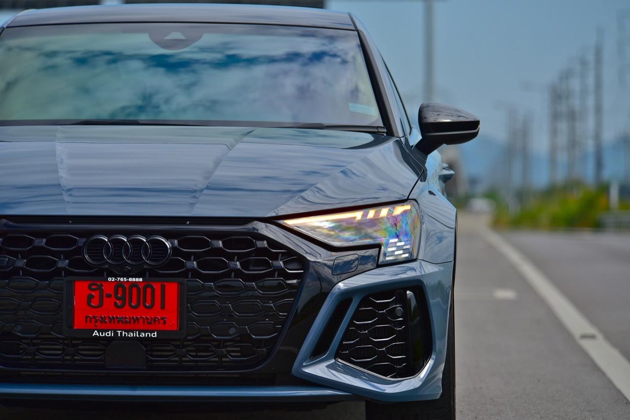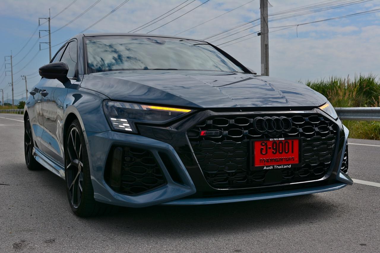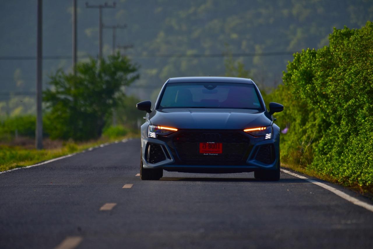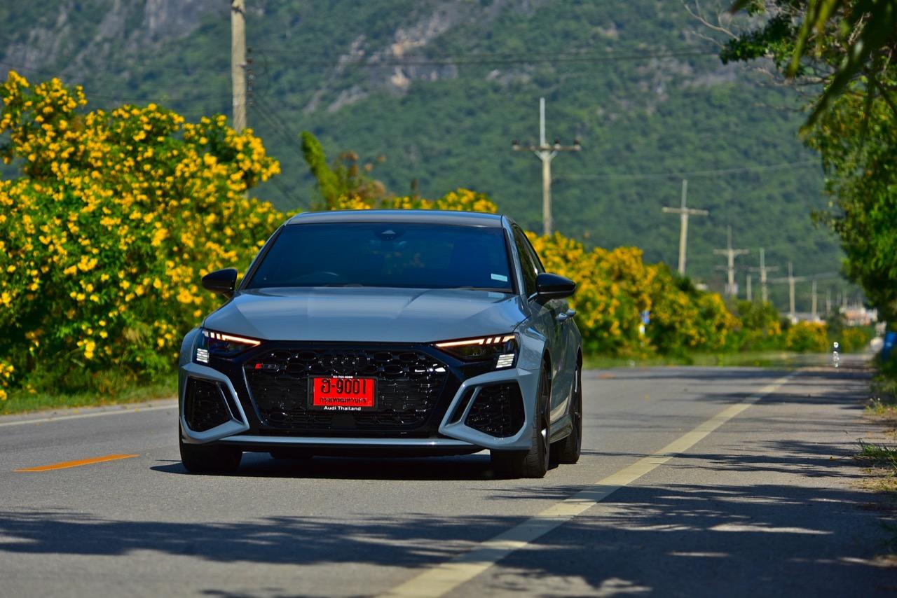 เมื่อใช้สมาธิจดจ่ออยู่กับการขับ เพื่อซึมซับการตอบสนองของแฮตช์แบ็กเด็กเล็ก Audi RS3 สีเทา Kemora gray metallic ทรงของรถแบบ 5 ประตูไซส์เล็ก บวกยางแก้มเตี้ย แสดงให้เห็นถึงความคล่องตัวในการขับขี่ ที่ดูเหมือนจะไร้การปรุงแต่ง แต่จริงๆ แล้วโคตรจะปรุงแต่ง ไม่ว่าจะเป็นเฟืองทดกำลัง ซอฟต์แวร์สั่งงาน เทอร์โบที่แลคน้อยมาก กับล้อและยางที่ถือว่าสำคัญไม่แพ้องคาพยบจุดอื่นๆ RS3 เป็นรถคันแรกของ Audi ที่ติดตั้งกลไก RS Torque Splitter ซึ่งเป็นชุดเฟืองกระจายแรงบิดในการขับเคลื่อนระหว่างล้อหลัง ในลักษณะที่แปรผันอย่างต่อเนื่อง เมื่อผสมผสานกับลูกระเบิดอย่างเครื่องยนต์ห้าสูบ 400 แรงม้า ทำให้รถสปอร์ตขนาดกะทัดรัดคันนี้ มีความคล่องตัวอย่างเหนือชั้น คุณสามารถกระชากร่างหนัก 1.6 ตัน ให้พุ่งทะยานได้อย่างใจนึก เครื่อง 2.5 TFSI ให้แรงบิด 500 นิวตันเมตร เท่ากับ BMW M340i X Drive แต่ M ปลอมรุ่นนี้ มีสูบมากกว่าหนึ่งตำแหน่ง แถมความจุก็ยังมากกว่า 500 ซีซี แรงบิดของ New RS3 ลำล่าสุด จัดมาหนักข้อมากกว่ารุ่นก่อนถึง 20 นิวตันเมตร แพ็กเกจปลดล็อกความเร็วสูงสุดสามารถทะยานไปได้ถึง 290 กม./ชม. (ออปชันเสริมที่ต้องจ่ายเพิ่ม) ซึ่งถือเป็นสถิติสูงสุดในเซ็กเมนต์แฮตช์แบ็ก ณ เวลานี้ การเร่งที่น่ากลัวของปิศาจสี่ห่วงคันจิ๋ว เกิดจากการประดังเทคโนโลยีในระบบขับเคลื่อน เพื่อสร้างรถที่เชื่อมโยงกับลัทธิ Quattro ได้อย่างสมบูรณ์แบบ