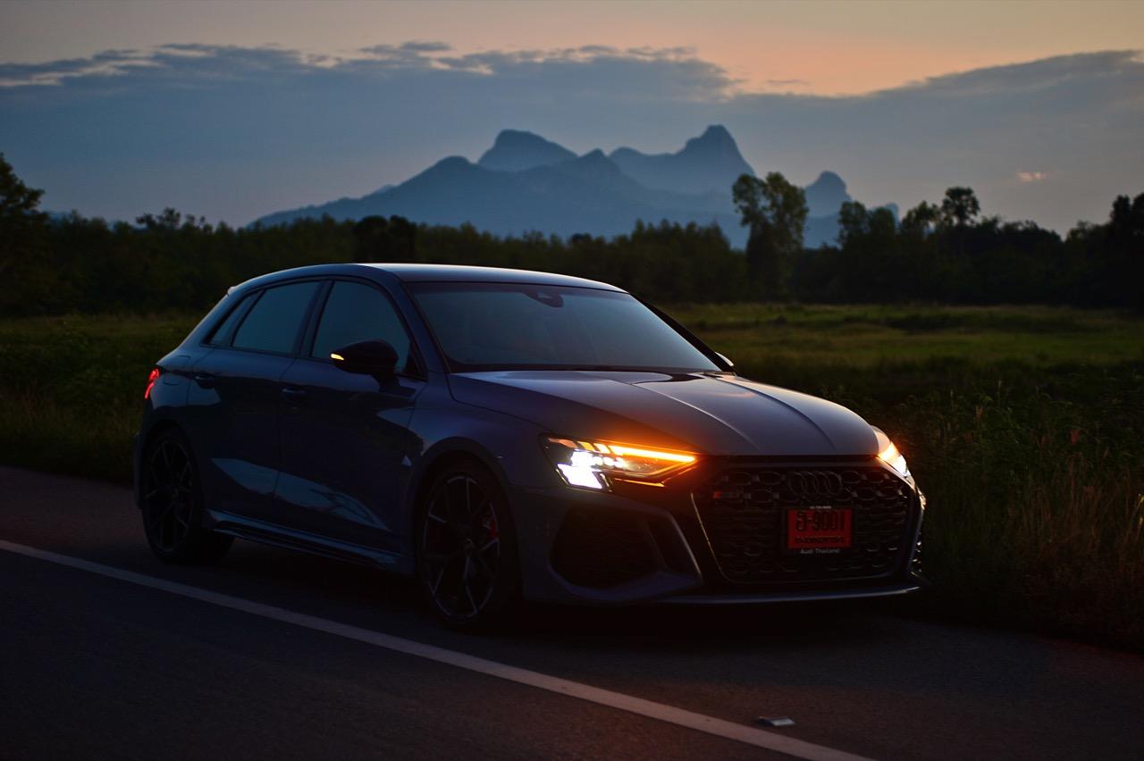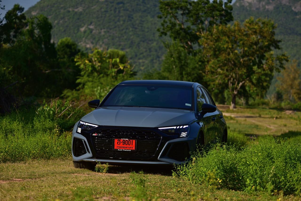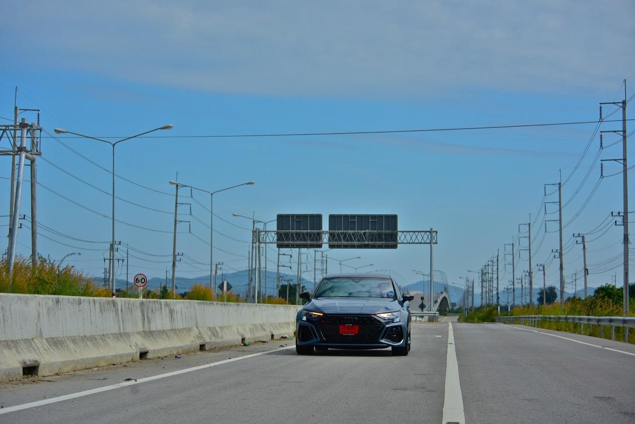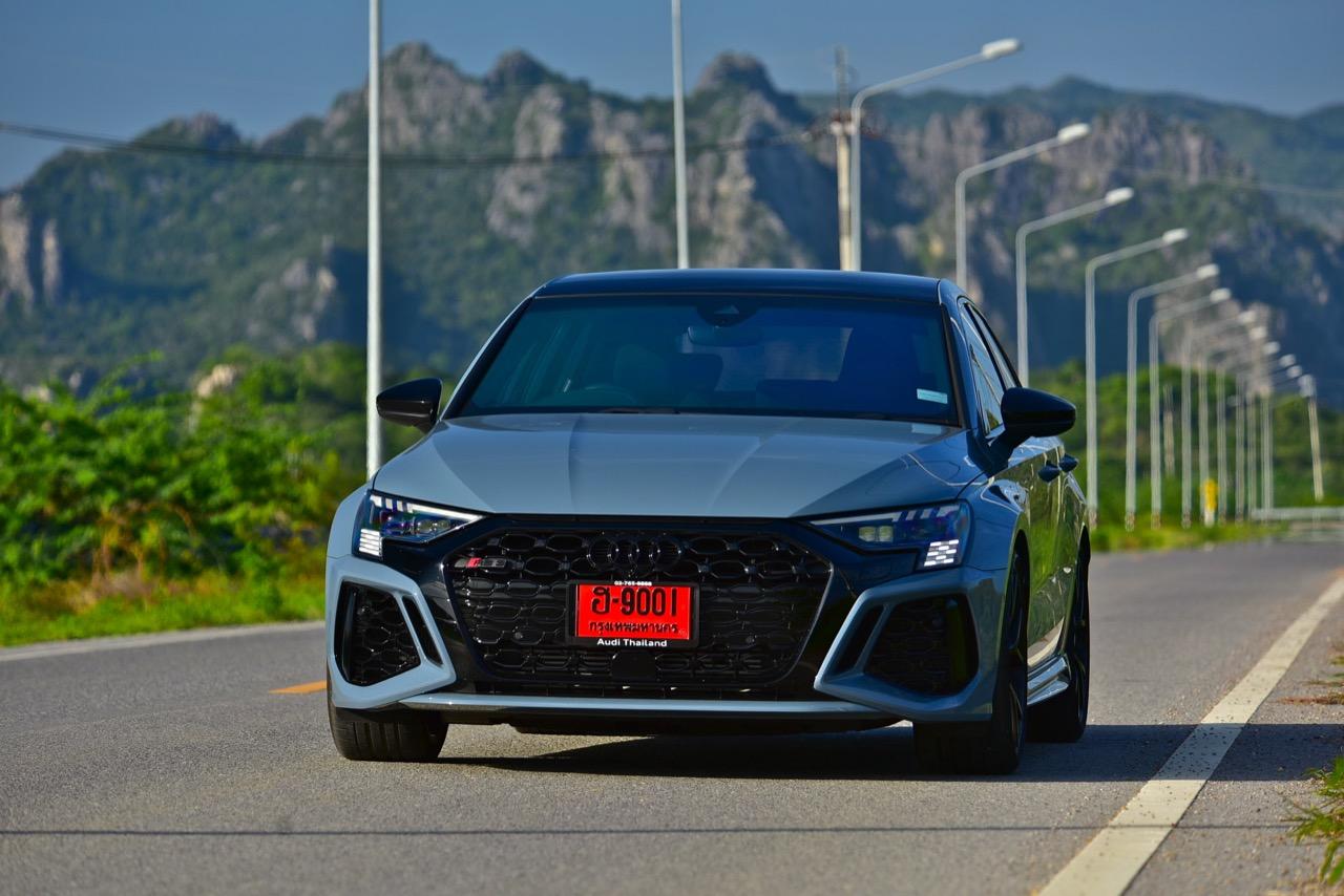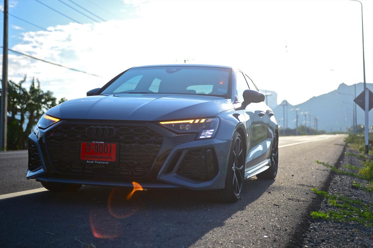 เมื่อใช้สมาธิจดจ่ออยู่กับการขับ เพื่อซึมซับการตอบสนองของแฮตช์แบ็กเด็กเล็ก Audi RS3 สีเทา Kemora gray metallic ทรงของรถแบบ 5 ประตูไซส์เล็ก บวกยางแก้มเตี้ย แสดงให้เห็นถึงความคล่องตัวในการขับขี่ ที่ดูเหมือนจะไร้การปรุงแต่ง แต่จริงๆ แล้วโคตรจะปรุงแต่ง ไม่ว่าจะเป็นเฟืองทดกำลัง ซอฟต์แวร์สั่งงาน เทอร์โบที่แลคน้อยมาก กับล้อและยางที่ถือว่าสำคัญไม่แพ้องคาพยบจุดอื่นๆ RS3 เป็นรถคันแรกของ Audi ที่ติดตั้งกลไก RS Torque Splitter ซึ่งเป็นชุดเฟืองกระจายแรงบิดในการขับเคลื่อนระหว่างล้อหลัง ในลักษณะที่แปรผันอย่างต่อเนื่อง เมื่อผสมผสานกับลูกระเบิดอย่างเครื่องยนต์ห้าสูบ 400 แรงม้า ทำให้รถสปอร์ตขนาดกะทัดรัดคันนี้ มีความคล่องตัวอย่างเหนือชั้น คุณสามารถกระชากร่างหนัก 1.6 ตัน ให้พุ่งทะยานได้อย่างใจนึก เครื่อง 2.5 TFSI ให้แรงบิด 500 นิวตันเมตร เท่ากับ BMW M340i X Drive แต่ M ปลอมรุ่นนี้ มีสูบมากกว่าหนึ่งตำแหน่ง แถมความจุก็ยังมากกว่า 500 ซีซี แรงบิดของ New RS3 ลำล่าสุด จัดมาหนักข้อมากกว่ารุ่นก่อนถึง 20 นิวตันเมตร แพ็กเกจปลดล็อกความเร็วสูงสุดสามารถทะยานไปได้ถึง 290 กม./ชม. (ออปชันเสริมที่ต้องจ่ายเพิ่ม) ซึ่งถือเป็นสถิติสูงสุดในเซ็กเมนต์แฮตช์แบ็ก ณ เวลานี้ การเร่งที่น่ากลัวของปิศาจสี่ห่วงคันจิ๋ว เกิดจากการประดังเทคโนโลยีในระบบขับเคลื่อน เพื่อสร้างรถที่เชื่อมโยงกับลัทธิ Quattro ได้อย่างสมบูรณ์แบบ