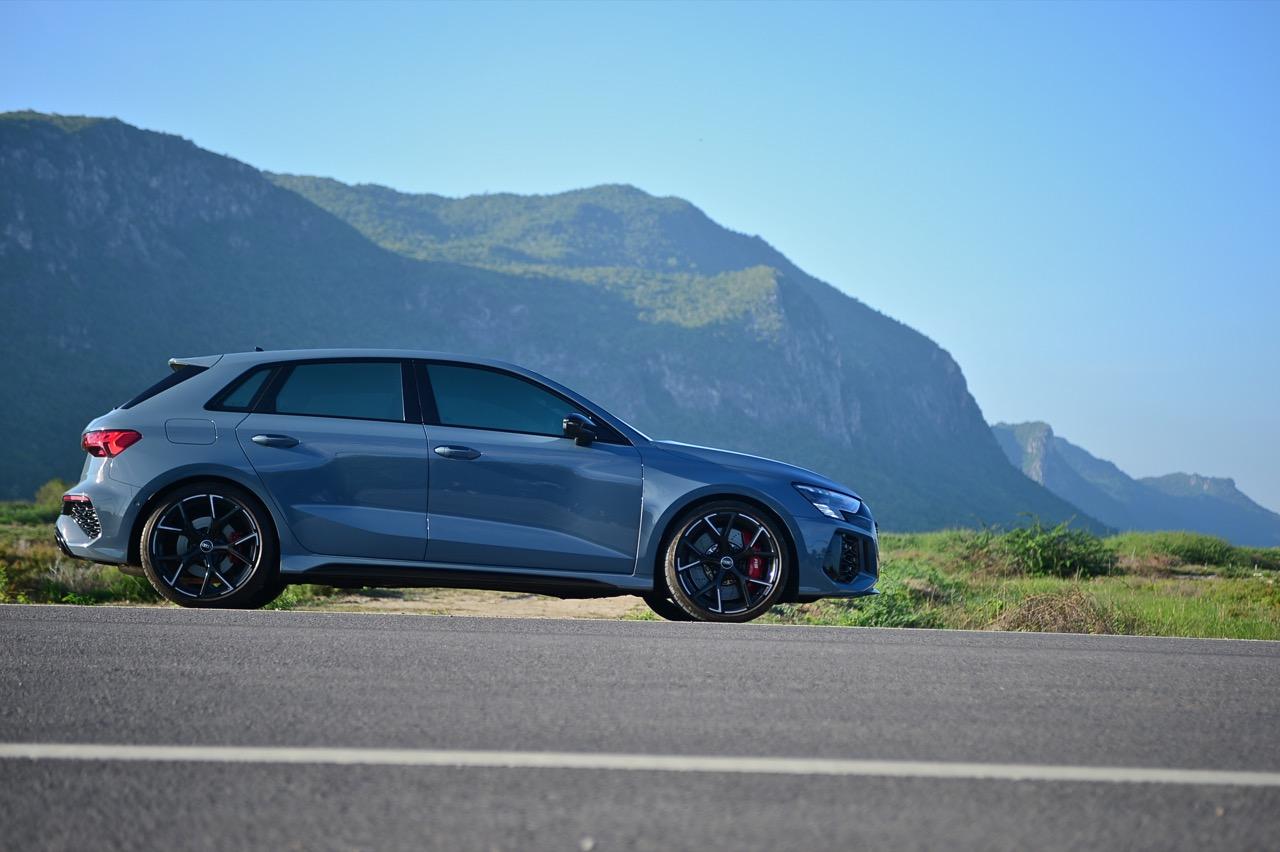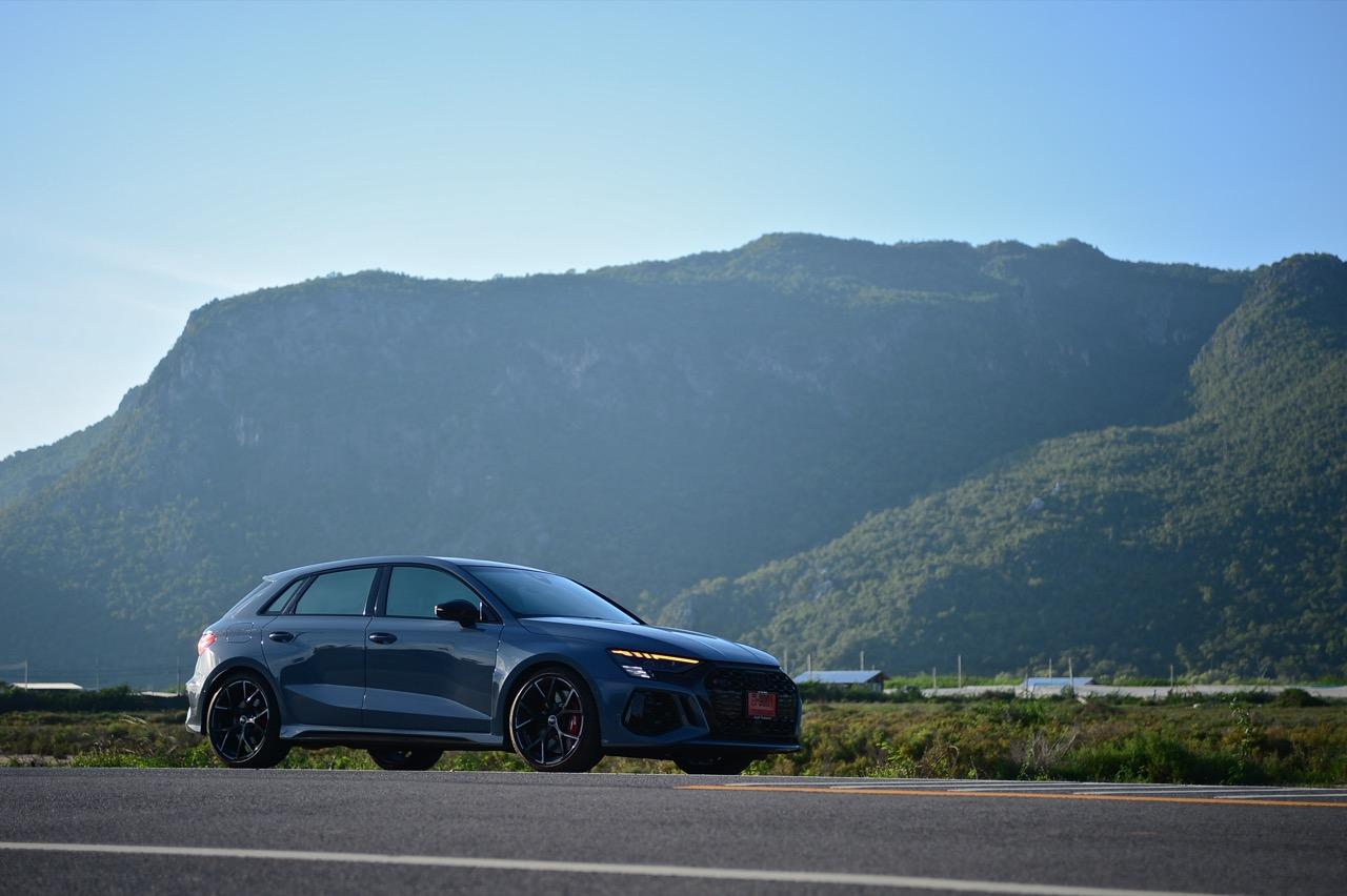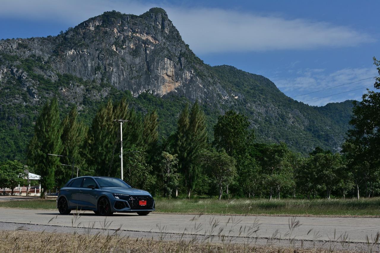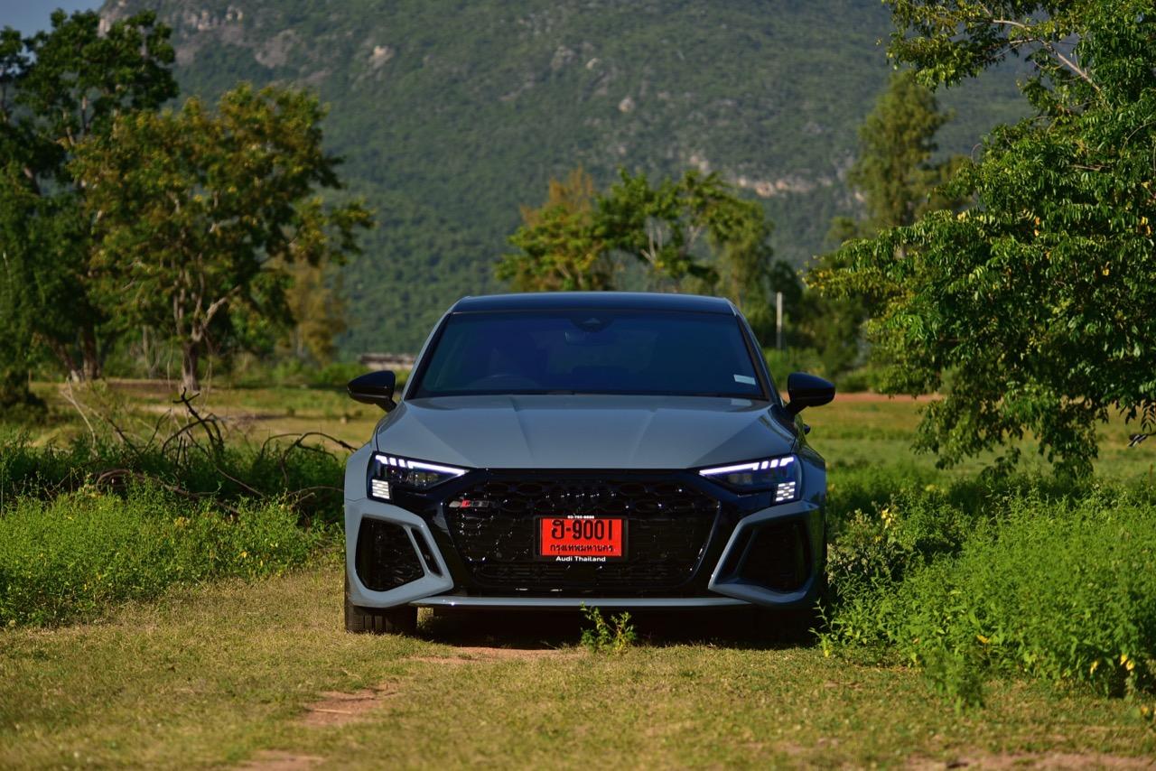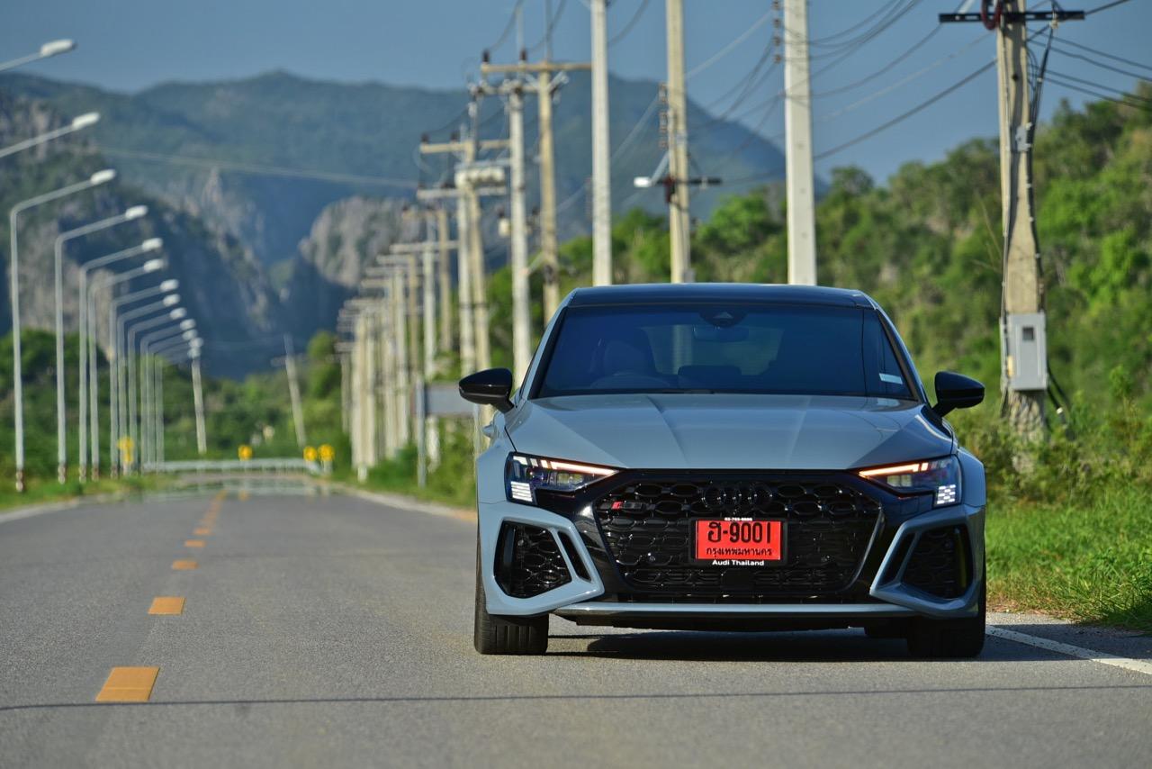เมื่อใช้สมาธิจดจ่ออยู่กับการขับ เพื่อซึมซับการตอบสนองของแฮตช์แบ็กเด็กเล็ก Audi RS3 สีเทา Kemora gray metallic ทรงของรถแบบ 5 ประตูไซส์เล็ก บวกยางแก้มเตี้ย แสดงให้เห็นถึงความคล่องตัวในการขับขี่ ที่ดูเหมือนจะไร้การปรุงแต่ง แต่จริงๆ แล้วโคตรจะปรุงแต่ง ไม่ว่าจะเป็นเฟืองทดกำลัง ซอฟต์แวร์สั่งงาน เทอร์โบที่แลคน้อยมาก กับล้อและยางที่ถือว่าสำคัญไม่แพ้องคาพยบจุดอื่นๆ RS3 เป็นรถคันแรกของ Audi ที่ติดตั้งกลไก RS Torque Splitter ซึ่งเป็นชุดเฟืองกระจายแรงบิดในการขับเคลื่อนระหว่างล้อหลัง ในลักษณะที่แปรผันอย่างต่อเนื่อง เมื่อผสมผสานกับลูกระเบิดอย่างเครื่องยนต์ห้าสูบ 400 แรงม้า ทำให้รถสปอร์ตขนาดกะทัดรัดคันนี้ มีความคล่องตัวอย่างเหนือชั้น คุณสามารถกระชากร่างหนัก 1.6 ตัน ให้พุ่งทะยานได้อย่างใจนึก เครื่อง 2.5 TFSI ให้แรงบิด 500 นิวตันเมตร เท่ากับ BMW M340i X Drive แต่ M ปลอมรุ่นนี้ มีสูบมากกว่าหนึ่งตำแหน่ง แถมความจุก็ยังมากกว่า 500 ซีซี แรงบิดของ New RS3 ลำล่าสุด จัดมาหนักข้อมากกว่ารุ่นก่อนถึง 20 นิวตันเมตร แพ็กเกจปลดล็อกความเร็วสูงสุดสามารถทะยานไปได้ถึง 290 กม./ชม. (ออปชันเสริมที่ต้องจ่ายเพิ่ม) ซึ่งถือเป็นสถิติสูงสุดในเซ็กเมนต์แฮตช์แบ็ก ณ เวลานี้ การเร่งที่น่ากลัวของปิศาจสี่ห่วงคันจิ๋ว เกิดจากการประดังเทคโนโลยีในระบบขับเคลื่อน เพื่อสร้างรถที่เชื่อมโยงกับลัทธิ Quattro ได้อย่างสมบูรณ์แบบ