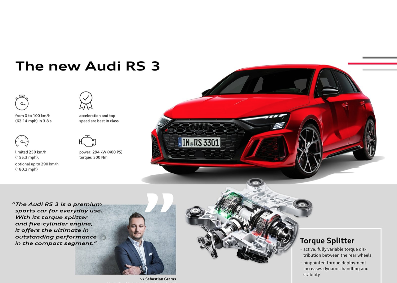 RS3 ให้ความรู้สึกประทับใจพอๆ กับความน่ากลัว จากความดุดันของเครื่องยนต์ 5 สูบในตำนาน ซึ่งมาพร้อมเสียงกระหึ่มเมื่อพุ่งทะยาน ด้วยรอบเครื่องยนต์ที่กวาดระห่ำอย่างบ้าคลั่ง ทุกระบบฝังอยู่ภายใต้การทำงานของซอฟต์แวร์รุ่นก้าวหน้า ปรับการตอบสนองและตอบโต้กับคำสั่งได้อย่างเบ็ดเสร็จ ความสามารถในการเปลี่ยนทิศทางที่สุดยอด ระบบช่วยทรงตัวและระบบกระจายแรงบิดจะแบ่งขั้นตอนการทำงาน ให้ความเป็นปัจเจกสำหรับทุกพื้นผิวถนน ขณะที่นักขับส่วนใหญ่ชอบค้นหาความสมบูรณ์แบบในรถยนต์สมรรถนะสูง แต่สิ่งที่ RS3 มอบให้นั้นส่วนใหญ่เป็นหน้าที่ของคนขับในการเลือกปรับแต่งโหมดขับเคลื่อนที่เหมาะสมกับความต้องการ เมื่อคุณทำได้ RS3 จะทำให้ประทับใจไม่รู้ลืม
