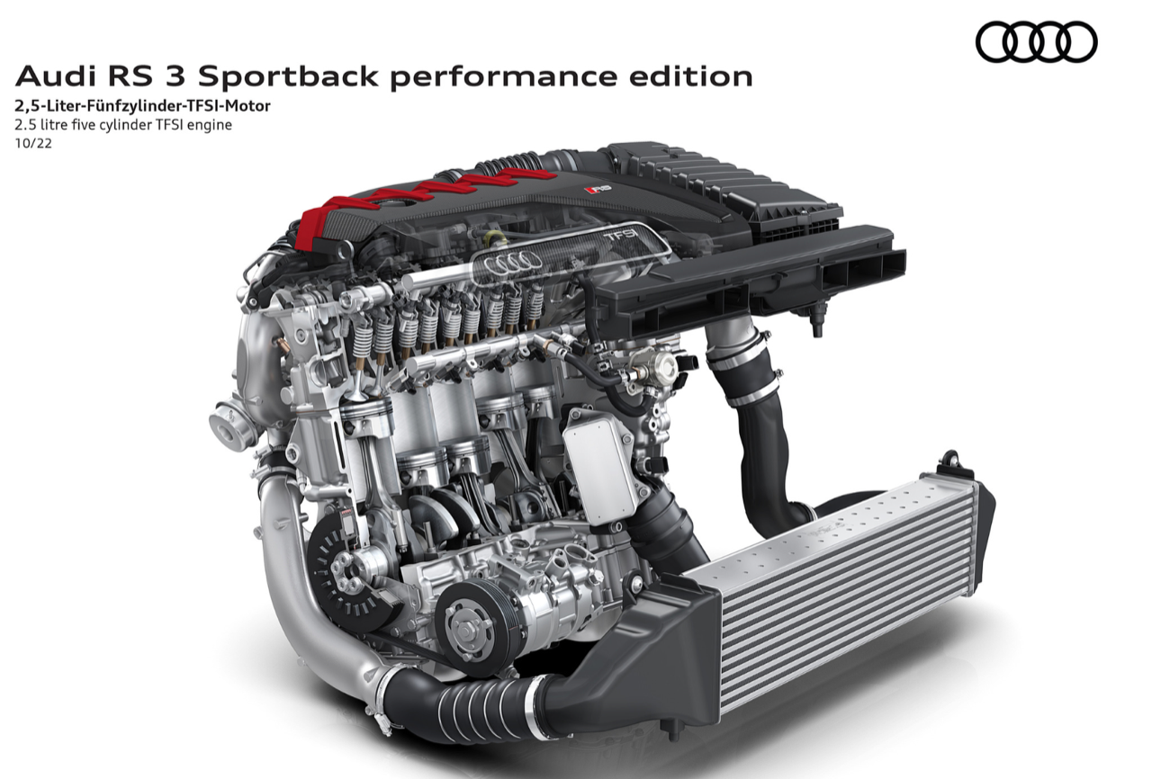 เวลาเดินมาจนถึงปี 2023 ประวัติศาสตร์ของเครื่องยนต์ห้าสูบ ยังคงดำเนินต่อไปอย่างเข้มข้น ใน Audi RS 3 Sedan และ RS 3 Sportback คันทดสอบที่ทั้งหล่อและแรงระเบิดระเบ้อ อีกครั้งที่กระบอกสูบทั้ง 5 ตำแหน่ง ให้ความเพลิดเพลินทางอารมณ์แทบจะไม่แตกต่างไปจาก Quattro S1 ในอดีต Audi Sport ปรับแต่งไดนามิกสำหรับการขับของ RS3 Sportback มีการเพิ่มแรงบิดของเครื่องยนต์ห้าสูบ 2.5 TFSI จาก 450 เป็น 500 นิวตันเมตร ซึ่งอยู่ระหว่าง 2,250 ถึง 5,600 รอบต่อนาที “ด้วยแรงบิดสูงสุด 500 นิวตันเมตร ซึ่งเริ่มต้นที่ความเร็วการหมุนในรอบต่ำ และเป็นเป้าหมายการพัฒนาที่ถูกระบุไว้ในเอกสาร” ฟุสเซลอธิบาย “นั่นคือสิ่งที่คนขับสามารถสัมผัสได้โดยตรง” เป็นเพราะ Audi RS 3 รุ่นใหม่ เร่งความเร็วจากช่วงรอบต่ำได้เร็วกว่าเดิม กำลังสูงสุดของเครื่องยนต์ที่ 294 กิโลวัตต์ (400 แรงม้า) ที่ 5,600 รอบต่อนาที และพุ่งไปถึง 7,000 รอบต่อนาที อย่างง่ายดาย
