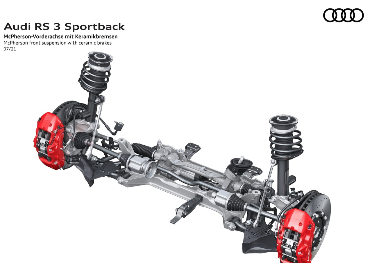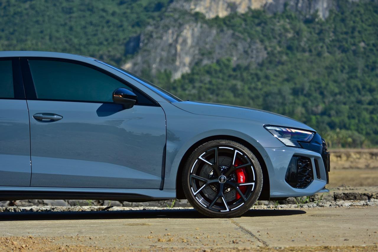 การติดตั้งสปริงและโช้คอัพมีความแข็งอย่างเห็นได้ชัด แต่ไม่ได้สร้างความรู้สึกกระด้างมากนัก ตัวถังต่ำเตี้ยมากกว่า Audi S3 ที่ผมเอาไปอัดยาวๆ 1,800 กิโลเมตรเมื่อเดือนก่อน ถึง 10 มิลลิเมตร และต่ำกว่า A3 มากถึง 25 มิลลิเมตร ช่วยลดจุดศูนย์ถ่วงของรถ ทำให้เกาะถนนมากขึ้น ด้านหน้าติดตั้งระบบกันสะเทือนแบบ McPherson strut พร้อมลูกปืนเดือยเฉพาะ RS 3 ปีกนกล่างที่แข็งขึ้น ซับเฟรม และเหล็กกันโคลง เพลาล้อหลังมีการออกแบบระบบโฟร์ลิงก์ พร้อมสปริง/โช้คอัพ ซับเฟรม และเหล็กกันโคลงแบบท่อที่ปรับให้เข้ากับตัวแยกแรงบิด ส่วนรองรับล้อเสริมจะเพิ่มไดนามิกด้านข้าง รวมถึงการตอบสนองต่ออินพุตของพวงมาลัย และความคล่องตัวของรถ เพื่อปรับปรุงการเข้าโค้ง ให้การยึดเกาะที่มากขึ้น Audi RS 3 มีมุมแคมเบอร์ลบที่เพลาหน้าไม่ถึงหนึ่งองศา เมื่อเทียบกับ A3 แคมเบอร์ล้อที่เพลาหลังเพิ่มขึ้นเกือบครึ่งองศา การปรับตั้งเพื่อทำให้ล้อเอียงไปทางพื้นผิวถนนที่เพิ่มขึ้น มุมที่มากขึ้นระหว่างระนาบล้อและแนวตั้ง ส่งผลให้การตอบสนองของพวงมาลัยแม่นยำขึ้นอีกด้วย