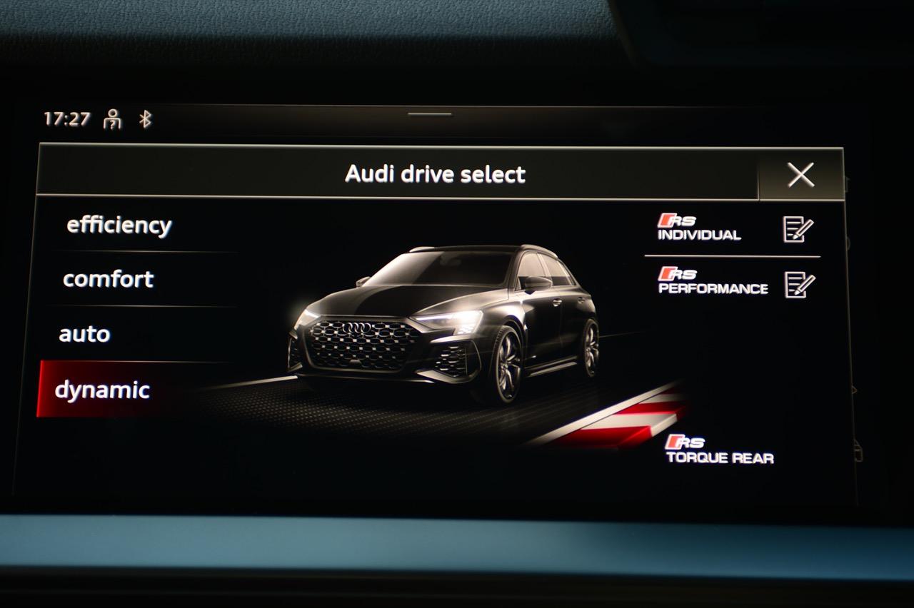 Audi RS3 กับโหมดขับเคลื่อน Drive Select มีการตั้งค่าที่แตกต่างกันเจ็ดแบบ (Auto / Comfort / Dynamic / efficiency / RS individual / RS performance / RS torque rear ส่วนโหมดแยกย่อย 'RS Individual ช่วยให้สามารถปรับระบบขับเคลื่อนได้สามระดับ ระบบกันสะเทือนไฟฟ้าแบบปรับตั้งได้ โดยที่ Comfort คือการตั้งค่าประสิทธิภาพของระบบรองรับที่แตกต่างจากความสบาย! การบังคับเลี้ยว เสียงเครื่องยนต์ และเกณฑ์การแทรกแซงของระบบควบคุมเสถียรภาพ แม้ว่า RS3 จะนำเสนอการปรับแต่งส่วนบุคคล หรือ RS individual แต่การปรับจูนอย่างล้วงลึกและละเอียดดูจะยุ่งยากพอสมควร คุณสามารถตั้งค่าโหมด individual ที่เกี่ยวข้องกับการตอบสนองตามความชอบส่วนตัวได้ เมื่อกดปุ่ม 'RS' ที่ด้านขวามือของพวงมาลัยสองครั้ง เพื่อเข้าถึงฟังก์ชันดังกล่าว (กดครั้งแรก ระบบจะเข้าสู่โหมด RS performance) หลังจากนั้นก็ซิ่งได้เร็วตามที่ต้องการ