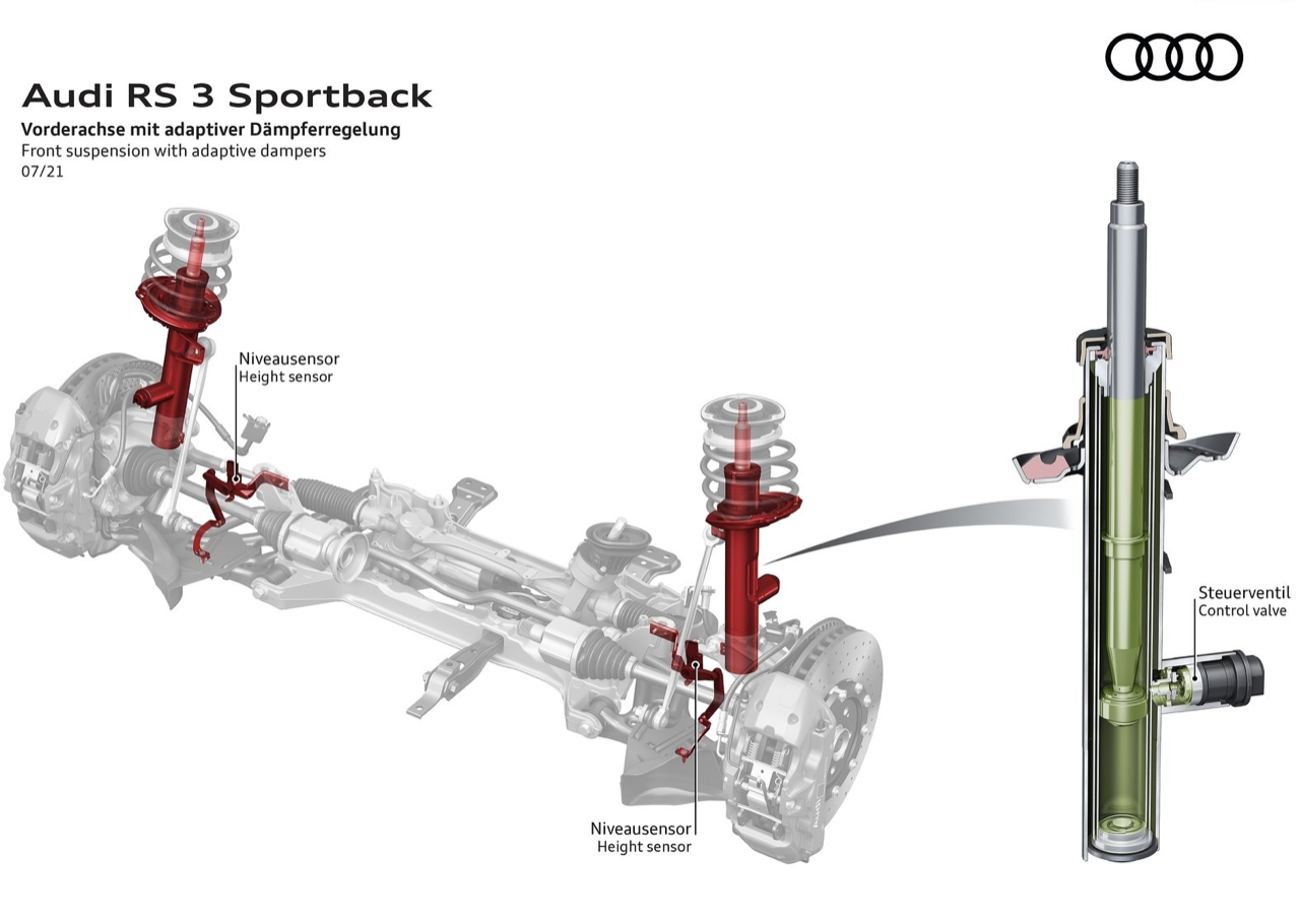 ระบบกันสะเทือนแบบ RS Sport โช้คอัพที่พัฒนาขึ้นใหม่และระบบวาล์วในกระบอกโช้คที่มีเฉพาะสำหรับ RS3 วาล์วช่วยให้แน่ใจว่าโช้คอัพแสดงการตอบสนองที่ละเอียดอ่อนเป็นพิเศษ โดยเป็นส่วนหนึ่งของคุณลักษณะการเด้งกลับและบีบอัด ช่วยให้ระบบกันสะเทือนตอบสนองต่อสถานการณ์การขับขี่ได้เร็วและมีประสิทธิภาพ ระบบกันสะเทือนแบบ RS พร้อมระบบควบคุมโช้คอัพแบบปรับได้ จะปรับการทำงานของโช้คอัพแต่ละตัวอย่างต่อเนื่องและแยกจากกัน ขึ้นอยู่กับสภาพถนน สถานการณ์การขับ และโหมดที่เลือก มีลักษณะการทำงานเฉพาะทางของโช้คอัพที่รับแรงกระแทกได้อย่างชัดเจนในทุกโหมด แรงหน่วงที่เหมาะสม จะถูกคำนวณภายในมิลลิวินาที ในการทำเช่นนี้ เซนเซอร์จะวัดความเร่งในแนวดิ่ง และการเคลื่อนที่ของล้อแต่ละล้อที่สัมพันธ์กัน โช้คอัพพร้อมระบบปรับการทำงานอัตโนมัติ ส่งผลให้เกิดไดนามิกที่เพิ่มขึ้นและความเสถียรในการขับขี่ที่ยอดเยี่ยม RS3 ยังมีความสบายมากพอเมื่อเลือกติดตั้งระบบกันสะเทือนแบบสปอร์ต ในโหมด RS Individual โช้คอัพสามารถกำหนดค่าได้ตามความต้องการส่วนบุคคลและสภาพถนนภายในโค้งสามลักษณะ ในโหมด RS Performance มีการตั้งค่าเฉพาะสำหรับโช้คอัพ ช่วยลดแรงกระแทกในแนวดิ่ง ให้การรองรับที่เหมาะสม สำหรับสนามแข่งที่มีพื้นผิวไม่เรียบ เช่น สนาม Nordschleife