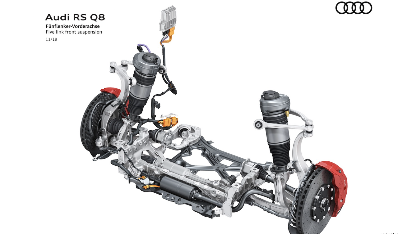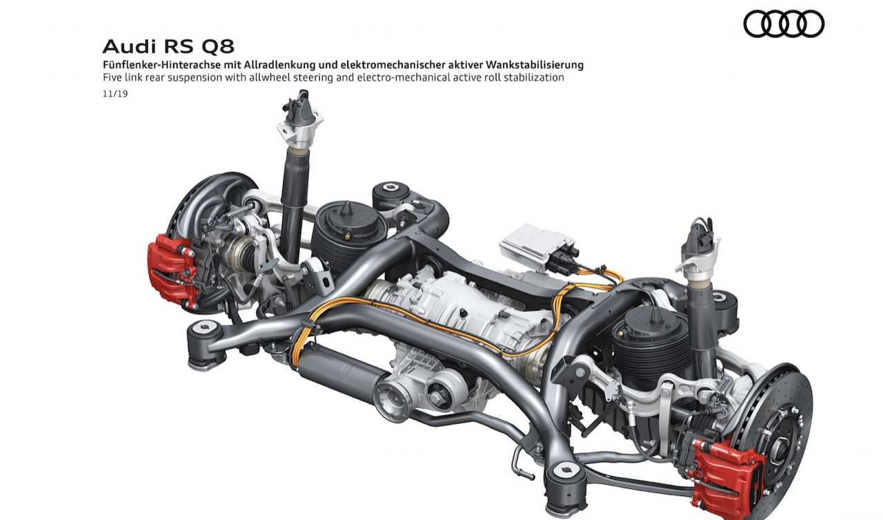 ระบบส่งกำลังไปยังล้อทั้งสี่โดยใช้ระบบขับเคลื่อนอัตโนมัติ 8 สปีด ไปจนถึงระบบขับเคลื่อนสี่ล้อ Quattro ที่ส่งแรงบิดไปยังล้อหลังได้ถึง 80% การขับปกติ Quattro จะปรับแรงบิดหน้า 40% และหลัง 60% เพื่อความเสถียร ในกรณีที่เกิดการลื่นไถล ระบบ Quattro AWD สามารถถ่ายโอนแรงบิดไปยังล้อหน้าได้สูงสุดถึง 70 เปอร์เซ็นต์ หรือเทไปยังล้อหลังได้สูงสุดถึง 85 เปอร์เซ็นต์ การติดตั้งเฟืองท้าย active torque vectoring limited slip differential เพื่อเฉลี่ยแรงบิดและสร้างความสมดุล ทำให้รถเกาะกับโค้งราวกับตีนตุ๊กแกยักษ์ Audi Sport ปรับเปลี่ยนระบบกันสะเทือนใหม่ ทำงานบนแทร็กที่กว้างขึ้น (ด้านหน้า 10 มม. และด้านหลัง 5 มม.) อัตราแดมเปอร์ถุงลมที่ปรับปรุงสำหรับระบบกันสะเทือนถุงลมแบบปรับได้ แม้ว่าความกว้างของยาง 295 มม. จะเท่ากันโดยไม่คำนึงถึงเส้นผ่านศูนย์กลางล้อก็ตาม ระบบบังคับเลี้ยวแบบสี่ล้อ สามารถหมุนล้อหลังได้สูงสุด 5 องศา ในทิศทางตรงกันข้ามกับล้อหน้า ในย่านความเร็วต่ำ และ 1.5 องศา ในทิศทางเดียวกัน ที่ความเร็วมากกว่า 60 กิโลเมตรต่อชั่วโมง ระบบบังคับเลี้ยวแบบสี่ล้อกลายเป็นตัวกำหนดมาตรฐานใหม่ของรถเอสยูวี Quattro ที่แสดงความสามารถในการควบคุมแรงบิดของเพลาหน้าอย่างรวดเร็ว เพื่อลดอาการอันเดอร์สเตียร์หรือหน้าดื้อโค้ง ช่วยให้ RS Q8 มีความคล่องตัวที่ไม่น่าจะเป็นไปได้ สำหรับรถเอสยูวีที่มีขนาดและน้ำหนักมากกว่ารถทั่วไป (ยกเว้นรถเอสยูวีไฟฟ้าที่หนักกว่านี้เยอะ)
