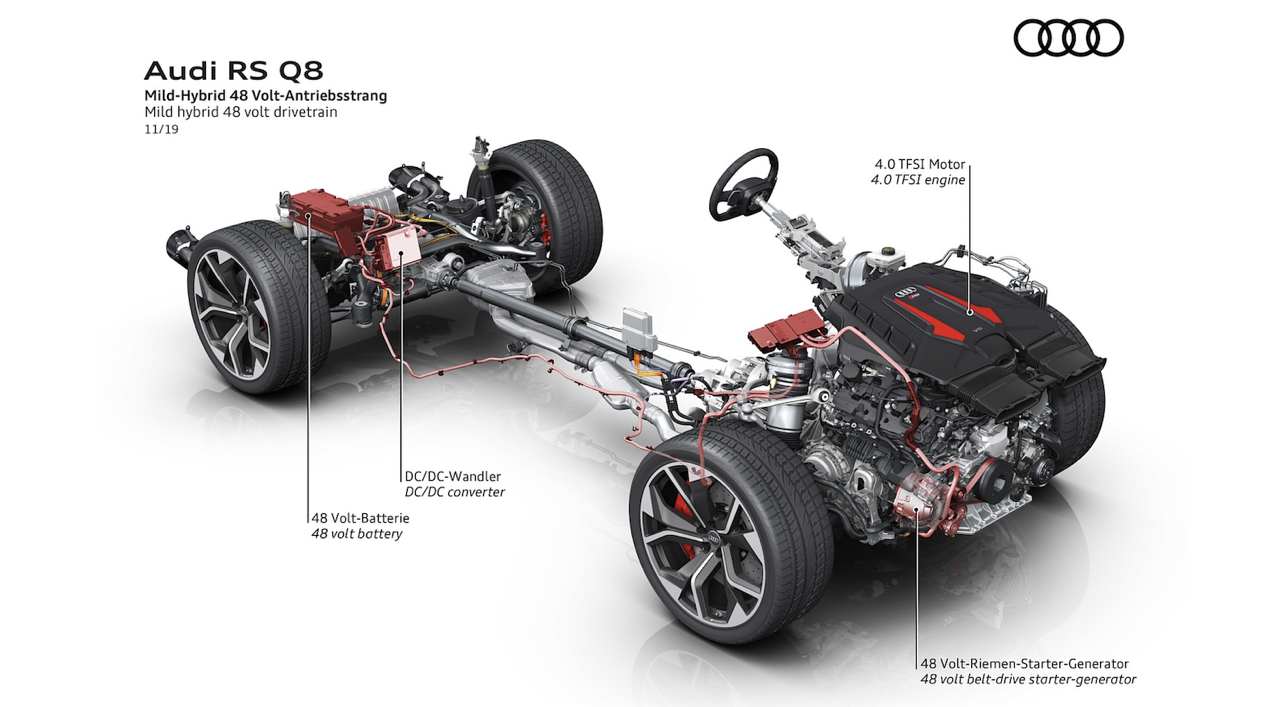 เทคโนโลยีระบบไฮบริด 48 โวลต์ เชื่อมต่อกับระบบหยุดการทำงานของกระบอกสูบสี่ตำแหน่งเพื่อลดการใช้เชื้อเพลิง COD (cylinder on demand) ระบบนี้จะตัดต่อการทำงานอย่างราบเรียบ ไม่มีอาการสะดุดหรือกระตุก เครื่องยนต์ V8 ทำงานบนกระบอกสูบบางส่วนหรือทั้งหมด จากความพยายามในการปรับแต่งเครื่องยนต์ เพื่อลดอัตราสิ้นเปลืองและลดมลพิษ สายพานสตาร์ตมอเตอร์อัลเทอร์เนเตอร์อยู่ระหว่างตำแหน่ง V ของเครื่องยนต์ เชื่อมต่อกับเพลาข้อเหวี่ยง เมื่อเหยียบเบรก ระบบจะกู้คืนพลังงานได้สูงสุดถึง 12 กิโลวัตต์ และป้อนอิเล็กตรอนไปยังชุดแบตเตอรี่ลิเทียมไอออนขนาดเล็ก เมื่อยกคันเร่ง COD ช่วยให้ RS Q8 สามารถ "เคลื่อนตัวแบบไหลไปได้เรื่อยๆ" โดยไม่ต้องสิ้นเปลืองน้ำมันสักหยดระหว่าง 60 ถึง 140 กิโลเมตรต่อชั่วโมง นาน 40 วินาที ในขณะที่คุณยกเท้าออกจากแป้นคันเร่ง ส่งผลให้มีอัตราสิ้นเปลืองน้ำมันเชื้อเพลิง 6.7 กิโลเมตรต่อลิตร ในด้านประสิทธิภาพ การควบคุมของ RS Q8 ถือเป็นคุณลักษณะที่น่าประทับใจ เพื่อทำให้รถเอสยูวีคันโตวิ่งได้อย่างมั่นคงด้วยระบบขับเคลื่อนสี่ล้อ Quattro เฟืองท้ายอิเล็กทรอนิกส์ พร้อมระบบ torque-vectoring rear differential, ช่วงล่างถุงลมปรับ 5 ระดับความสูง-ต่ำ Adaptive air suspension, ระบบช่วยเลี้ยว all-wheel steering, ชุดกันโคลงแอ็กทีฟ active anti-roll bars และล้อลาย Y สีเงินสลับดำ ขนาด 23 นิ้ว ยางสปอร์ต 295/35ZR23 XL บอกตามตรงว่าการขับไม่ให้ล้อเกิดริ้วรอยบนถนนในประเทศไทยนั้นยากมาก