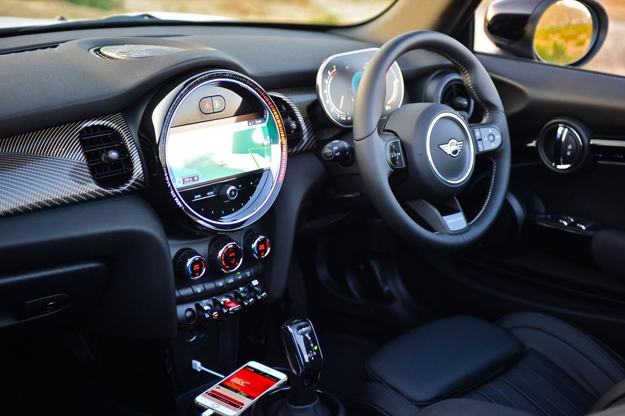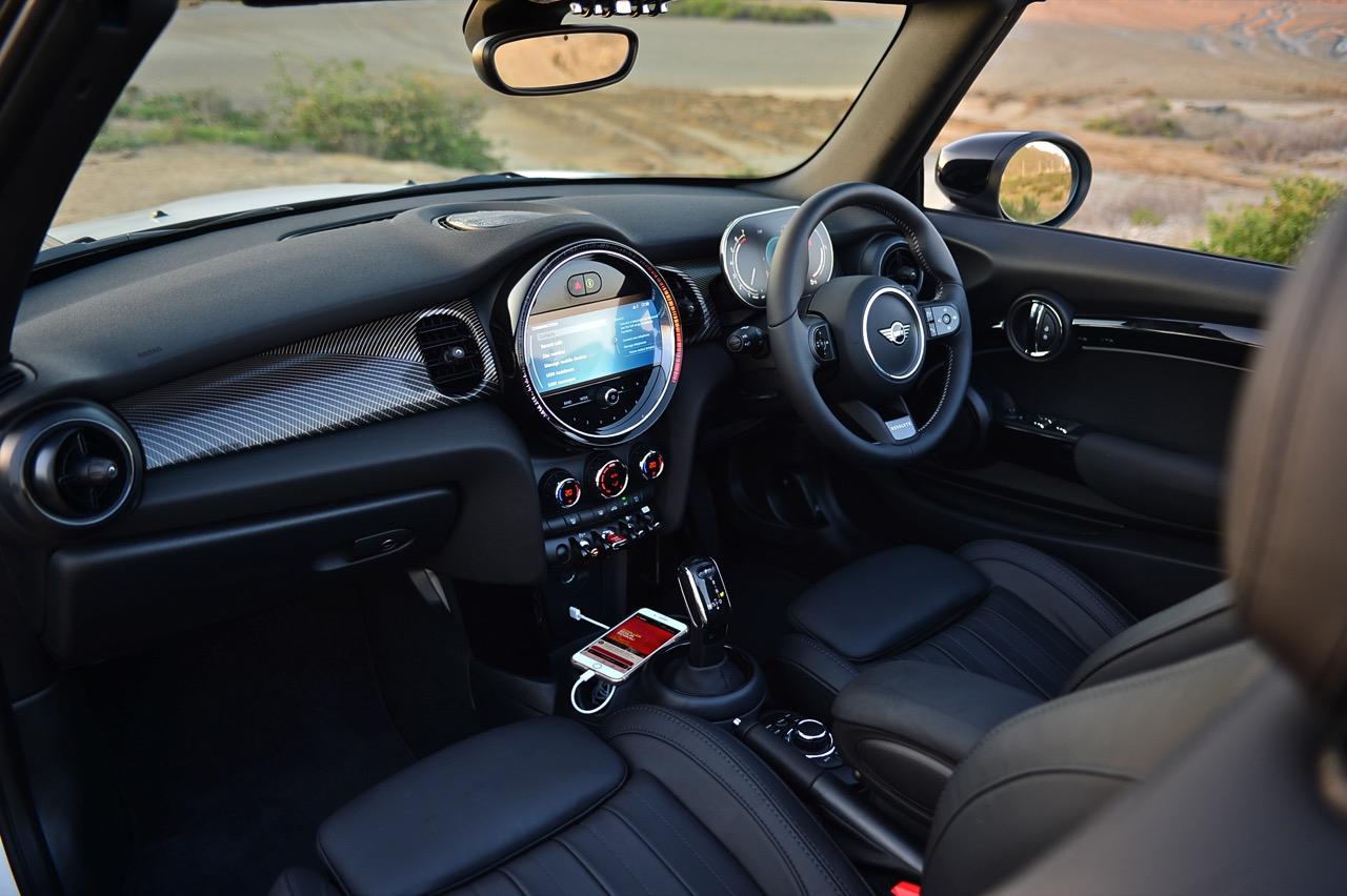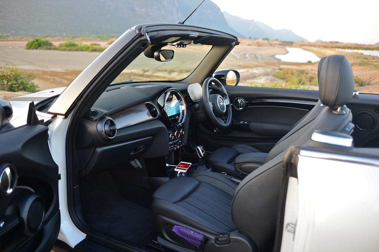 รูปแบบใหม่ งานตกแต่งภายในของ MINI ใน Cooper S รุ่นเปิดประทุน Convertible เน้นความทันสมัย มาพร้อมหน้าจอแสดงผลใหม่ ฟังก์ชันการใช้งานในระบบอินโฟเทนเมนต์ใหม่หมด คอนเซปต์การสั่งงานแบบใหม่ จุดที่ทำได้ดีก็คือ ความกว้างที่เพิ่มขึ้นมอบพื้นที่ใช้สอยส่วนหน้าที่ทำให้ไม่รู้สึกอึดอัดแม้ตัวถังจะมีขนาดเล็ก เบาะนั่งทั้งสี่ตำแหน่ง ที่นั่งด้านหน้าปรับตำแหน่งได้ครอบคลุมทุกสรีระของผู้ขับ และเพิ่มพื้นที่เบาะโดยสารด้านหลังมากกว่าเดิมถึง 23 มิลลิเมตร แม้ขนาดตัวถังจะเล็กแต่ภายในที่ถูกขยับขยายพื้นที่ใช้สอยช่วยสร้างความรู้สึกโปร่งโล่งให้ผู้โดยสารตอนหน้า ส่วนเบาะหลัง แม้จะปรับพื้นที่ใหม่แต่ยังเล็กเกินไปสำหรับการนั่งโดยสาร เบาะหลังพับแยกได้แบบ 60:40 สำหรับช่องเก็บสัมภาระที่กระโปรงหลังเพิ่มความจุ 51 ลิตร รวมเป็น 211 ลิตร เพิ่มพื้นที่เพื่อรองรับการบรรทุกสัมภาระ หัวใจสำคัญของการออกแบบใหม่ล่าสุดก็คือ หน้าจอแสดงผล ที่จัดฟังก์ชันการใช้งานใหม่หมด รวมถึงกราฟิกแสดงผลก็ปรับใหม่ทั้งหมด บนแผงหน้าปัดบริเวณแกนพวงมาลัย ด้วยหน้าปัด TFT ขนาด 5.5 นิ้ว ที่ถูกใช้เป็นครั้งแรกใน Cooper SE เป็นจอภาพมาตรวัดแสดงผลความเร็วอัตราเร่ง รอบเครื่องยนต์ มาตรวัดปริมาณน้ำมันเชื้อเพลิง ตัวเลขความเร็วแบบดิจิทัลที่อ่านค่าได้ง่ายจากความคมชัด