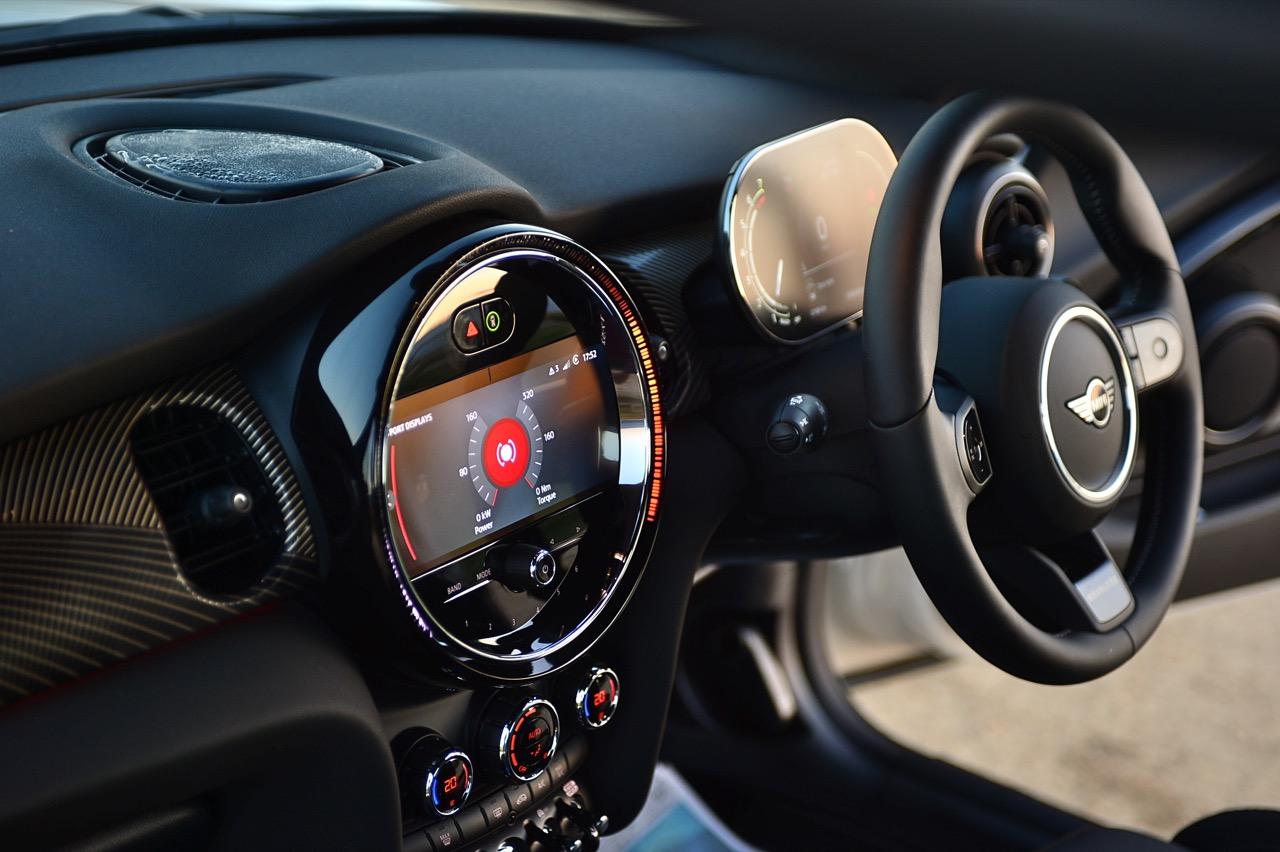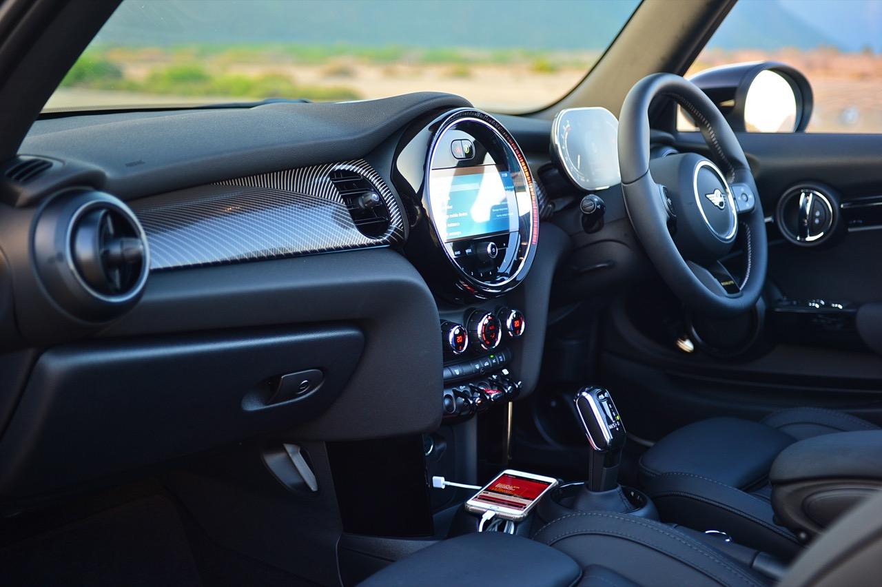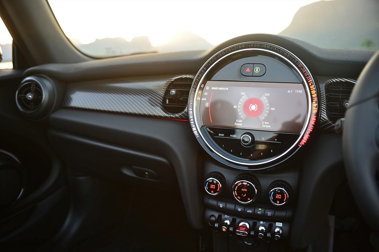 รูปแบบใหม่ งานตกแต่งภายในของ MINI ใน Cooper S รุ่นเปิดประทุน Convertible เน้นความทันสมัย มาพร้อมหน้าจอแสดงผลใหม่ ฟังก์ชันการใช้งานในระบบอินโฟเทนเมนต์ใหม่หมด คอนเซปต์การสั่งงานแบบใหม่ จุดที่ทำได้ดีก็คือ ความกว้างที่เพิ่มขึ้นมอบพื้นที่ใช้สอยส่วนหน้าที่ทำให้ไม่รู้สึกอึดอัดแม้ตัวถังจะมีขนาดเล็ก เบาะนั่งทั้งสี่ตำแหน่ง ที่นั่งด้านหน้าปรับตำแหน่งได้ครอบคลุมทุกสรีระของผู้ขับ และเพิ่มพื้นที่เบาะโดยสารด้านหลังมากกว่าเดิมถึง 23 มิลลิเมตร แม้ขนาดตัวถังจะเล็กแต่ภายในที่ถูกขยับขยายพื้นที่ใช้สอยช่วยสร้างความรู้สึกโปร่งโล่งให้ผู้โดยสารตอนหน้า ส่วนเบาะหลัง แม้จะปรับพื้นที่ใหม่แต่ยังเล็กเกินไปสำหรับการนั่งโดยสาร เบาะหลังพับแยกได้แบบ 60:40 สำหรับช่องเก็บสัมภาระที่กระโปรงหลังเพิ่มความจุ 51 ลิตร รวมเป็น 211 ลิตร เพิ่มพื้นที่เพื่อรองรับการบรรทุกสัมภาระ หัวใจสำคัญของการออกแบบใหม่ล่าสุดก็คือ หน้าจอแสดงผล ที่จัดฟังก์ชันการใช้งานใหม่หมด รวมถึงกราฟิกแสดงผลก็ปรับใหม่ทั้งหมด บนแผงหน้าปัดบริเวณแกนพวงมาลัย ด้วยหน้าปัด TFT ขนาด 5.5 นิ้ว ที่ถูกใช้เป็นครั้งแรกใน Cooper SE เป็นจอภาพมาตรวัดแสดงผลความเร็วอัตราเร่ง รอบเครื่องยนต์ มาตรวัดปริมาณน้ำมันเชื้อเพลิง ตัวเลขความเร็วแบบดิจิทัลที่อ่านค่าได้ง่ายจากความคมชัด