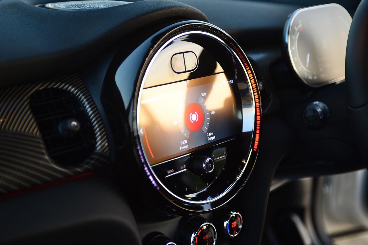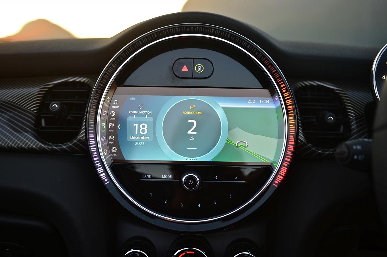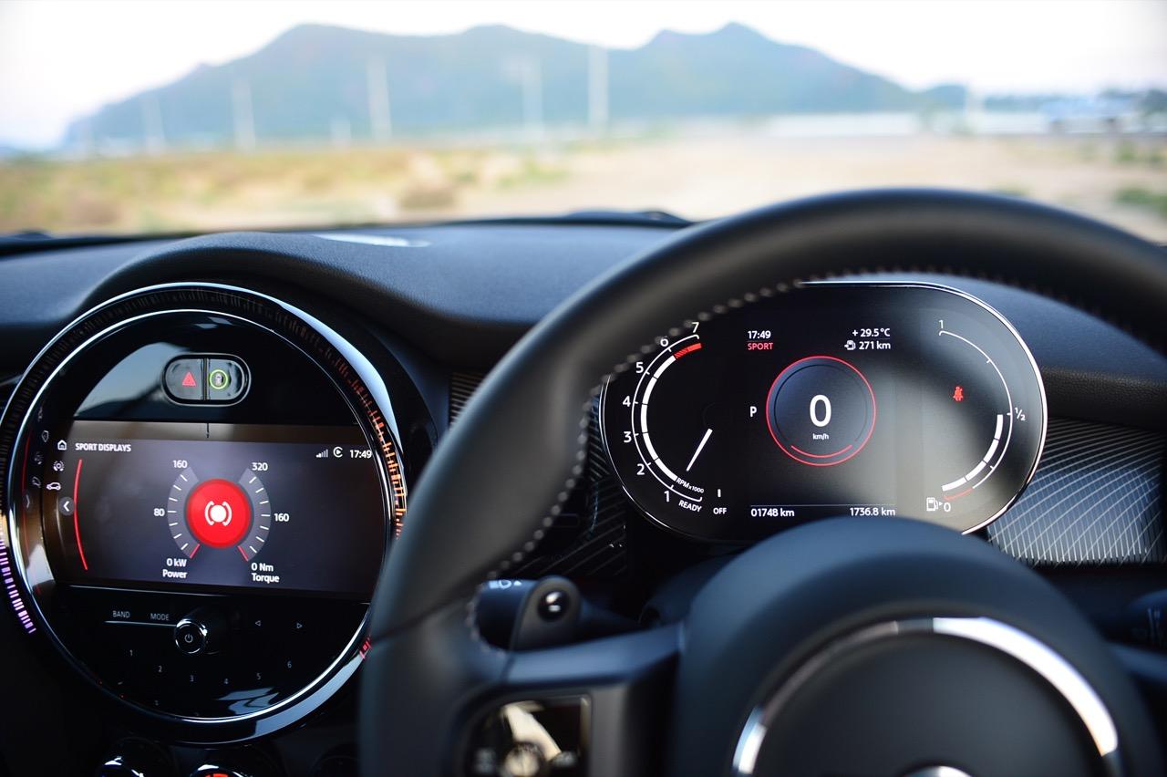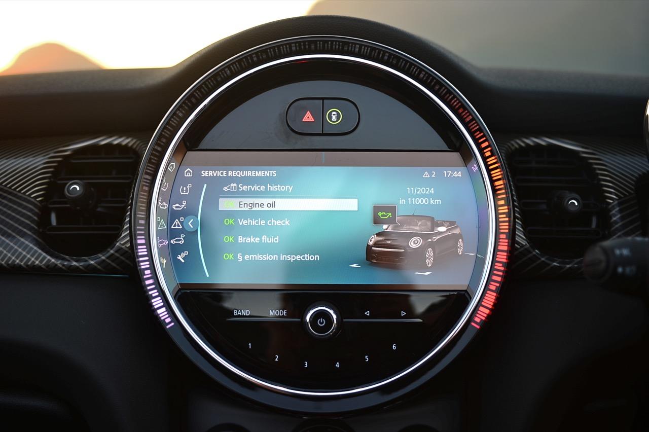 มาตรวัดความเร็วและวัดรอบแบบใหม่ อ่านค่าได้ง่าย การปรับปรุงในตำแหน่งของช่องบอกปริมาณเชื้อเพลิงมีความชัดเจนมากกว่าเดิม จอแสดงผลกลาง สั่งงานด้วยการควบคุมผ่านแป้น controller หรือใช้นิ้วแตะที่หน้าจอเพื่อสั่งงานในระบบสัมผัส หน้าจอล้อมกรอบด้วยหลอด LED ในรูปแบบที่ถูกเติมเต็มด้วยสีสันเร้าใจ จอแสดงผลกลางพร้อมด้วยกราฟิกแบบใหม่ ใช้แสงจากหลอด LED ทำหน้าที่บอกสถานะการทำงานของเครื่องยนต์และการปรับตั้งต่างๆ ด้วยสัญลักษณ์แสงสีต่างๆ จอภาพตรงกลางยังเป็นมอนิเตอร์ของกล้องมองหลัง พร้อมเซนเซอร์ที่ใช้ในการกะระยะถอยหลัง คอยส่งสัญญาณเสียงแจ้งเตือนคนขับเมื่อถอยเข้าใกล้กับวัตถุกีดขวาง สำหรับหน้าจอแสดงผลส่วนกลางที่เป็นเอกลักษณ์ของ MINI ยังได้รับการออกแบบให้เจ้าของรถสามารถเลือกการแสดงผลในฟังก์ชันต่างๆ ได้อย่างหลากหลาย เป็นของเล่นที่ออกแบบให้ใช้งานได้ง่ายๆ โดย MINI Cooper S Convertible มาพร้อมหน้าจอสีสั่งงานด้วยระบบสัมผัสขนาด 8.8 นิ้ว แสดงผลที่เกี่ยวกับฟังก์ชันกับสภาวะการปรับตั้งระบบต่างๆ ของรถ สาระความบันเทิง และการเชื่อมต่อ MINI Connected สำหรับฟังก์ชันดังกล่าวมีระบบควบคุม MINI Touch Controller ที่ทำงานโดยใช้ระบบสัมผัสปลายนิ้วลงไปบนแป้นควบคุม เพื่อให้ผู้ขับขี่สามารถป้อนข้อมูลได้จากการเขียนด้วยนิ้วมือลงบนปุ่ม Controller ได้โดยตรง ในตำแหน่งของ MINI Touch Controller กราฟิกของฟังก์ชันต่างๆ เมื่อเข้าสู่เมนูหลักและเมนูแยกย่อยถูกปรับเปลี่ยนรูปแบบการแสดงผลใหม่ทั้งหมด