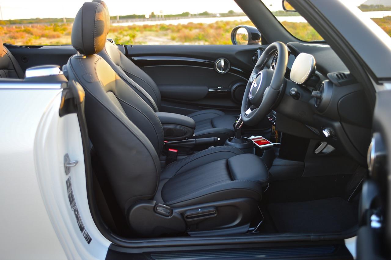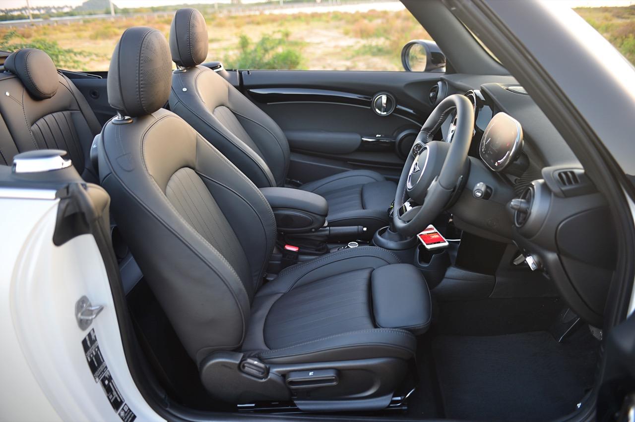 MINI Cooper S Convertible Resolute edition มีเบาะหนังแท้สีดำ ตัวเบาะรองด้วยวัสดุที่ให้ความนุ่ม นิ่มนวล น่านั่ง เบาะสามารถปรับให้ท่านั่งขับต่ำเตี้ยติดพื้นแบบสปอร์ต เบาะคนนั่งและคนขับยังคงใช้การปรับเบาะด้วยมือล้วนๆ ผ่านกลไกการปรับเบาะสำหรับการเลื่อนเดินหน้า ถอยหลัง หรือยกขึ้นลงออกมาในแนวดิบๆ ส่วนพวงมาลัยแบบใหม่นั้นปรับได้สี่ทิศทาง ตำแหน่งของการนั่งใน MINI Cooper S Convertible LCI พอดิบพอดีสำหรับคนที่มีรูปร่างปกติ เบาะแบบสปอร์ตหุ้มหนังแท้ออกแบบให้โอบรัดแผ่นหลัง ทำให้รู้สึกถึงความกระชับยามนั่ง การออกแบบใหม่ในบางจุดโดยยังคงการจัดวางแบบเดิม ทำให้ห้องโดยสารของ Cooper S Convertible กว้างขึ้นเล็กน้อย ทรงของตัวรถที่สั้นและมีฐานล้อไม่ยาวเกินไป ทำให้ความรู้สึกไม่ว่าจะขับช้าหรือขับเร็ว ล้วนแล้วแต่ตอบสนองออกมาในแนวคล่องตัวว่องไว เหมาะกับการซอกแซกไปบนถนนสายเล็กๆ ในเมือง