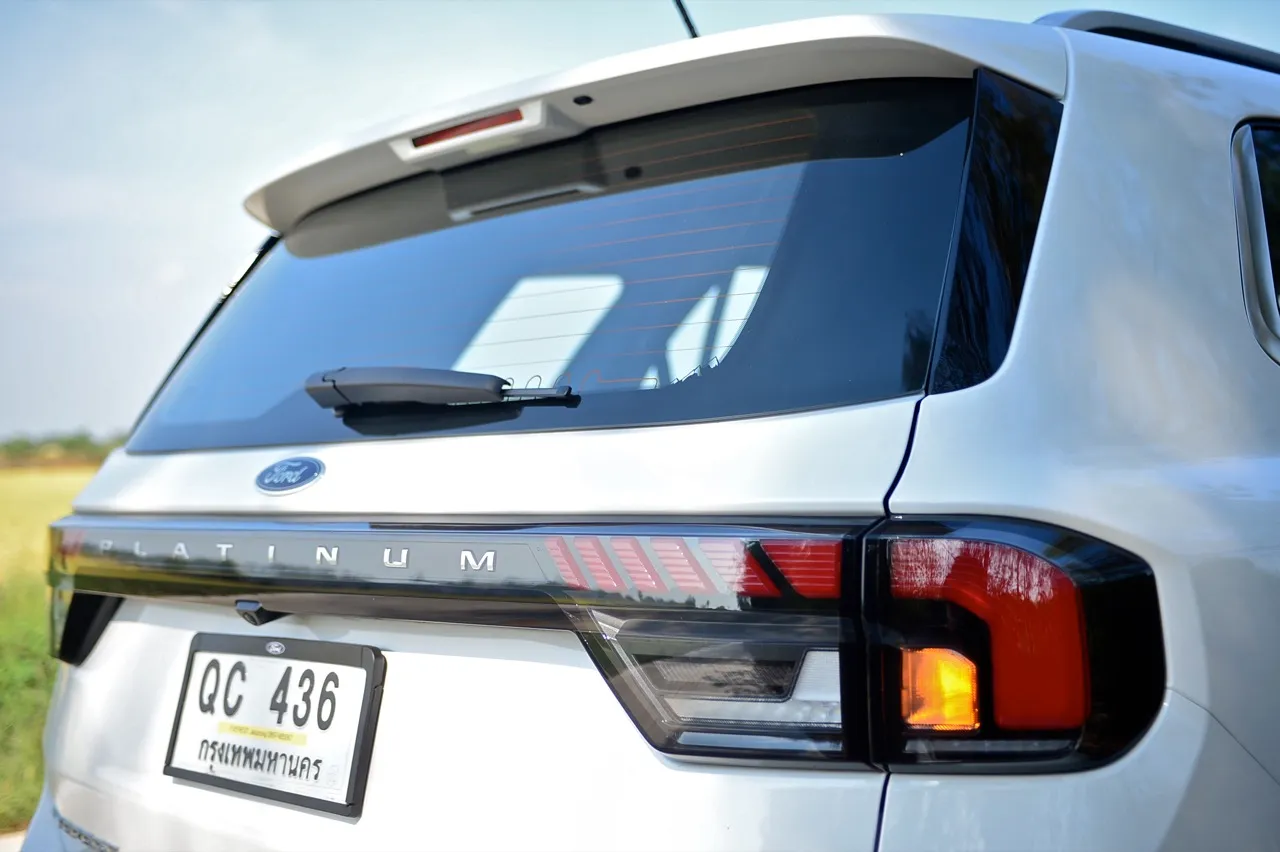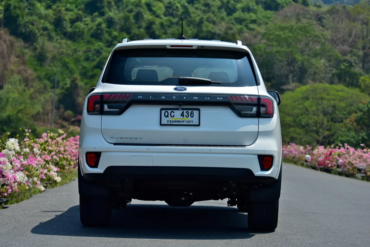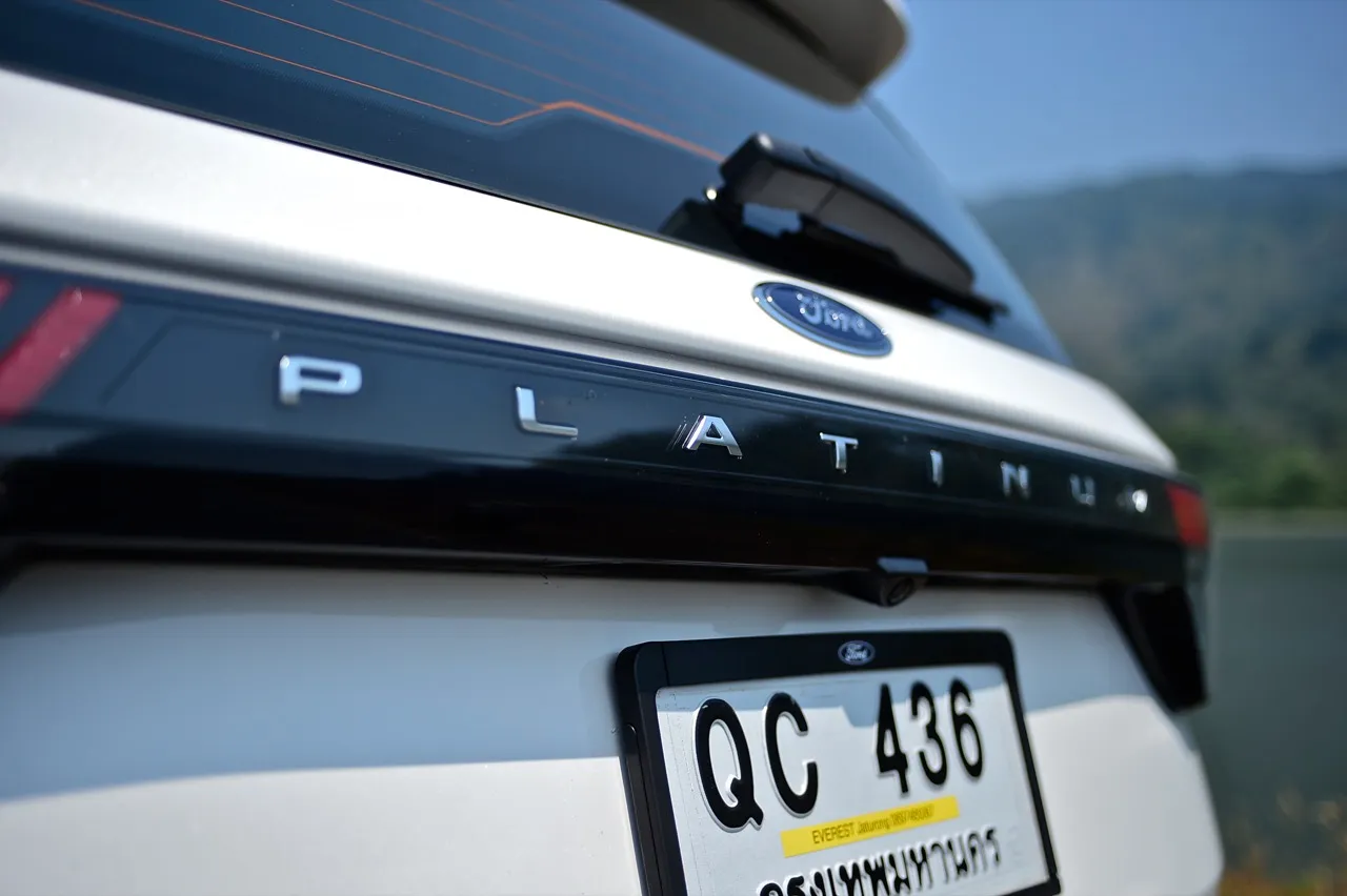 ฝาท้ายขนาดใหญ่ เปิดออกได้กว้างขวางพร้อมกลไกเปิด-ปิดฝาท้ายไฟฟ้า ไฟท้ายเชื่อมต่อกันทั้งซ้ายและขวาด้วยชิ้นงานพลาสติกสีดำกับตัวอักษร Platinum ไฟท้ายทรงยาวหลอด LED เข้ากับสัดส่วนบั้นท้ายจากการออกแบบ เชื่อมโยงมุมมองส่วนท้ายให้มีความลงตัว ไฟท้ายของ Everest Platinum V6 รุ่นใหม่ใช้หลอดไฟแบบผสม ซึ่งมีทั้งหลอดไฟท้ายแบบ LED และหลอดไฟแบบธรรมดาอยู่ภายใน ขอบด้านบนของกันชนหลัง มีพลาสติกกันกระแทกสีดำคอยป้องกันริ้วรอย เมื่อต้องยกสัมภาระเข้าออกจากห้องเก็บของส่วนท้าย กันชนหลังมีการดีไซน์แบบสองชิ้นเหมือนกันกับกันชนหน้า พร้อมพลาสติกกันกระแทกสีดำ และแผ่นพลาสติกสะท้อนแสงมัลติรีเฟกเตอร์สำหรับความปลอดภัยเมื่อจอดรถในที่มืด กล้องมองหลังติดมาให้พร้อมติดตั้งเซนเซอร์ถอยหลังแจ้งเตือนด้วยสัญญาณเสียงเมื่อถอยเข้าไปใกล้กับวัตถุกีดขวาง ด้านบนของฝาท้ายบริเวณกึ่งกลางกระจกบานฝาท้ายเป็นที่อยู่ของไฟเบรกดวงที่ 3 ซึ่งติดตั้งเอาไว้ในตำแหน่งที่สูง เพื่อทำให้รถคันหลังมองเห็นไฟเบรกอย่างชัดเจน