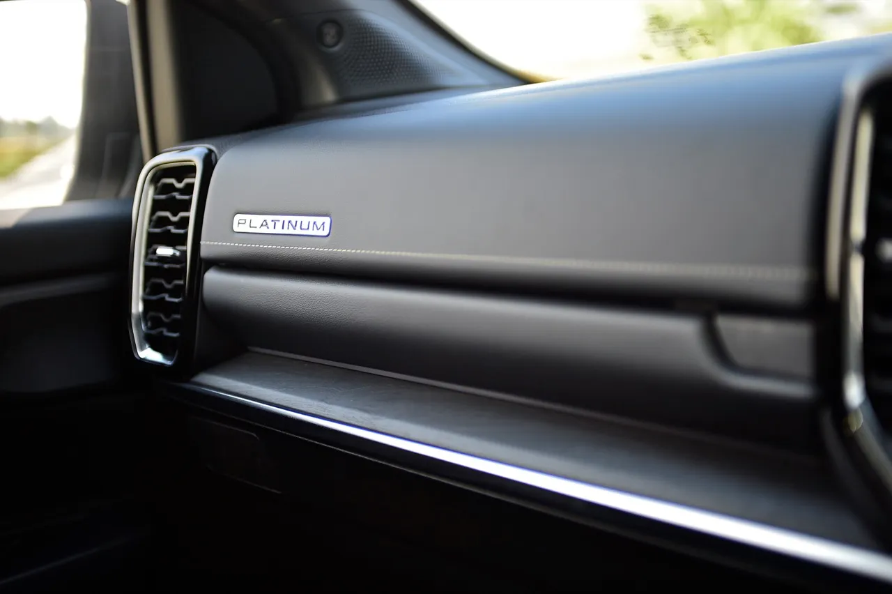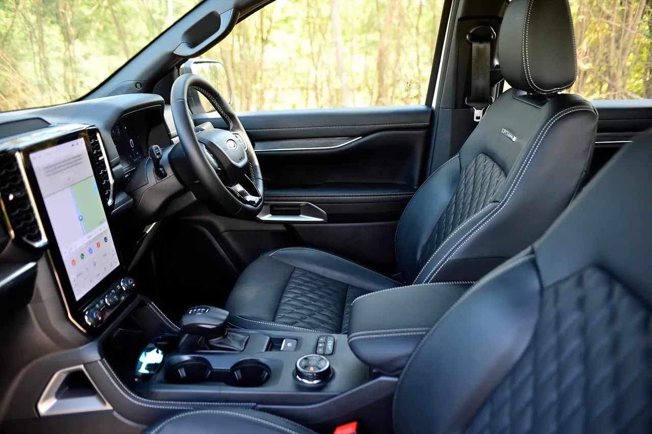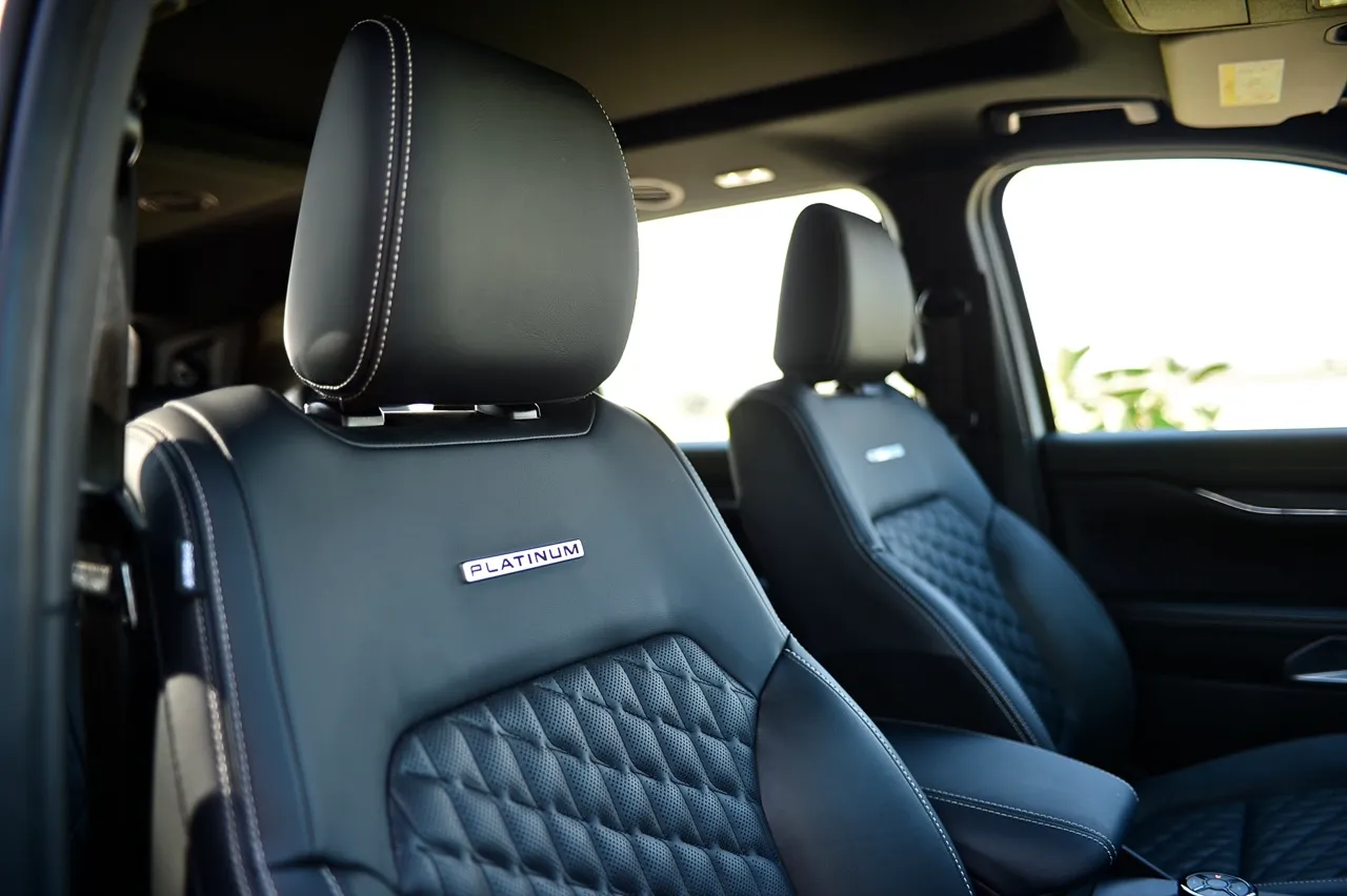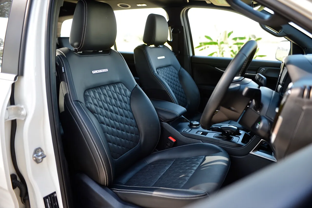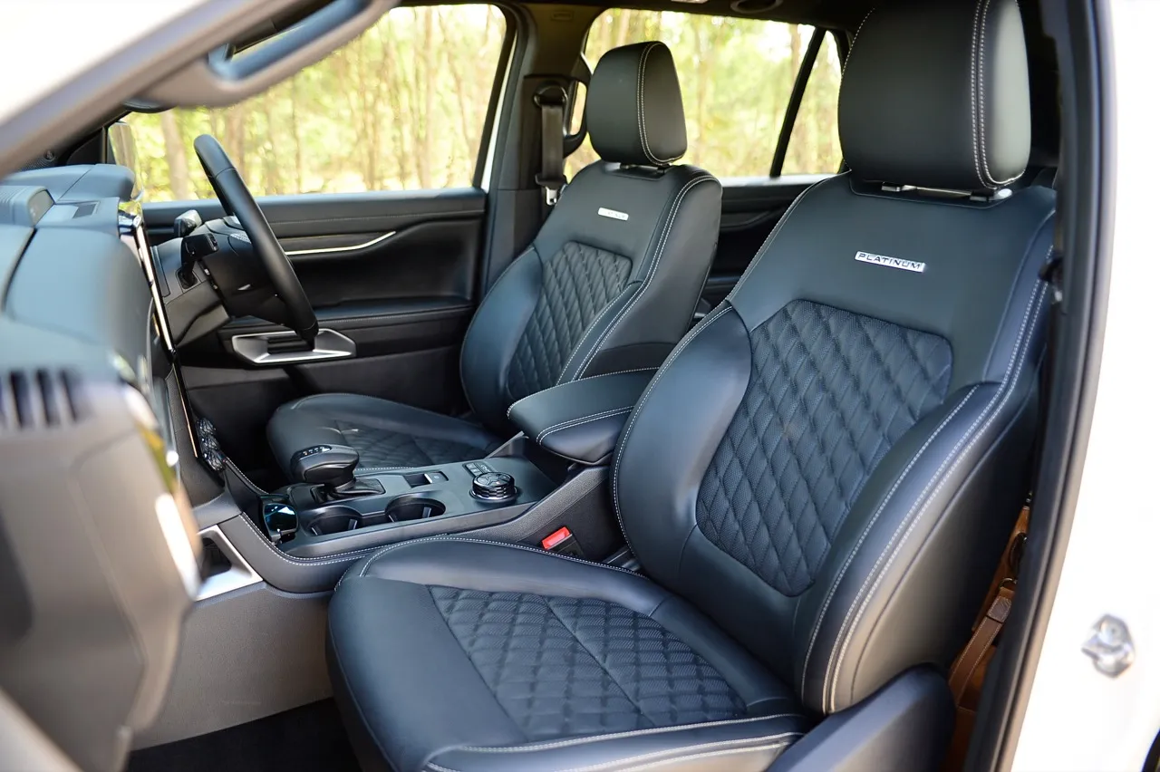 ห้องโดยสารของ Ford Everest รุ่น Platinum V6 3.0 Turbo 10A/T 4WD เนื่องจากเป็นรุ่นเกือบจะท็อปสุดของ Ford จึงพยายามปรับความหรูหราและใส่อุปกรณ์ตกแต่ง Platinum เพื่อความเรียบหรูเน้นการใช้งานจริงโดยลดสีสันไม่ให้ฉูดฉาด และไปเหมือนกับ Everest Wildtrak ด้วยการตัดเย็บที่ใช้ด้ายสีขาวตัดกับเบาะสังเคราะห์โทนสีดำ เบาะ พวงมาลัย แผงประตู เย็บเดินตะเข็บด้วยด้ายสีขาวตัดกับไวนิลสีเทาหรือหนังสังเคราะห์สีดำ ภายในแบบ 7 ที่นั่งมีมิติที่กว้างขวาง โดยเฉพาะโซนของเบาะคู่หน้าและเบาะแถวกลาง ส่วนเบาะแถวที่สามปรับพับด้วยไฟฟ้าให้ความสะดวกโดยที่ไม่ต้องออกแรง แต่พื้นที่เบาะแถวสามเหมาะกับเด็กมากกว่าจะให้คนตัวสูงลงไปนั่ง พลาสติกตกแต่งภายในมีผิวสัมผัสและรายละเอียดของชิ้นงานแตกต่างกันออกไป ตามแนวทางของงานตกแต่งห้องโดยสารยุคใหม่ของ Ford ห้องโดยสารเน้นสีดำเย็บตะเข็บด้วยด้ายสีขาวตามเอกลักษณ์ของ Everest รุ่น Platinum ที่เน้นความเคร่งขรึม โลโก้ซิกเนเจอร์ Platinum ที่พนักพิงหลังของเบาะคู่หน้า