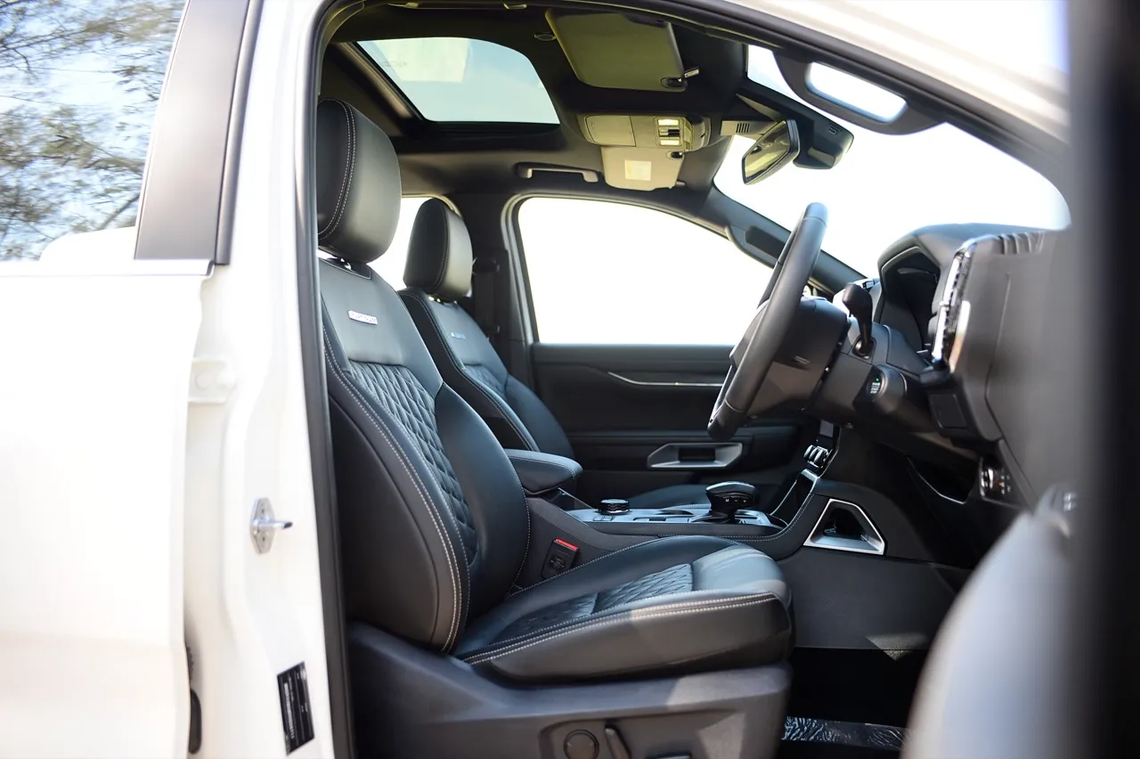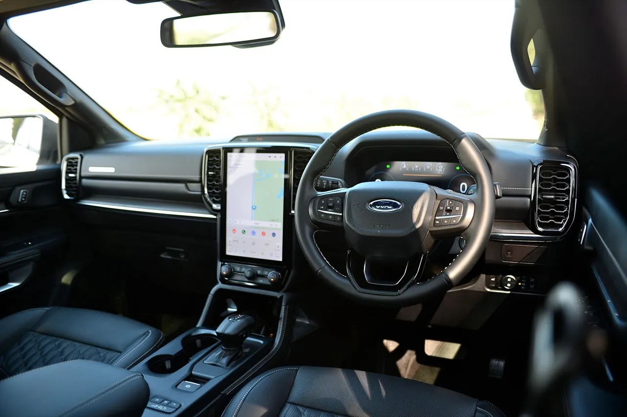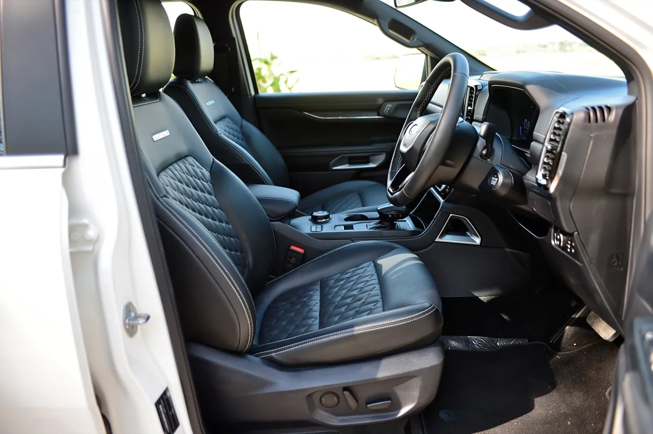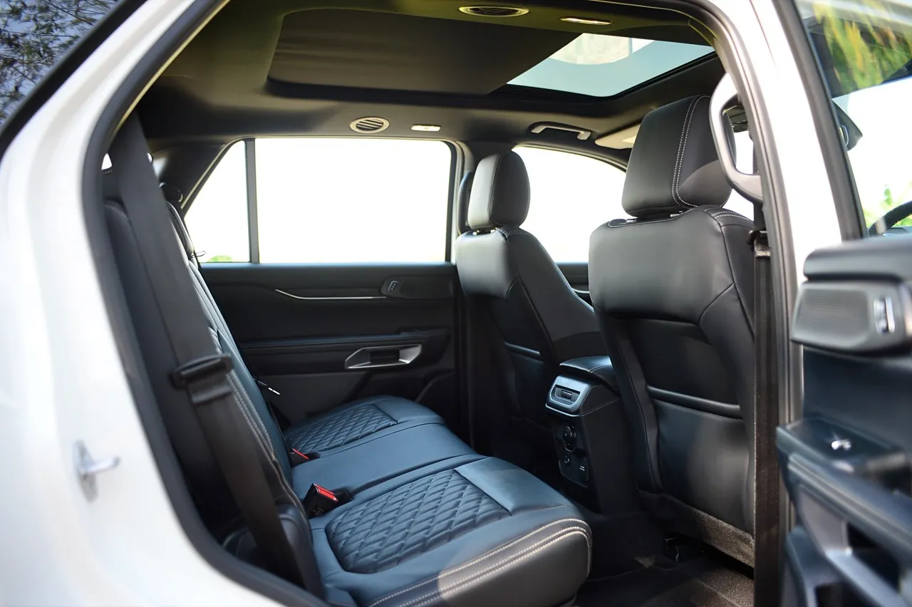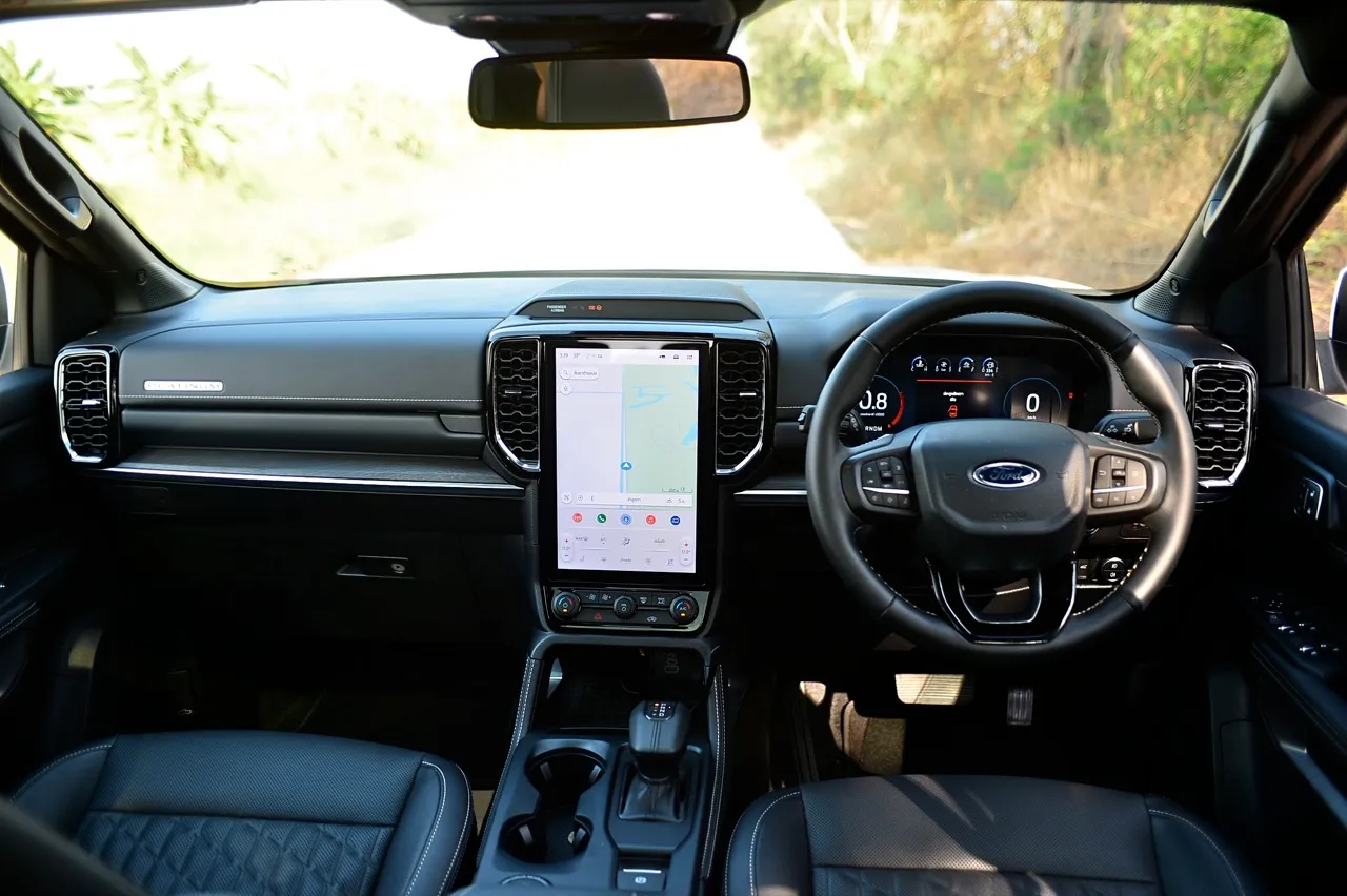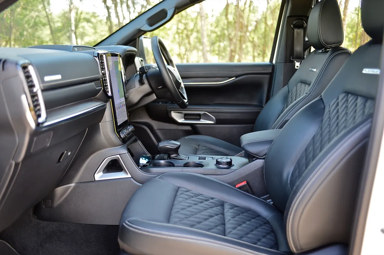 ห้องโดยสารของ Ford Everest รุ่น Platinum V6 3.0 Turbo 10A/T 4WD เนื่องจากเป็นรุ่นเกือบจะท็อปสุดของ Ford จึงพยายามปรับความหรูหราและใส่อุปกรณ์ตกแต่ง Platinum เพื่อความเรียบหรูเน้นการใช้งานจริงโดยลดสีสันไม่ให้ฉูดฉาด และไปเหมือนกับ Everest Wildtrak ด้วยการตัดเย็บที่ใช้ด้ายสีขาวตัดกับเบาะสังเคราะห์โทนสีดำ เบาะ พวงมาลัย แผงประตู เย็บเดินตะเข็บด้วยด้ายสีขาวตัดกับไวนิลสีเทาหรือหนังสังเคราะห์สีดำ ภายในแบบ 7 ที่นั่งมีมิติที่กว้างขวาง โดยเฉพาะโซนของเบาะคู่หน้าและเบาะแถวกลาง ส่วนเบาะแถวที่สามปรับพับด้วยไฟฟ้าให้ความสะดวกโดยที่ไม่ต้องออกแรง แต่พื้นที่เบาะแถวสามเหมาะกับเด็กมากกว่าจะให้คนตัวสูงลงไปนั่ง พลาสติกตกแต่งภายในมีผิวสัมผัสและรายละเอียดของชิ้นงานแตกต่างกันออกไป ตามแนวทางของงานตกแต่งห้องโดยสารยุคใหม่ของ Ford ห้องโดยสารเน้นสีดำเย็บตะเข็บด้วยด้ายสีขาวตามเอกลักษณ์ของ Everest รุ่น Platinum ที่เน้นความเคร่งขรึม โลโก้ซิกเนเจอร์ Platinum ที่พนักพิงหลังของเบาะคู่หน้า