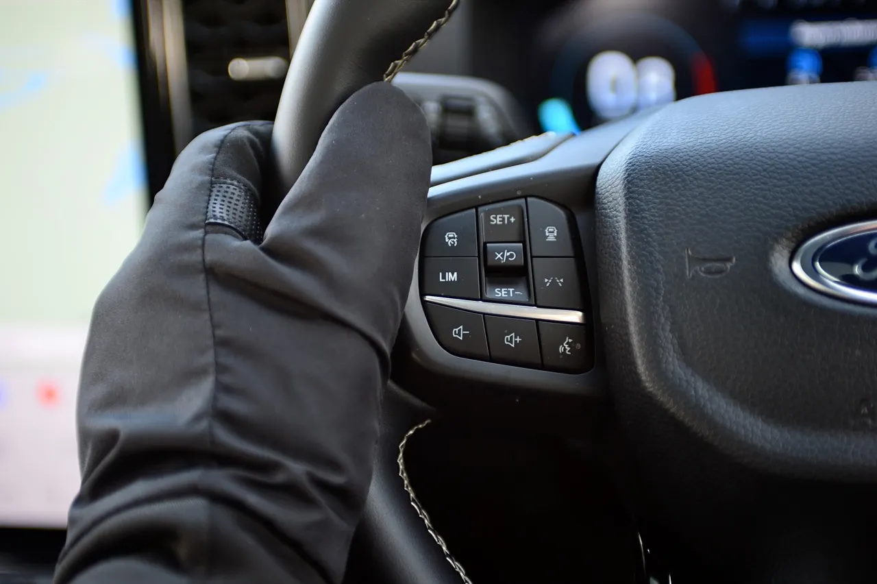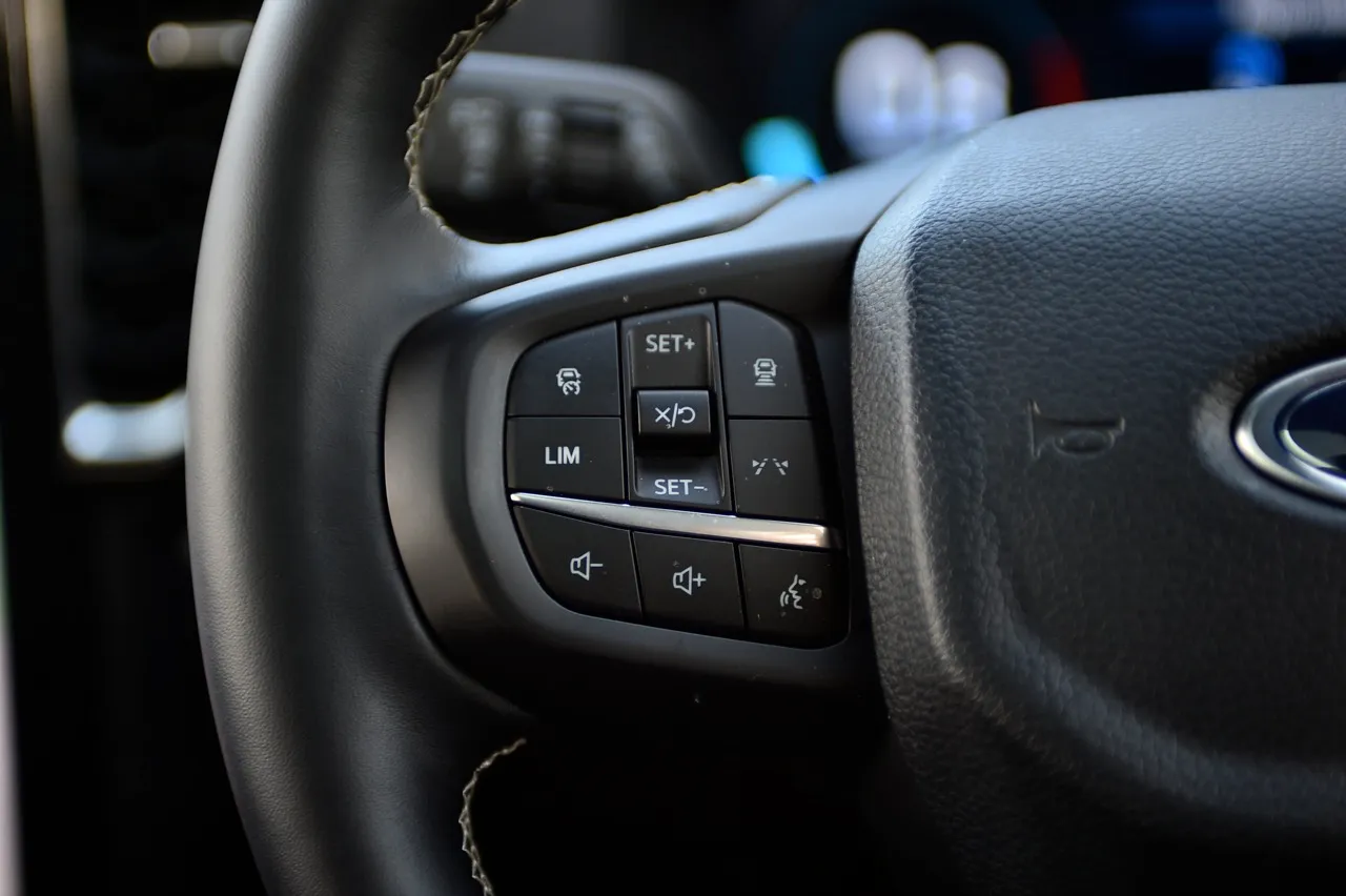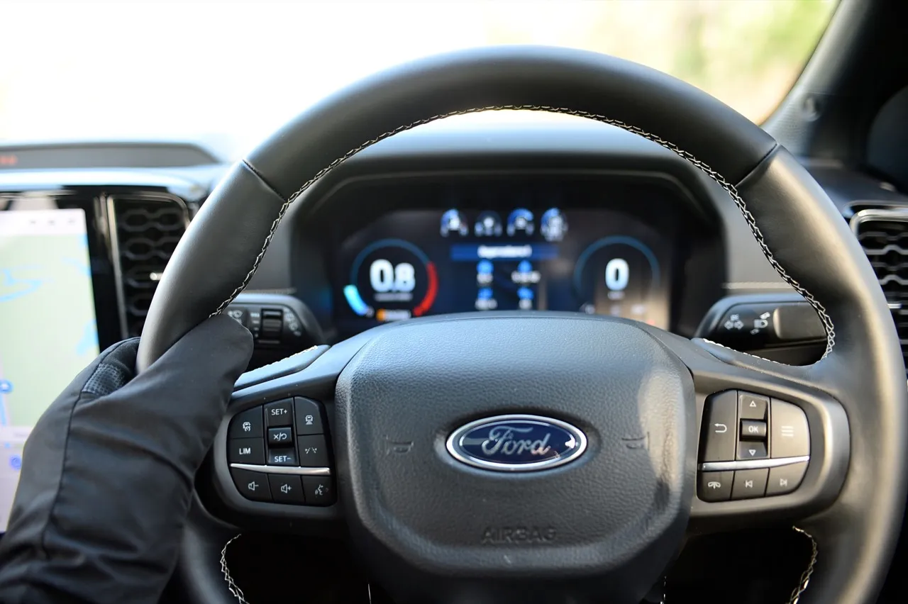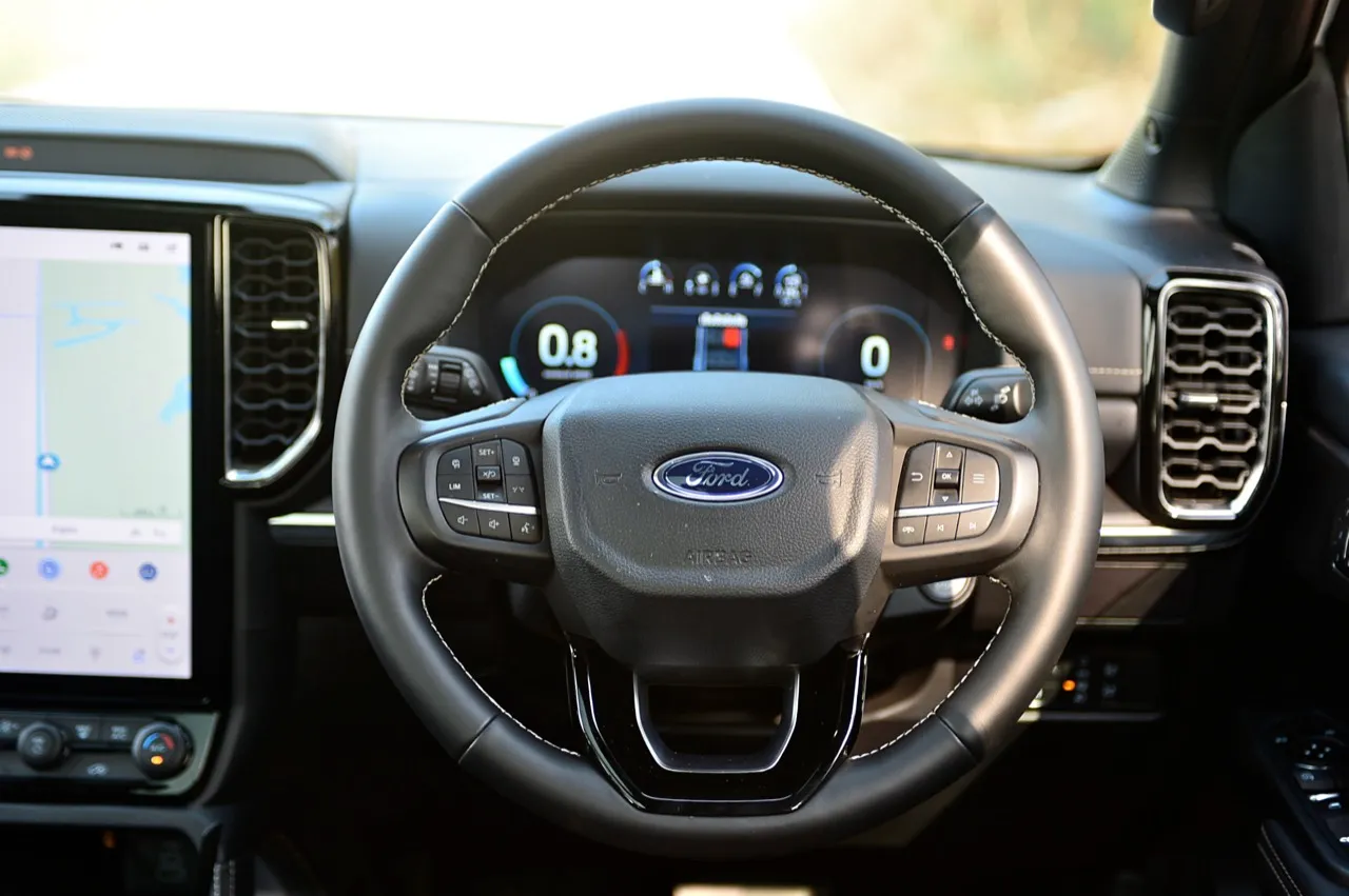 พวงมาลัยไฟฟ้าเมื่อขับออกจากที่อาคารจอดรถแถบสาทรให้ความรู้สึกที่เบาสบายมือ พอทะยานขึ้นทางด่วนแล้วใช้ความเร็วต่อเนื่อง พวงมาลัยไฟฟ้าให้ความมั่นใจได้ดีเหมือนกับ Everest รุ่นใหม่ทุกเวอร์ชัน แม่นยำและเปลี่ยนทิศทางได้อย่างธรรมชาติ Ford เป็นแบรนด์ที่ติดตั้งพวงมาลัยไฟฟ้าในรถ Ranger และ Everest ล่าสุด Mitsubishi Triton รุ่นท็อปสุดก็มีการเปลี่ยนชุดบังคับเลี้ยวให้เป็นแบบไฟฟ้าด้วยเหมือนกัน! การเซตค่าความหน่วงของพวงมาลัยใน Everest V6 เมื่อขับเร็วก็เป็นไปในแบบคล่องตัว น้ำหนักเบาและให้ระยะการหมุนที่แม่นยำ ขับในเมืองช่วยทำให้การเลี้ยวเปลี่ยนช่องทางหรือกลับลำยูเทิร์นมีความคล่องตัว ห้องโดยสารไม่มีเสียงแปลกปลอมเสียดสีกันของชิ้นงานที่ใช้ตกแต่ง เก็บเสียงได้ดี มีแค่เสียงยาง 21 นิ้วเท่านั้นที่ได้ยินเบาๆ เมื่อความเร็วเกิน 100 กิโลเมตรต่อชั่วโมง การเดินเบาของเครื่อง V6 3.0 ลิตร เทอร์โบ ทำได้ดีเท่ากับแบรนด์ยุโรปเลยทีเดียว แรงสั่นสะเทือนจากการทำงานของเครื่องยนต์ไม่มาก เป็นอีกจุดที่ทำออกมาได้ดีจนรู้สึกแปลกใจ