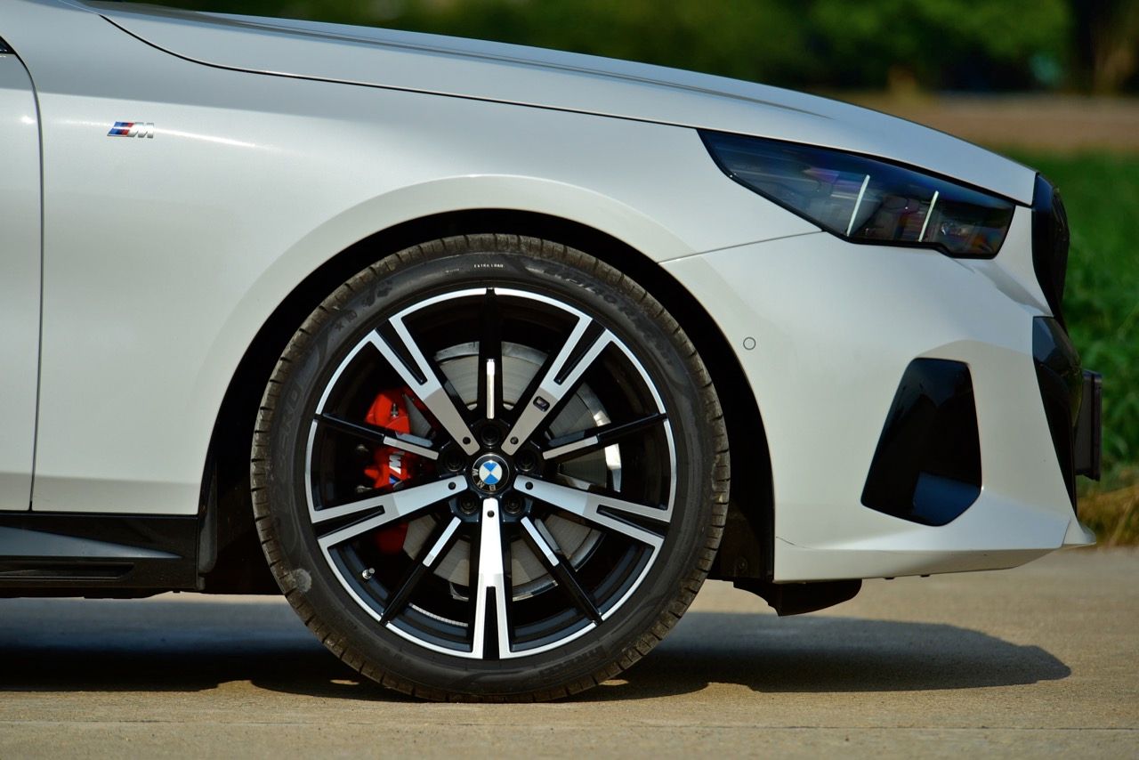 BMW New Series-5 520d คันใหม่มาพร้อมล้อขนาดใหญ่ เติมเต็มสัดส่วนของ 5 ได้ค่อนข้างดี กระโปรงหน้ายาว กระจกหลังที่ลาดเอียงเหนือแผง ส่วนหลังที่ดูสวยงามด้วยไฟท้ายแบบใหม่ ล้ออัลลอย M light ขนาด 20 นิ้ว หุ้มด้วยยางสปอร์ตสมรรถนะสูง pirelli p zero หน้า 245/40R20 หลัง 275/35R20 รูปทรงของส่วนท้ายและตำแหน่งของไฟท้ายด้านหลัง กันชนหลังที่มีเหลี่ยมมุมและแกะสลักแนบชิดกับส่วนท้ายอย่างแนบเนียน พร้อม Hofmeister kink อันเลื่องชื่อ ยังคงอยู่ที่กระจกประตูหลังที่บรรจบกับเสา C มีตัวเลข “5” ที่นูนขึ้นมาในการตกแต่งแบบ Shadowline