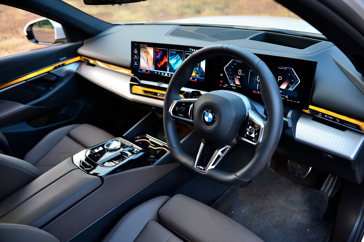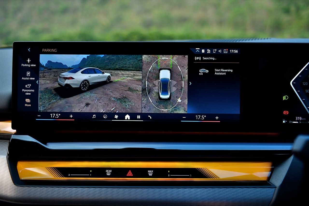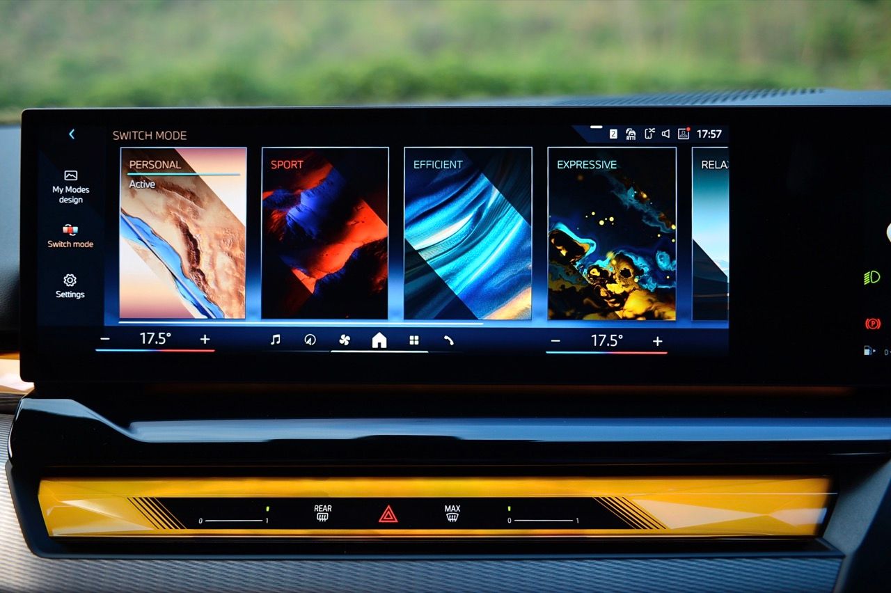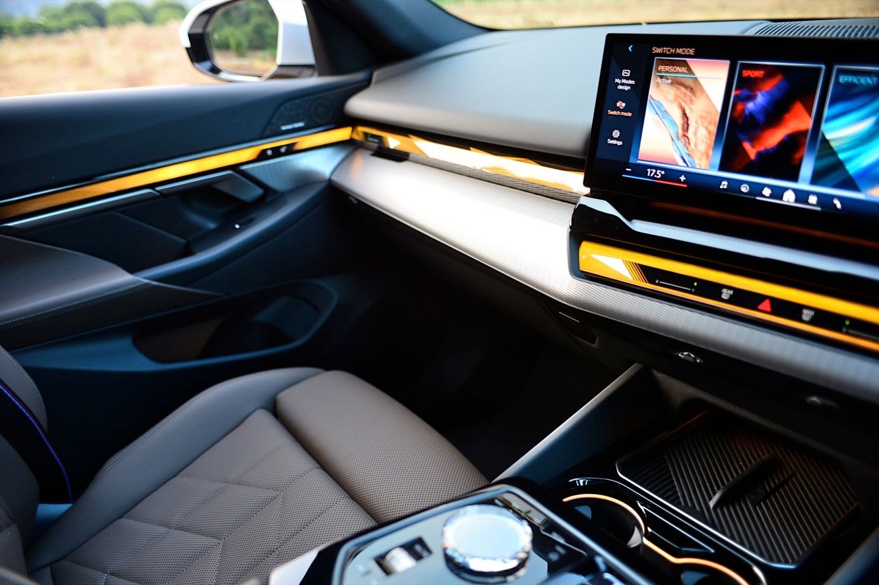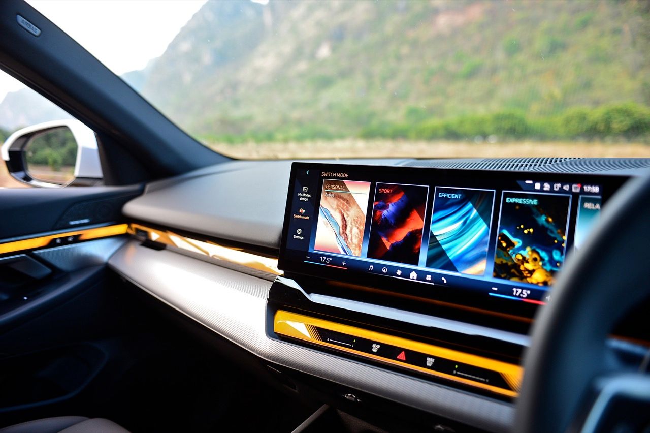 หน้าจอทรงโค้งผสมผสานจอภาพมาตรวัด instrument cluster TFT LCD ขนาด 12.3 และจอภาพมอนิเตอร์กลาง 14.9 นิ้ว ระบบปฏิบัติการ BMW OS 8.5 ซึ่งมีการปรับปรุงฟังก์ชันใหม่ให้ใช้งาน การจัดกลุ่มปุ่มทางลัดบางปุ่มในส่วนล่างของหน้าจอ ช่วยให้เข้าถึงฟังก์ชันของระบบอินโฟเทนเมนต์ การเชื่อมต่ออุปกรณ์ต่างๆ ระบบนำทาง ระบบควบคุมอุณหภูมิ หน้าจอส่วนแอปฯ และเมนูโทรศัพท์ ฟังก์ชันต่างๆ จะปรากฏที่ส่วนล่างของหน้าจอเสมอ ทำให้ผู้ใช้ได้รับประสบการณ์ที่ดีกว่าเดิม BMW เรียกว่า "Quick Select" สามารถตั้งค่าแอปฯ ที่ใช้บ่อยที่สุดเป็นทางลัด ที่สามารถเข้าถึงได้ง่ายผ่านเมนูแบบเลื่อนลงจากด้านบนของหน้าจอ Apple CarPlay แบบไร้สายทำงานได้อย่างไร้ที่ติ พร้อมระบบสั่งงานด้วยเสียงของ BMW ที่ทำงานได้ดีอย่างน่าประหลาดใจ (ใน i5 M60) ในการทำความเข้าใจกับคำพูดที่เป็นธรรมชาติ เพื่อเปิดใช้งานฟังก์ชันที่คนขับต้องการ
