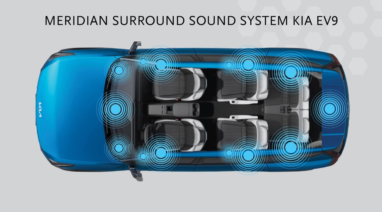 เทคโนโลยี DSP ใน EV9 จาก Meridian RE-Q ซึ่งเพิ่มประสิทธิภาพของระบบเสียงให้เข้ากับเสียงรบกวนที่เกิดขึ้นจากการขับเคลื่อน Meridian Digital Precision เพิ่มอัตราส่วนสัญญาณต่อเสียงรบกวนสูงสุด โดยรักษาจังหวะที่เป็นธรรมชาติ และ Meridian Horizon ซึ่งเป็นเทคโนโลยีอัพมิกซ์ ให้เสียงหลายแชนแนล จากทั้งสเตอริโอสองแชนแนล และเนทีฟ 5.1 มอบประสบการณ์เสียงเซอร์ราวนด์ได้อย่างราบรื่น พร้อมการควบคุมปรับแต่งสำหรับผู้ใช้ ส่วน lntelli-Q Data-Driven Equalization ของ Meridian ช่วยปรับแต่งและเพิ่มรายละเอียดของเสียงเพลงตามความต้องการของลูกค้า ระบบนี้จะตอบสนองต่อธรรมชาติที่เปลี่ยนแปลงของสภาพแวดล้อมทางเสียงในรถยนต์ไฟฟ้า เมื่อความเร็วผกผันขึ้น-ลงตลอดเส้นทาง