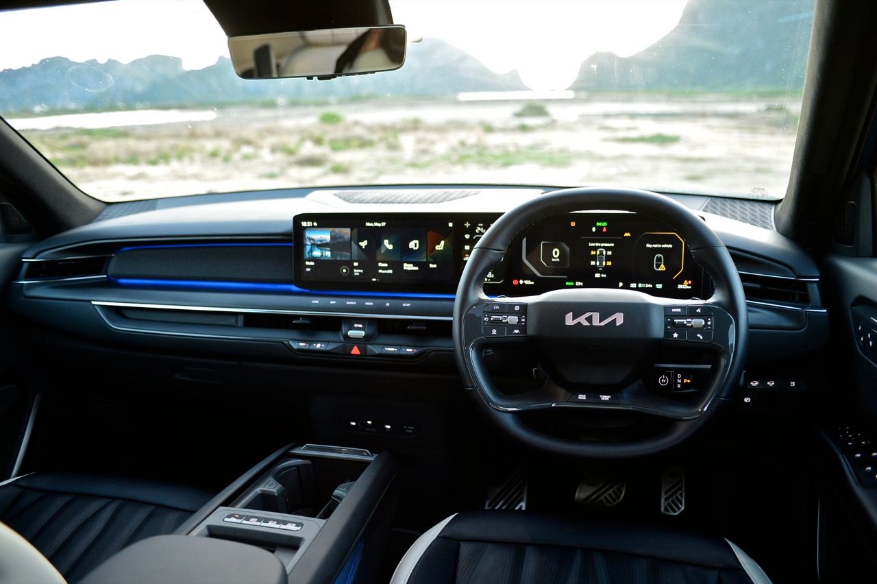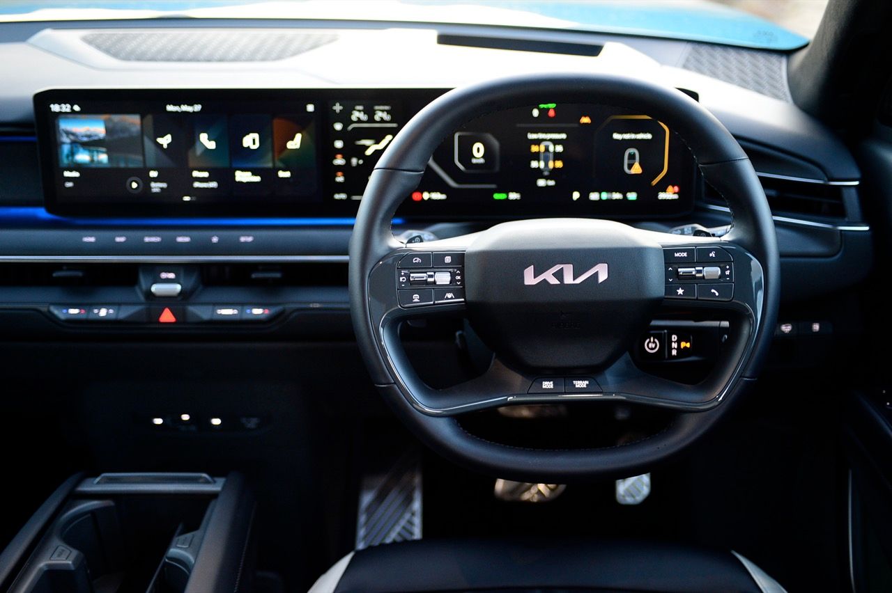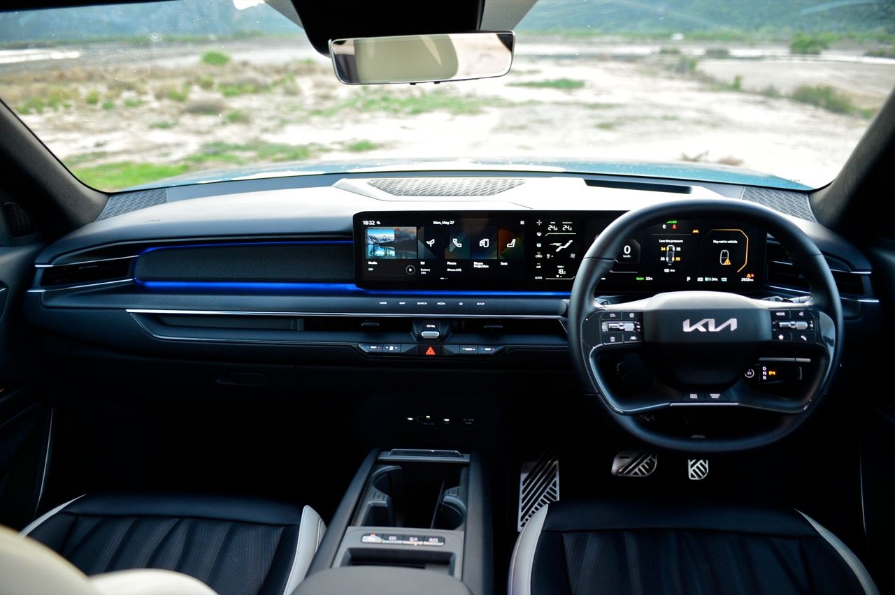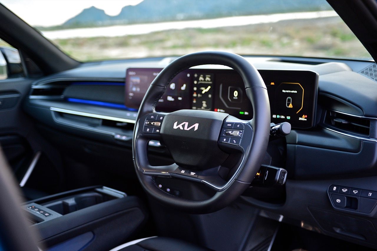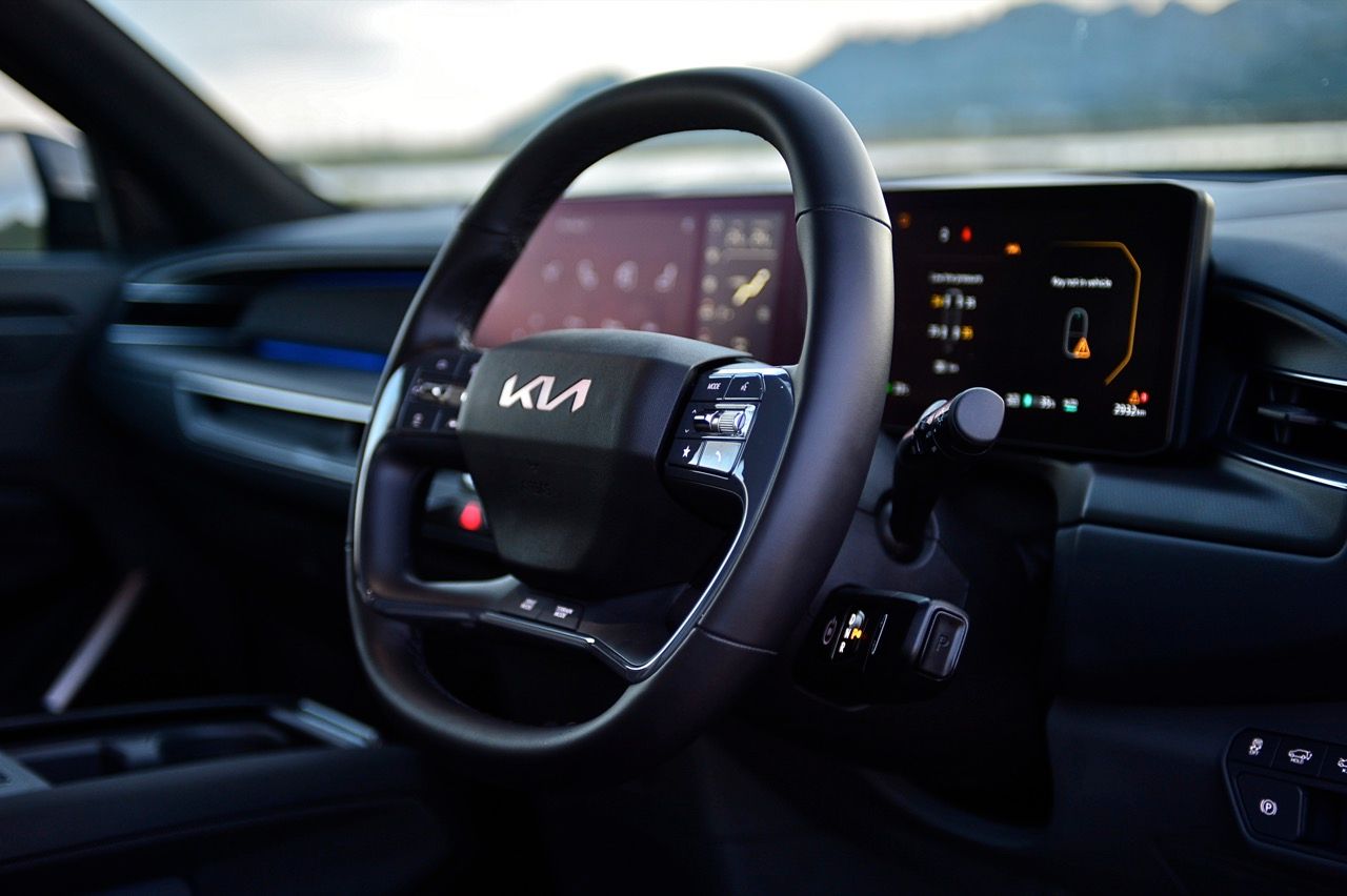 EV9 ดูล้ำยุคและอัดแน่นไปด้วยเทคโนโลยี แต่ก็ไม่ใช่รถยนต์ที่แหวกแนวในการใช้งาน คันเกียร์ที่เหมือนกับ Mercedes-Benz ใช้งานได้ง่าย เริ่มต้นด้วยการกดปุ่มสตาร์ตบนแท่งก้านเกียร์ที่ยื่นออกมาจากคอพวงมาลัยด้านขวา บิดปลายของคันเกียร์ไปข้างหน้าเพื่อขับเคลื่อน หรือบิดเข้ามาหาตัวเพื่อขับถอยหลัง รวมถึงการกดลงไปบนคันเกียร์ในตำแหน่ง P เพื่อจอด พวงมาลัยทรงสี่เหลี่ยม แพดเดิลชิฟเตอร์สองตัวจะปรับการเบรกแบบรีเจนสะสมพลังงาน ทำงานได้หลายระดับการหน่วงและไม่เปลืองผ้าเบรก มีฟังก์ชัน 'อัตโนมัติ' ซึ่งทำงานโดยการวัดระยะห่างจากรถคันหน้า แต่ระบบไม่ได้ฉลาดเท่า Mercedes-Benz ที่วัดระยะห่างจากรถคันข้างหน้าแล้วหน่วงความเร็วได้อย่างนุ่มนวลแม่นยำ ใน EV9 บางครั้งคุณต้องคอยเบรกช่วยเนื่องจากอาจใช้ความเร็วสูงเกินไป