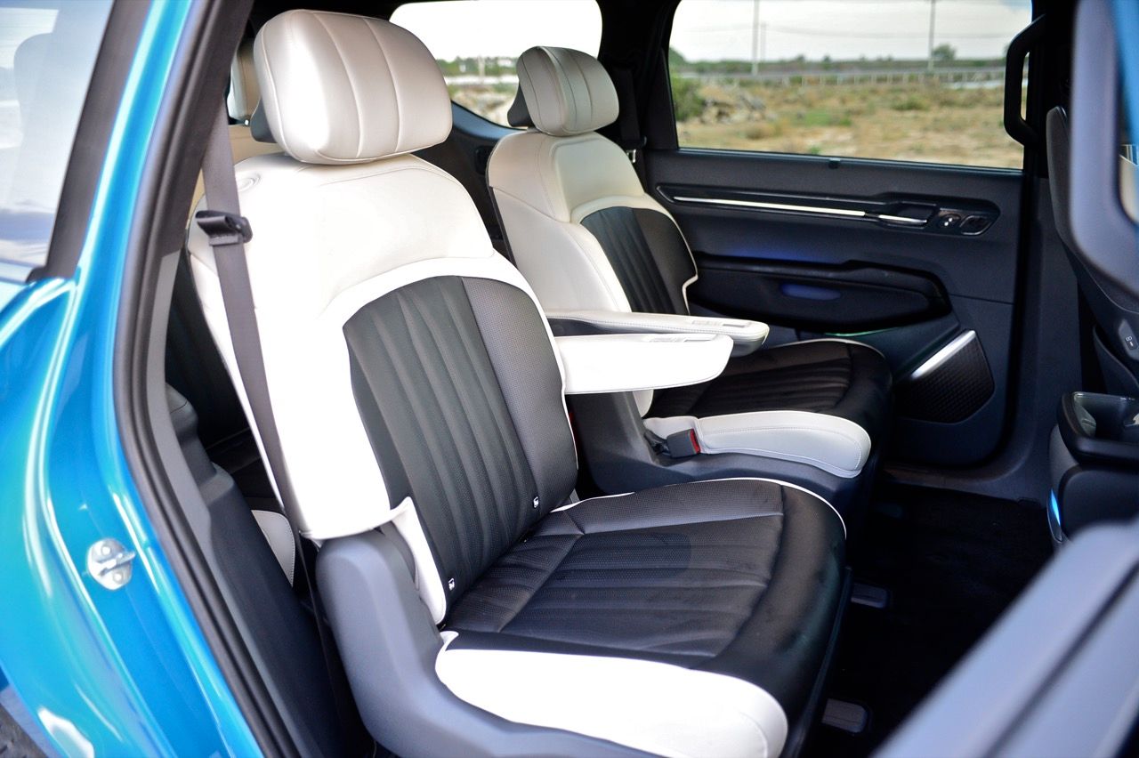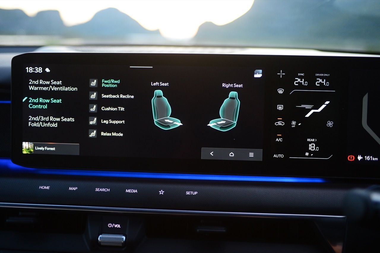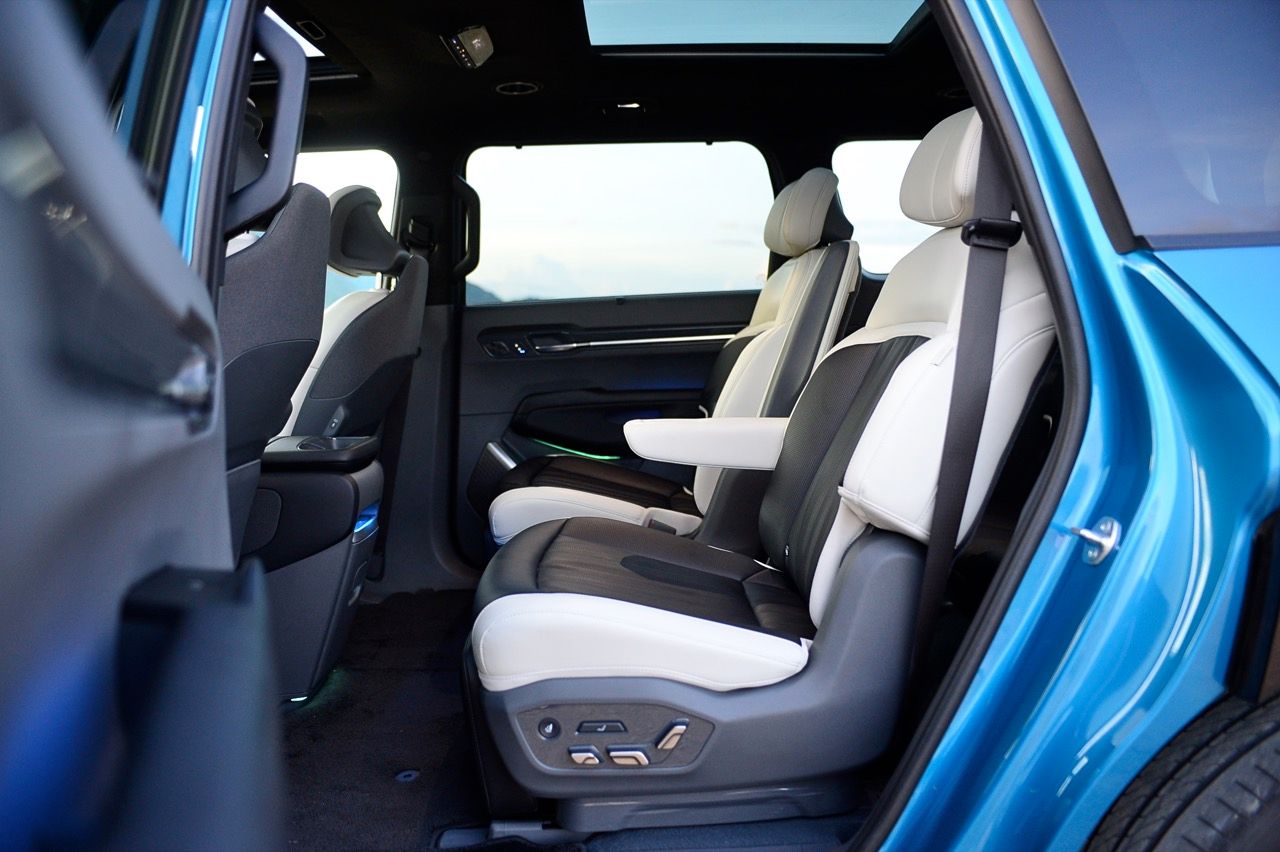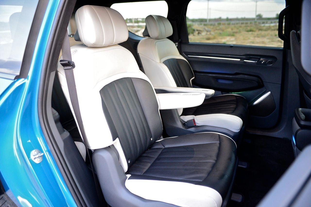ผมชอบการใช้แป้นเปลี่ยนเกียร์ของ Kia เพื่อปรับการตั้งค่าการหน่วงของระบบสะสมพลังงาน regenerative braking การฟื้นฟูตัวเร่งความเร็วปรับได้หลายระดับ แทบจะไม่ต้องใช้เบรกหนักๆ เพราะ regenerative ของ EV9 ทำงานได้ดีมาก แป้น Paddle ทำให้ปรับค่าการรีเจนได้อย่างรวดเร็ว โดยส่วนตัวผมสลับระหว่างการตั้งค่าการรีเจนต่ำสุดไปจนถึงสูงสุด ไม่มีการตั้งค่าเหล่านี้ซึ่งฝังอยู่ในเมนู ทำให้ชีวิตง่ายขึ้นมาก จริงๆ แล้ว EV9 ไม่มีปัญหาอะไรกับการใช้งานจอภาพเนื่องจากการออกแบบแยกย่อยฟังก์ชันต่างๆ ที่มีทั้งสั่งงานผ่านหน้าจอหรือผ่านสวิตช์ควบคุมที่ก้านพวงมาลัย วิธีในการจัดวางตำแหน่งของเบาะนั่งที่เน้นความสบาย แต่เข้าออกจากรถในแถวที่สามไม่สะดวกเท่ากับรถตู้ประตูสไลด์ไฟฟ้า เบาะทุกตำแหน่งปรับหรือพับด้วยไฟฟ้า พร้อมฟังก์ชันนวดตัวแปลกๆ ที่เอาแต่สั่นไม่กดเป็นจุดๆเหมือนเบาะนวดทั่วไป