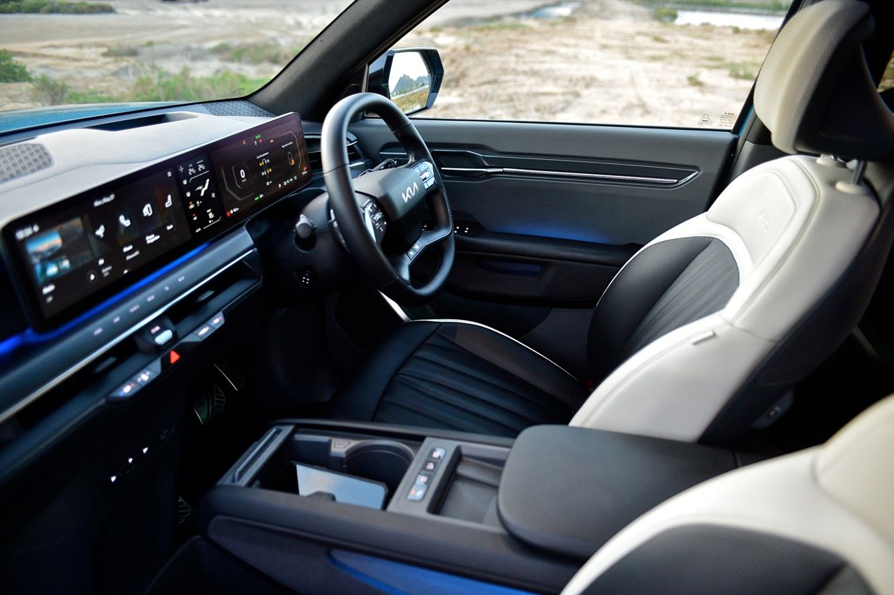 EV9 เป็นรถที่ช่วยให้ Kia ก้าวขึ้นไปสู่เซ็กเมนต์ที่เต็มไปด้วยคู่แข่งสมรรถนะสูงและมันก็ทำได้ดี เนื่องจาก Hyundai Ioniq 7 ยังไม่เปิดตัวในไทย ส่วนรถเอสยูวีเบาะสามแถวพลังงานไฟฟ้าของ Toyota จะเปิดตัวในปี 2026 ซึ่งไม่แน่ว่าจะเอาเข้ามาขายหรือไม่ คู่แข่งระดับหรูอย่าง Volvo EX90 ก็ยังไม่เปิดตัวในไทย และแน่นอนว่าเรือรบไวกิ้งไฟฟ้าลำโตจะมีราคาแพงกว่ารถเอสยูวีไฟฟ้าของเกาหลี EV9 เต็มไปด้วยอุปกรณ์ช่วยขับไฮเทค เช่น ระบบช่วยจอดรถอัตโนมัติ โหมด 'คลาน' แบบไร้คนขับ เพื่อให้สามารถเข้าและออกจากพื้นที่แคบโดยไม่ต้องเปิดประตู การเปลี่ยนเลนอัตโนมัติบนมอเตอร์เวย์ นอกจากนี้ EV9 ยังมีจิตสำนึกต่อสิ่งแวดล้อมที่ไม่ปล่อยมลพิษ งานตกแต่งภายในด้วยการเลือกใช้วัสดุหลักท่ีผ่านการรีไซเคิล หรือนำมาจากแหล่งที่ยั่งยืนโดยไม่ไปรบกวนธรรมชาติ ไม่มีหนังแท้ที่ต้องฆ่าวัวหลายตัว แต่ใช้หนังสังเคราะห์ที่นุ่มนวลกว่า พลาสติกรีไซเคิลหรือชิ้นส่วนที่ผลิตมาจากพืชผลทางการเกษตร แม้แต่สีที่ใช้พ่นก็ปรุงแต่งโดยใช้สารเคมีที่มีความน่ารังเกียจน้อยลง เป็นสีเทาอมฟ้าตัดกับพลาสติกสีดำเงาที่ทำให้รถดูสวยและแพง แม้จะเต็มไปด้วยเทคโนโลยีระบบขับเคลื่อนไฟฟ้าแบบใหม่ แต่ก็ไม่ได้มีกลิ่นอายของความหรูหราร่ำรวยมากเท่ากับ BMW X7 หรือ Mercedes-Benz GLS