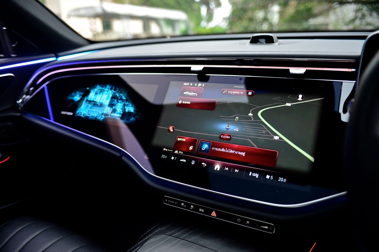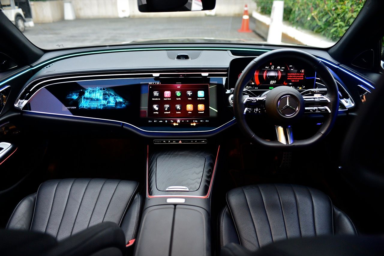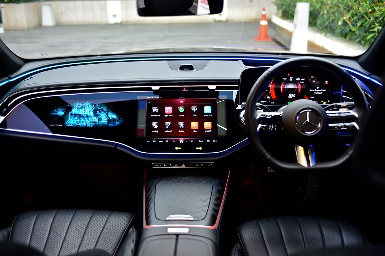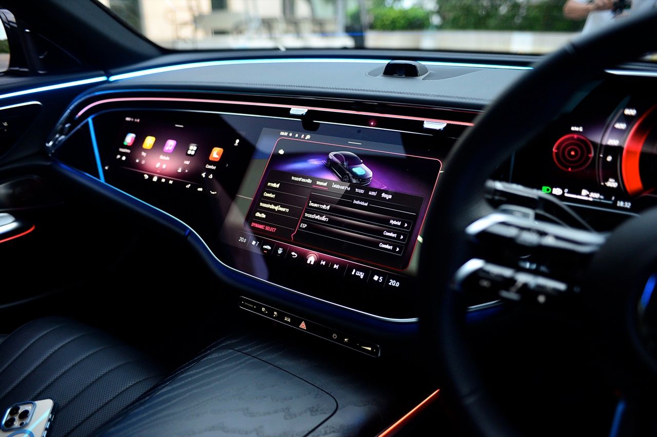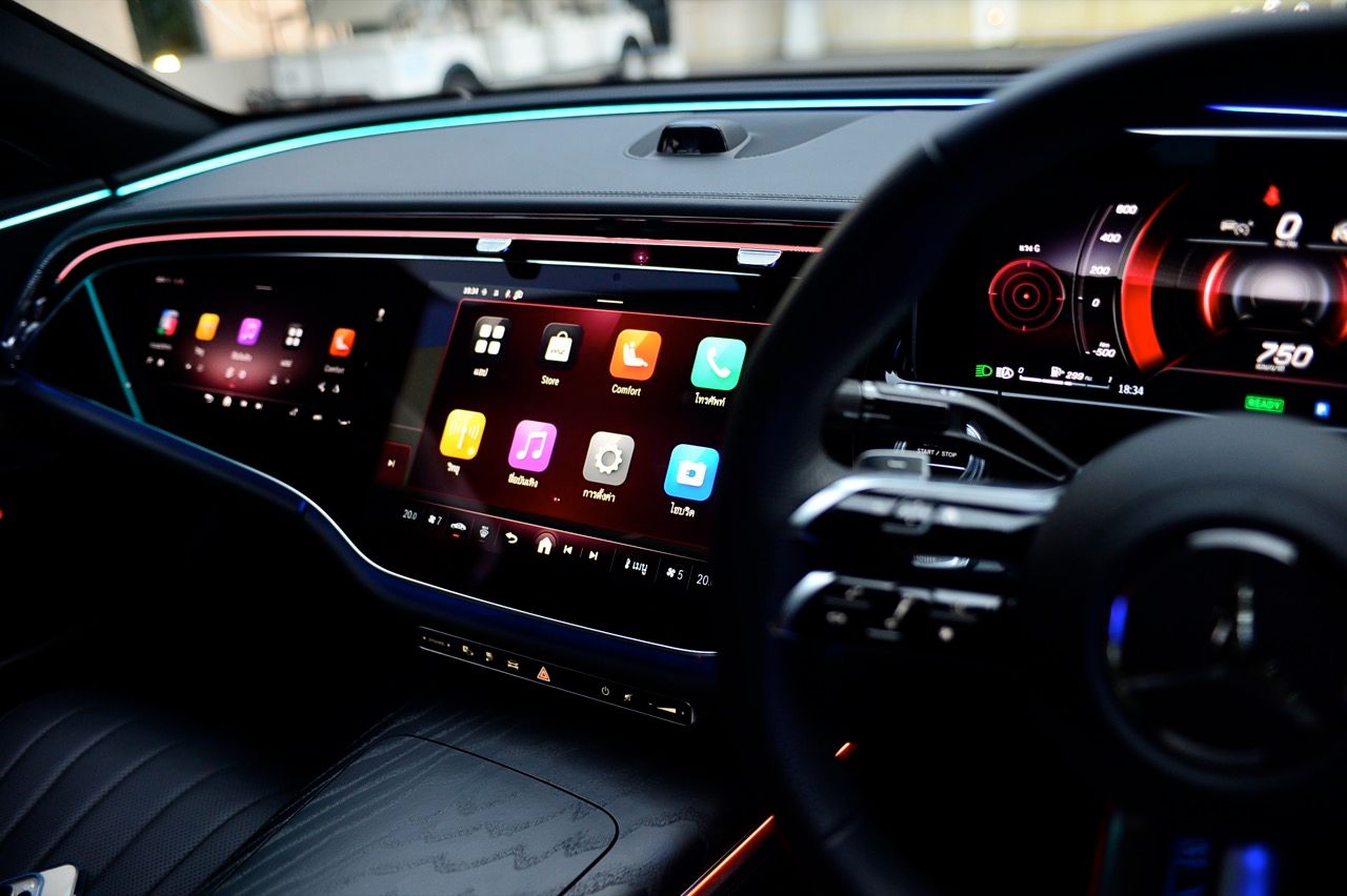ภายในมีจอภาพ MBUX Superscreen พร้อมพื้นผิวกระจกขนาดใหญ่ แดชบอร์ดดิจิทัล ขยายไปถึงจอแสดงผลส่วนกลาง จอภาพมาตรวัดของคนขับความละเอียดสูง ระบบอิเล็กทรอนิกส์ ขับเคลื่อนด้วยซอฟต์แวร์ล่าสุดที่ตอบสนองเร็ว และทำงานผ่านฮาร์ดแวร์น้อยลง ฟังก์ชันการคำนวณของโดเมนที่แยกจากกันในโปรเซสเซอร์ตัวเดียว หน้าจอและระบบอินโฟเทนเมนต์ MBUX คอมพิวเตอร์ออนบอร์ดส่วนกลางแบบใหม่ที่ทรงพลังมาก ปรับปรุงประสิทธิภาพและความเร็วของการสตรีมข้อมูล เชื่อมต่อ iPhone และ Apple® Watch ด้วย Digital Vehicle Key ทำให้ E-Class สามารถสตาร์ตและล็อกได้ง่าย กุญแจรถยนต์แบบดิจิทัลเป็นส่วนหนึ่งของ KEYLESS-GO Convenience