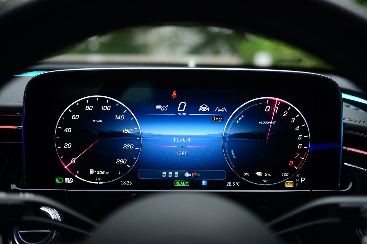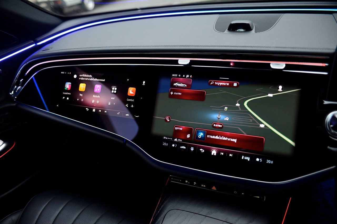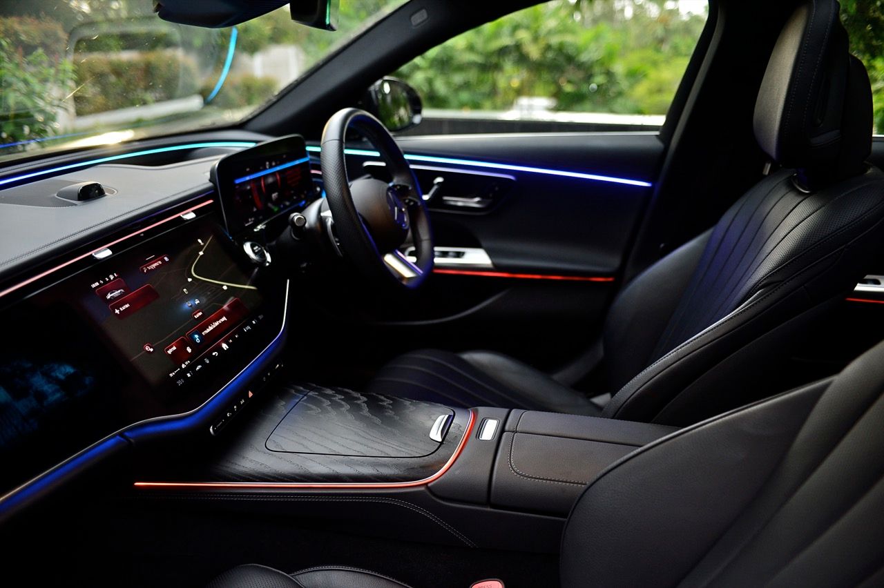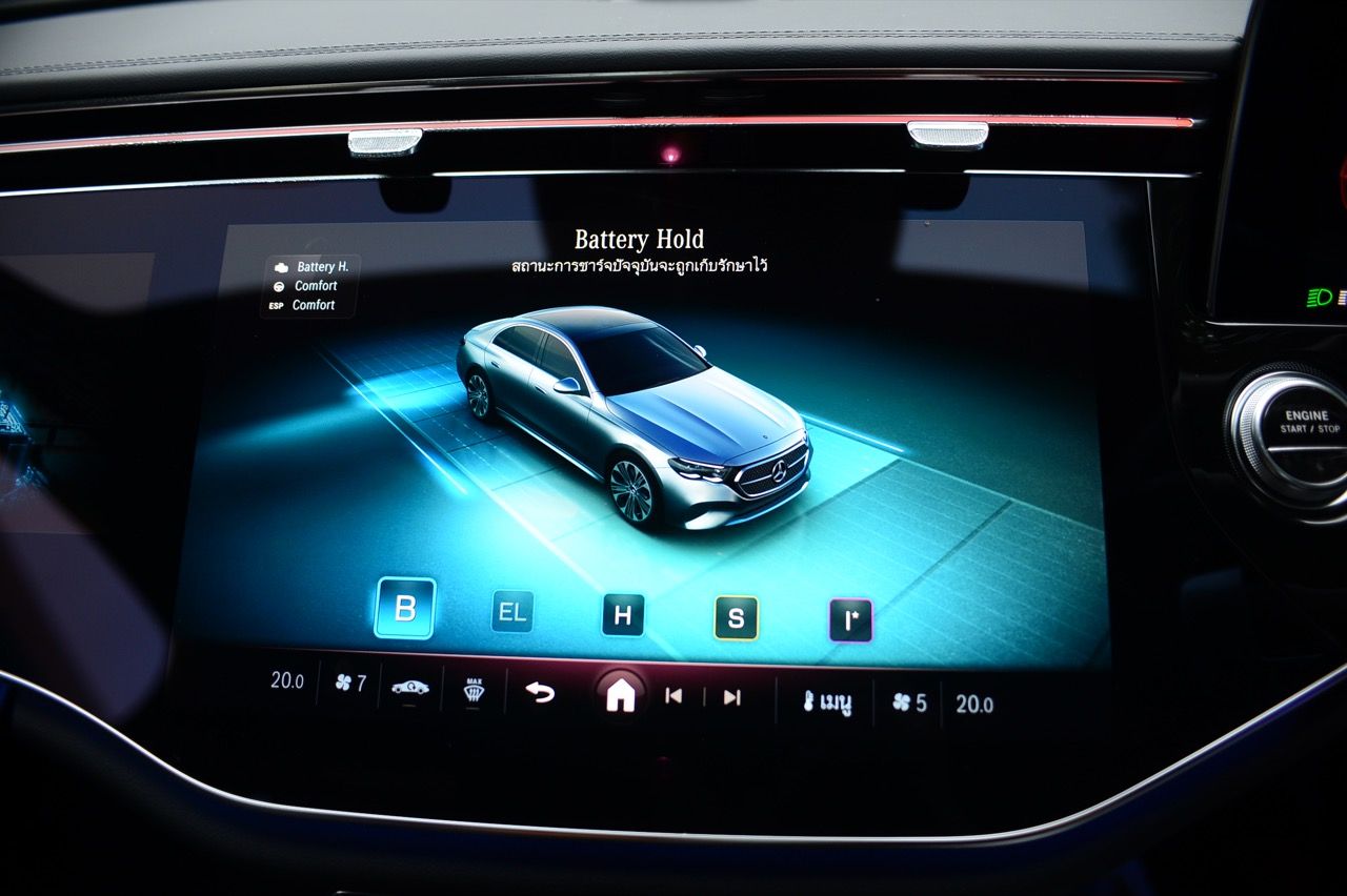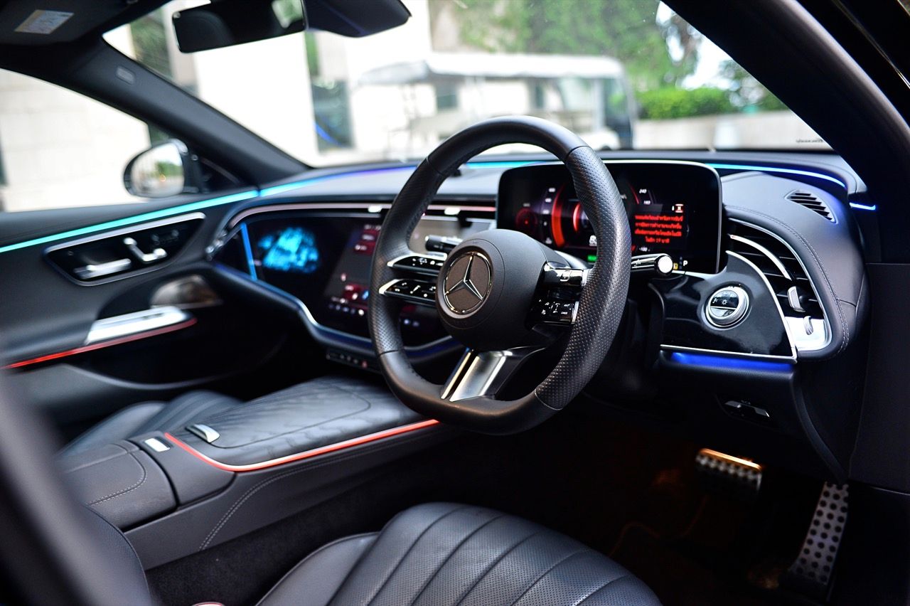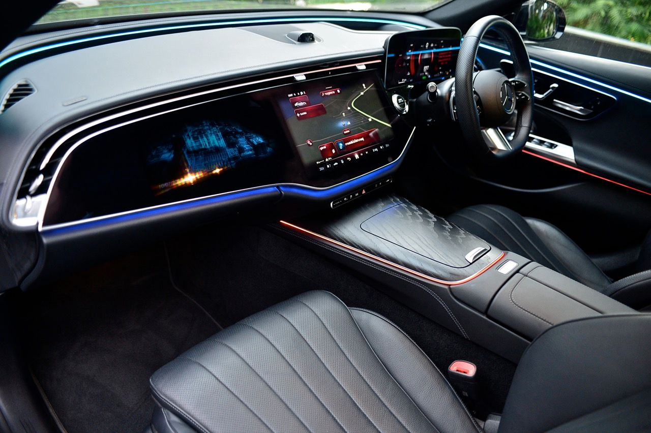 ภายในมีจอภาพ MBUX Superscreen พร้อมพื้นผิวกระจกขนาดใหญ่ แดชบอร์ดดิจิทัล ขยายไปถึงจอแสดงผลส่วนกลาง จอภาพมาตรวัดของคนขับความละเอียดสูง ระบบอิเล็กทรอนิกส์ ขับเคลื่อนด้วยซอฟต์แวร์ล่าสุดที่ตอบสนองเร็ว และทำงานผ่านฮาร์ดแวร์น้อยลง ฟังก์ชันการคำนวณของโดเมนที่แยกจากกันในโปรเซสเซอร์ตัวเดียว หน้าจอและระบบอินโฟเทนเมนต์ MBUX คอมพิวเตอร์ออนบอร์ดส่วนกลางแบบใหม่ที่ทรงพลังมาก ปรับปรุงประสิทธิภาพและความเร็วของการสตรีมข้อมูล เชื่อมต่อ iPhone และ Apple® Watch ด้วย Digital Vehicle Key ทำให้ E-Class สามารถสตาร์ตและล็อกได้ง่าย กุญแจรถยนต์แบบดิจิทัลเป็นส่วนหนึ่งของ KEYLESS-GO Convenience