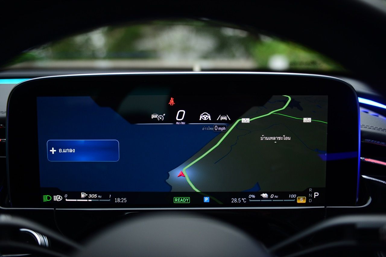 งานตกแต่งภายในไปละม้ายคล้ายคลึงกับ Digital Glass Cockpit ของ EQS รุ่นสูงสุดมีจอภาพสามจอ ปุ่มกดแบบที่เป็นปุ่มจริงๆ หายไป นับเป็นการลดบทบาทการใช้ปุ่มหรือสวิตช์จากรุ่นที่แล้วแบบรถคนละยุค เหมือนคนออกแบบตัดสินใจข้ามธีมดีไซน์แบบที่เห็นใน C-Class กับ S-Class ระบบ MBUX Superscreen ลูกเล่นใหม่ล่าสุดสำหรับยานยนต์ยุคใหม่ของแบรนด์ตราดาว ทั้งการใช้สมาร์ทโฟนเป็น Digital Key การใช้จอภาพแสดงผลส่วนกลางรองรับการประชุม Tele Conference (ต้องจอดรถถึงจะใช้งานได้) บนคอนโซลมีกล้องสำหรับส่องภายในรถ ใช้ Selfie หรือเพื่อจุดประสงค์อื่นๆ