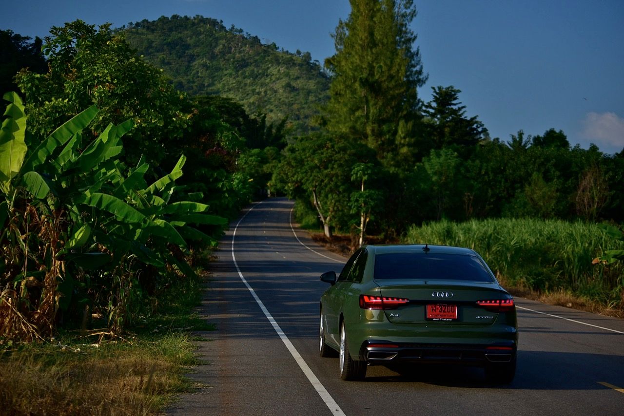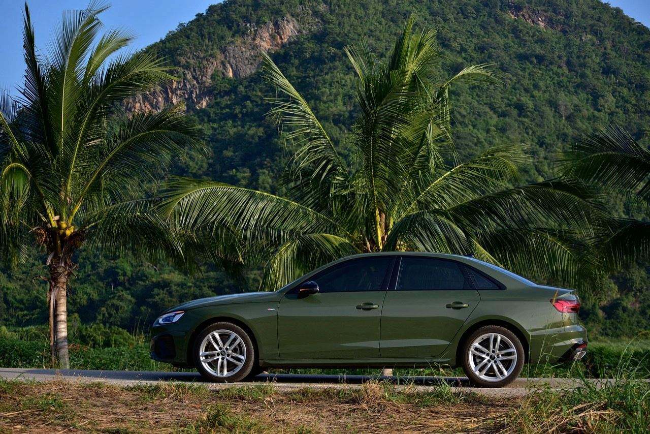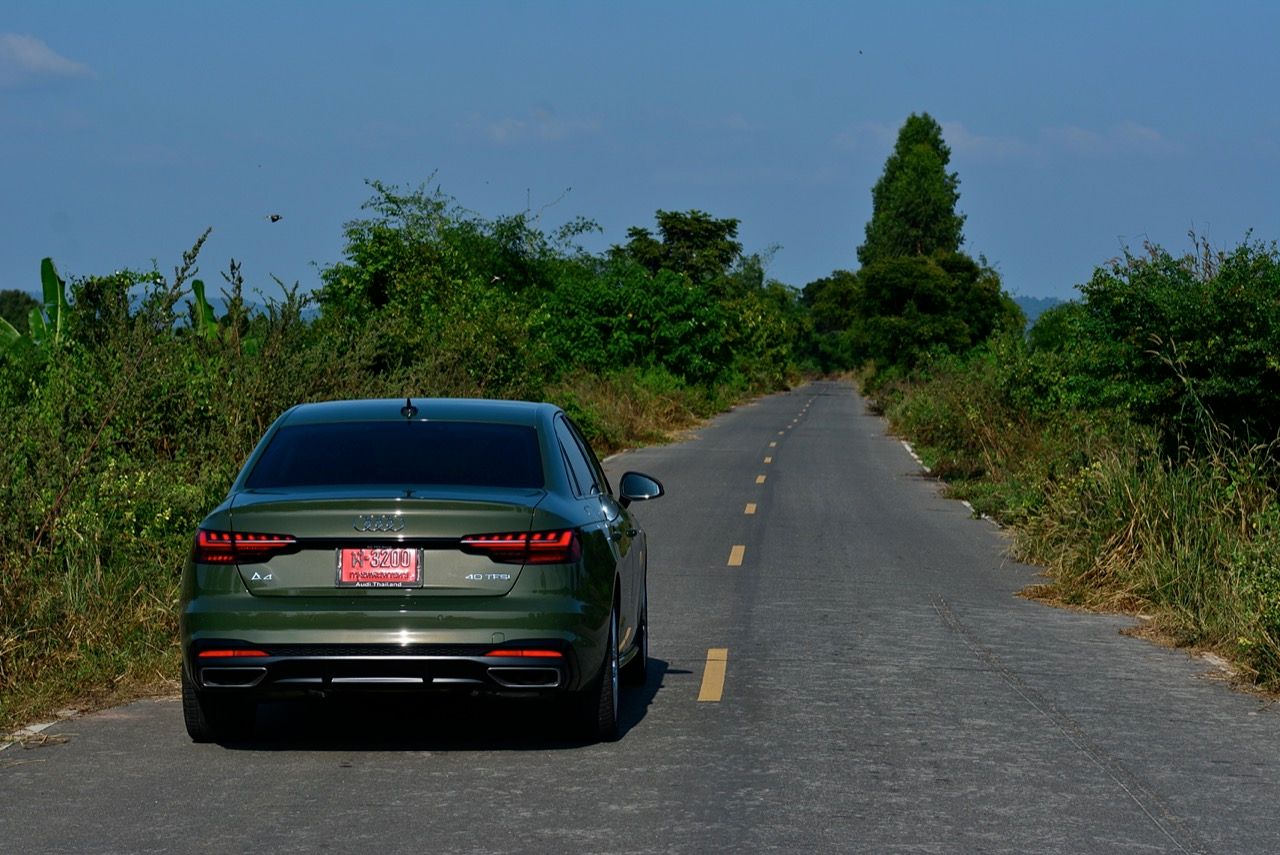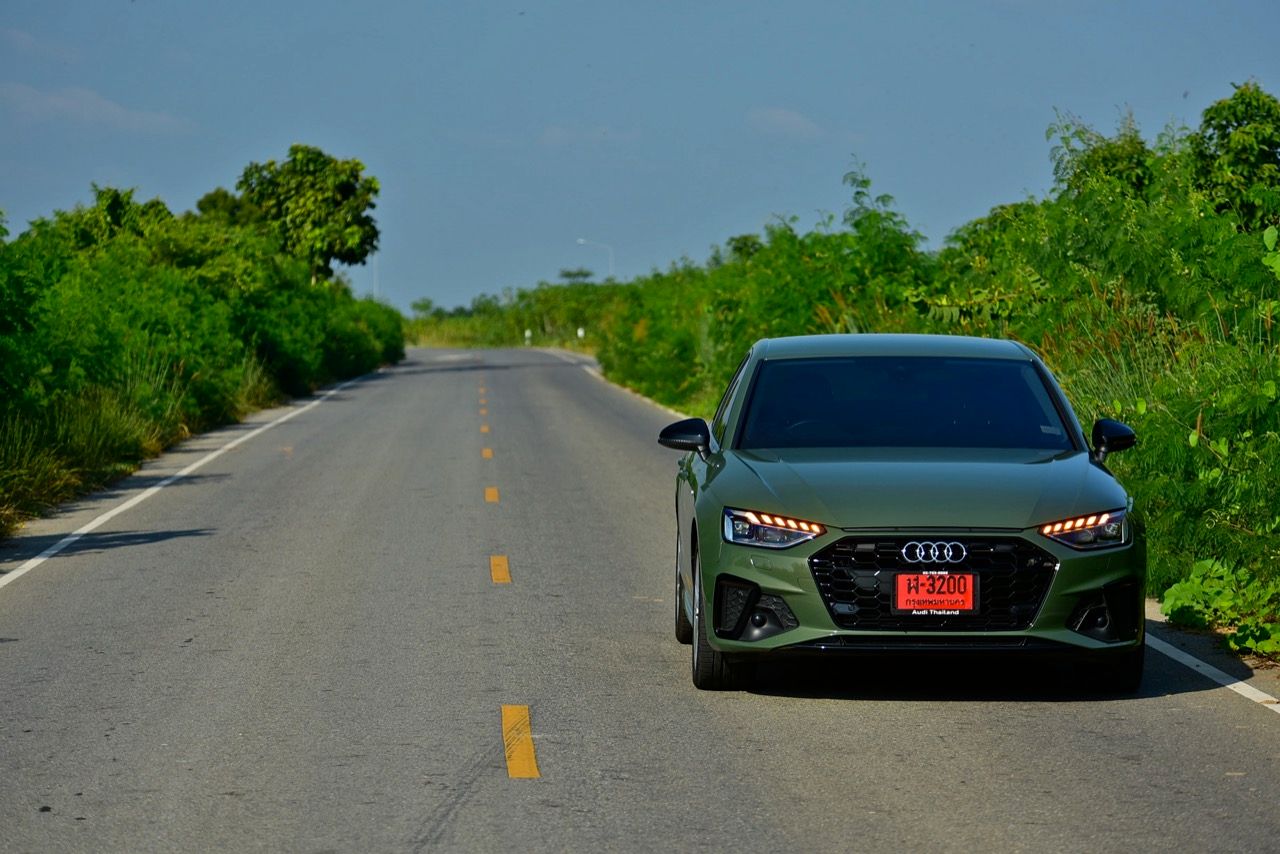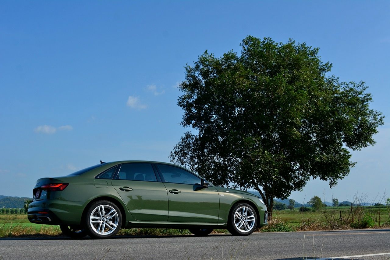 Audi A4 40TFSI S Line iCon Black สีเขียว District green มีห้องโดยสารที่ค่อนข้างเงียบและเป็นมิตร ความทันสมัยและรูปแบบแนวๆ ของงานตกแต่งภายในที่เป็นเอกเทศแตกต่างจากตราใบพัดหรือตราดาวอย่างชัดเจน เป็นห้องโดยสารที่เน้นความประณีตบรรจงในแบบที่ไม่เคยเกิดขึ้นมาก่อนแต่ก็ดูเก่าเพราะออกมาตั้งแต่ปี 2018 เครื่องยนต์เบนซินสองลิตรเทอร์โบ ทำงานเนียน มีเสียงออกแนวสุภาพเรียบร้อยในรอบต่ำและคำรามเบาๆ ทันทีที่ผมปรับโหมดไป Dynamic แก่นแท้ของรถคันนี้คือการทำความเร็ว การทรงตัวและความนิ่งเมื่อขับเร็ว ซึ่งเป็นความสามารถหลังพวงมาลัยที่ไม่เป็นรองรถคู่แข่ง A4 40TFSI ทำอัตราสิ้นเปลืองเชื้อเพลิงในโหมดสูงสุด Dynamic ตลอด 7 วันของการทดสอบ ลองขับเร็วจี๋ ทำได้ที่ 9.4 กิโลเมตรต่อลิตร พอขับเรื่อยๆ กิน 13.8 กิโลเมตรต่อลิตร ตรงนี้นี่น่ารักขึ้นมาเลยทีเดียว