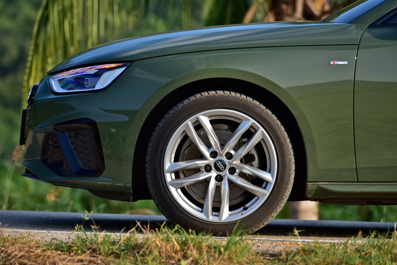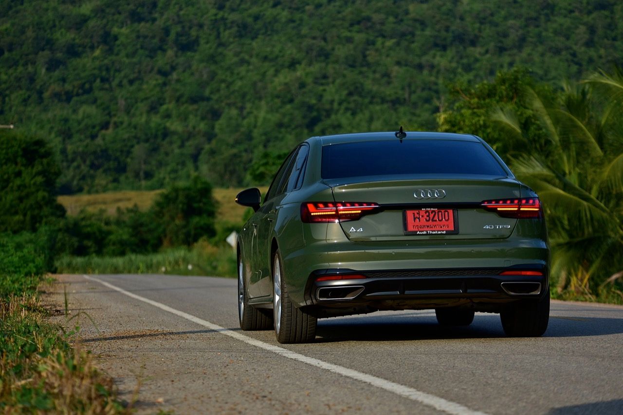 A4 ไหลลื่นด้วยเส้นข้างลำตัวลากจากมุมไฟหน้าผ่านบานประตูไปจนถึงมุมของไฟท้าย ไฟหน้ามาพร้อมระบบส่องสว่างอัตโนมัติ Matrix LED ให้แสงสีขาวสว่างสดใส มีแถบไฟวิ่งกลางวันที่เป็นเอกลักษณ์เฉพาะ สิ่งที่ชาญฉลาดเป็นพิเศษคือระบบ Matrix LED นี้สามารถหรี่หรือปิดการทำงานของ LED แต่ละดวงได้เมื่อตรวจพบรถคันอื่น เช่น ในเขตที่มีอาคารสูง เพื่อไม่ให้ผู้ขับขี่ที่สวนทางมาตาพร่ามัว ไม่มีสวิตช์เปิด/ปิดที่เหมือนกับฟังก์ชันไฟสูงทั่วไป ฟังก์ชันระบบไฟอัตโนมัติแบบใหม่เปลี่ยนลำแสงไปรอบ บริเวณต่างๆ บนถนนได้อย่างไหลลื่นและไม่รบกวนรถที่แล่นสวนทางมาหรือรถที่วิ่งอยู่ข้างหน้า จุดเด่นของระบบไฟใน A4 คือการส่องสว่างขอบถนนด้วยไฟสูงอย่างสว่างไสวโดยไม่ทำให้ผู้ขับขี่ที่สวนทางมาตาพร่ามัวไฟเลี้ยวก็ยังเป็นคุณสมบัติที่จดจำได้ง่ายที่สุดของชุดไฟและวิสัยทัศน์ ไฟเลี้ยวจะไล่จากด้านในสู่ด้านนอก Audi บอกว่าช่วยให้ผู้ขับระบุทิศทางที่รถเลี้ยวได้อย่างรวดเร็ว ช่วยเพิ่มความปลอดภัย เสาหน้าและเสาท้ายถูกรีดจนบางเฉียบ บานประตูทั้งสี่บริเวณขอบกระจกกรุทับด้วยงานอัลลอยสีดำ iCon Black เพื่อยกระดับความหรู ล้ออัลลอยขอบ 18 นิ้ว ลาย 10 ก้านคู่ ยางเกาหลียี่ห้อ Hankook รุ่น ventus s1 evo2 ไซส์ 245/40 R18 ไฟท้าย LED แบบใหม่คมกริบราวกับใบมีด ออกแบบให้เชื่อมโยงเหลี่ยมมุมบริเวณส่วนท้ายของตัวรถ A4 ได้อย่างกลมกลืน
