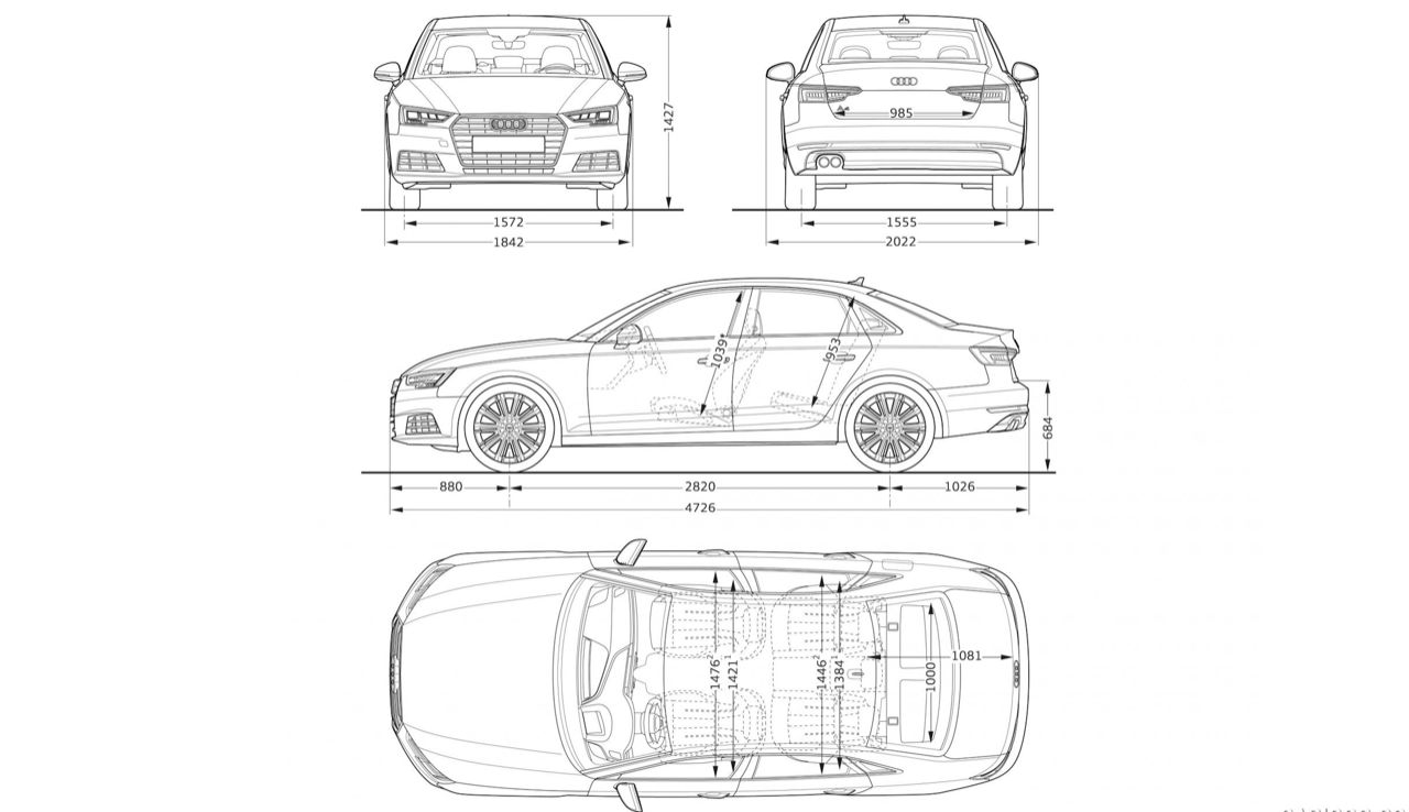 Audi A4 รุ่น 40 TFSI S-Line iCon Black เวอร์ชัน 2017 ราคา 2,699,000 บาท มาพร้อมกับเรือนร่างที่สมส่วน มิติตัวถังมีความกว้าง 1,847 มิลลิเมตร ยาว 4,762 มิลลิเมตร สูง 1,428 มิลลิเมตร ความกว้างฐานล้อ วัดจากดุมหน้าไปหลัง 2,820 มิลลิเมตร ความกว้างฐานล้อหน้า 1,572 มิลลิเมตร ส่วนความกว้างฐานล้อหลังอยู่ที่ 1,555 มิลลิเมตร น้ำหนัก 1,490 กิโลกรัม ขนาดของตัวรถใกล้เคียงกับ BMW Series-3 G20 LCI และ Mercedes Benz C-Class W206 สำหรับ A4 รุ่น 40 TFSI ใช้ระบบขับเคลื่อนสองล้อหน้า เสริมความคมเข้มด้านมุมมองด้วยอุปกรณ์ตกแต่งของ S-Line ไล่เรียงจากสปอยเลอร์หน้า-หลัง ล้ออัลลอยขอบ 18 นิ้ว กาบบันได ไฟหน้า Matrix ที่มีความเฉียบคมของงานดีไซน์ในรุ่น Facelift กระจังหน้าทรงหกเหลี่ยม สัญลักษณ์ของ Audi รุ่นใหม่ และความสามารถในการขับเคลื่อนจากเครื่องยนต์เบนซิน 2 ลิตร อัดอากาศด้วยเทอร์โบ