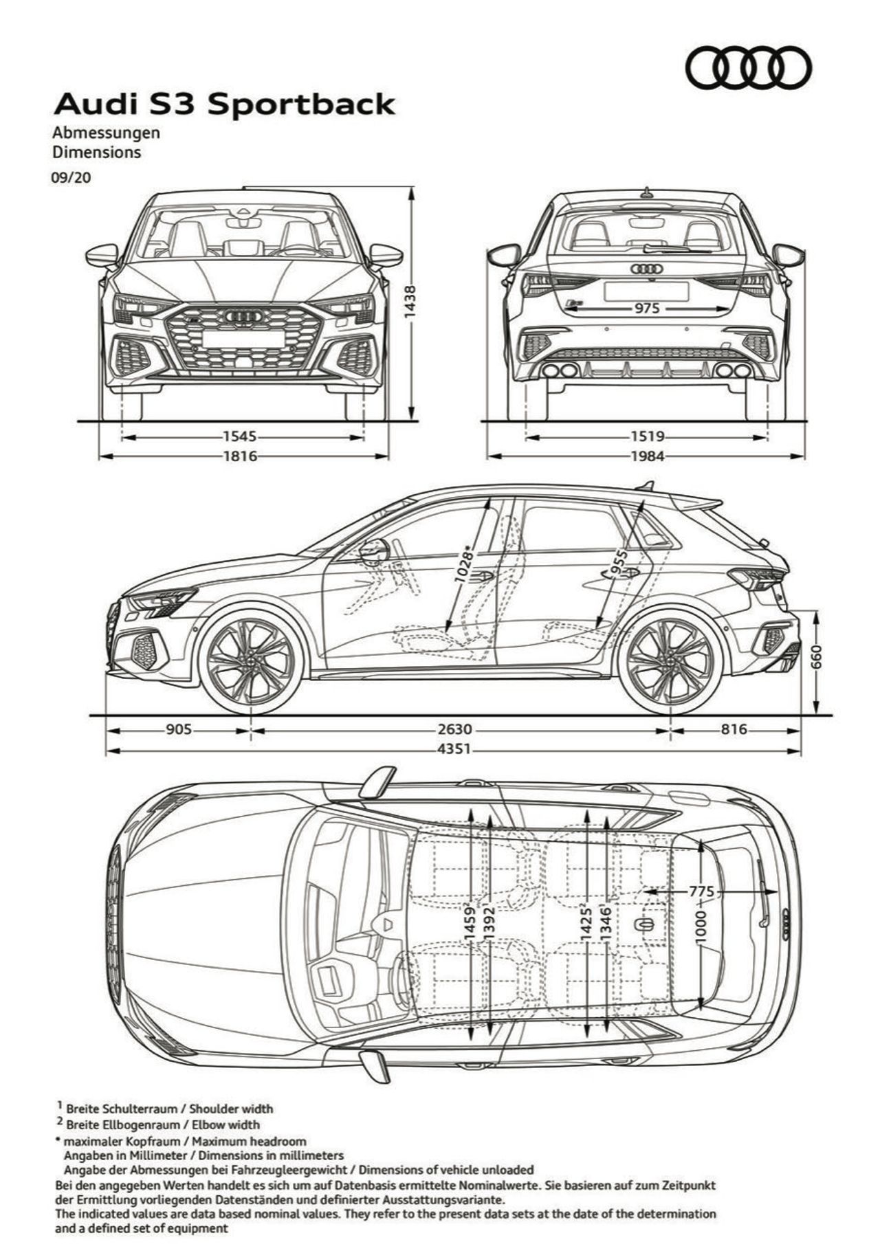 เทียบกับรุ่นก่อน S3 Sportback และ S3 Saloon ใหม่ยาวขึ้น 3 ซม. และ 4 ซม. ตามลำดับ ในขณะที่ S3 Sportback กว้างขึ้น 3 ซม. และ Saloon ยาวขึ้น 2 ซม. ตามลำดับ ระยะฐานล้อเท่ากันที่ 2,630 มม. ซึ่งมีพื้นที่ความกว้างตัวถังมากกว่ารุ่นก่อนหน้าเล็กน้อย พื้นที่เก็บสัมภาระ 370 ลิตรในรุ่น Sedan และพื้นที่เก็บสัมภาระ 325 และ 1,145 ลิตรในรุ่น Sportback ขึ้นอยู่กับการพับหรือไม่พับเบาะหลัง
