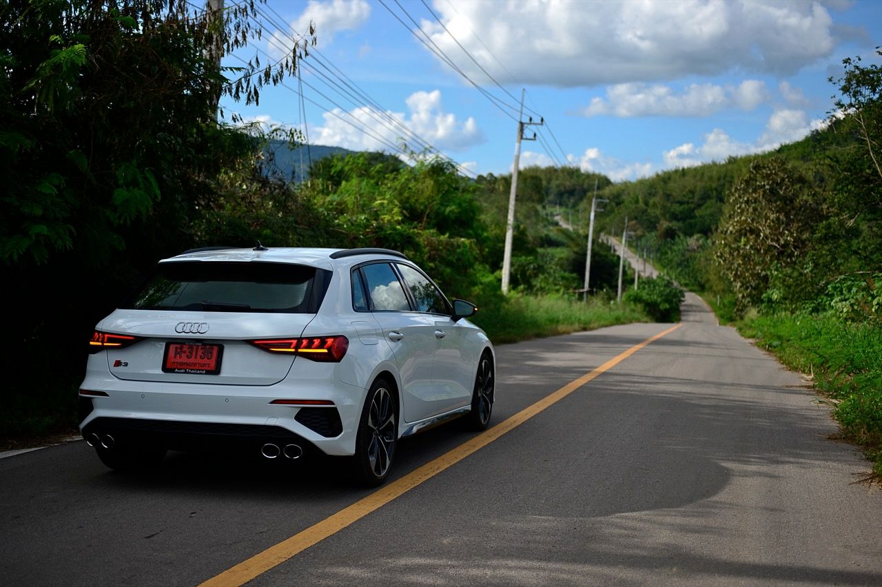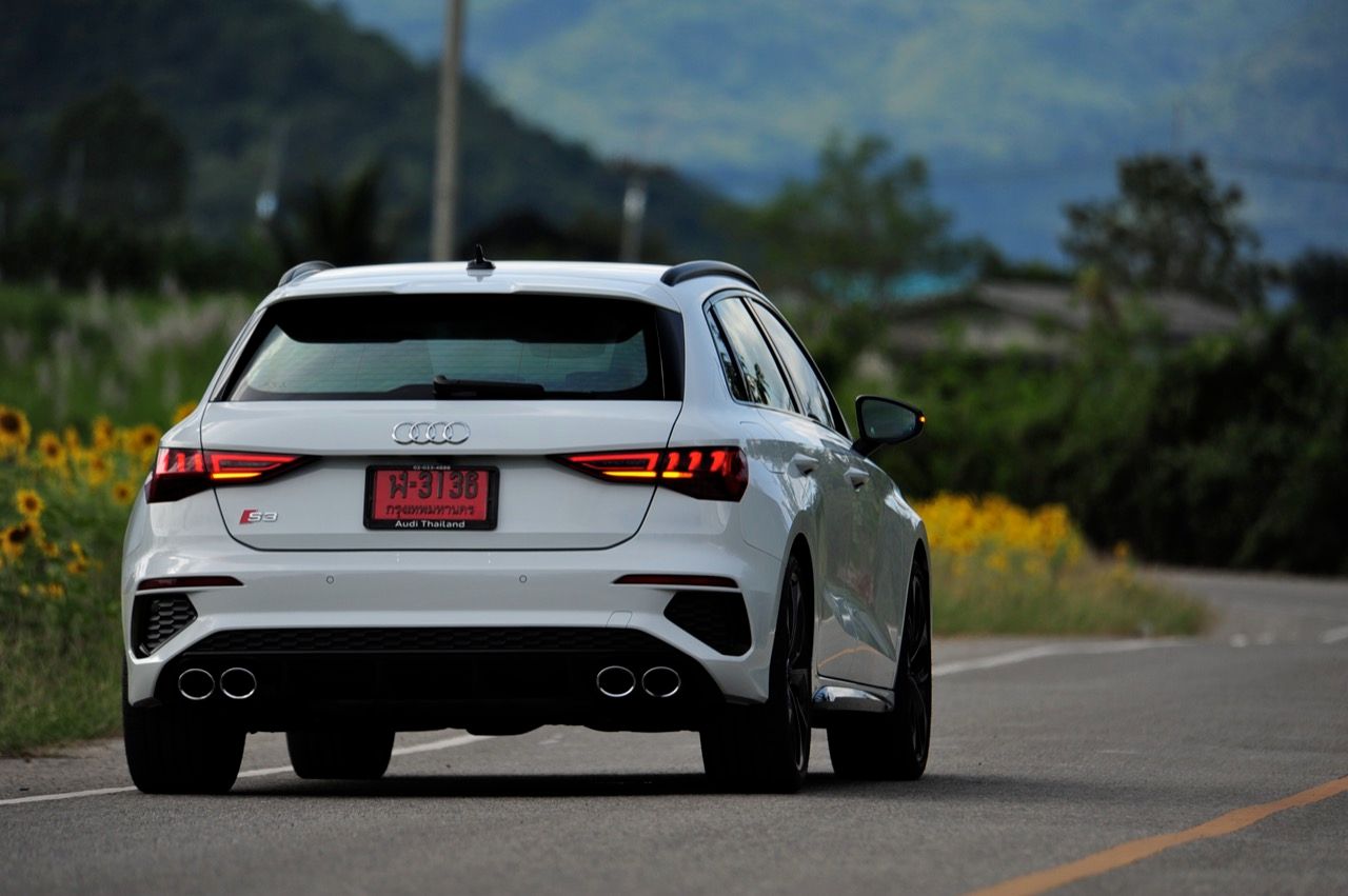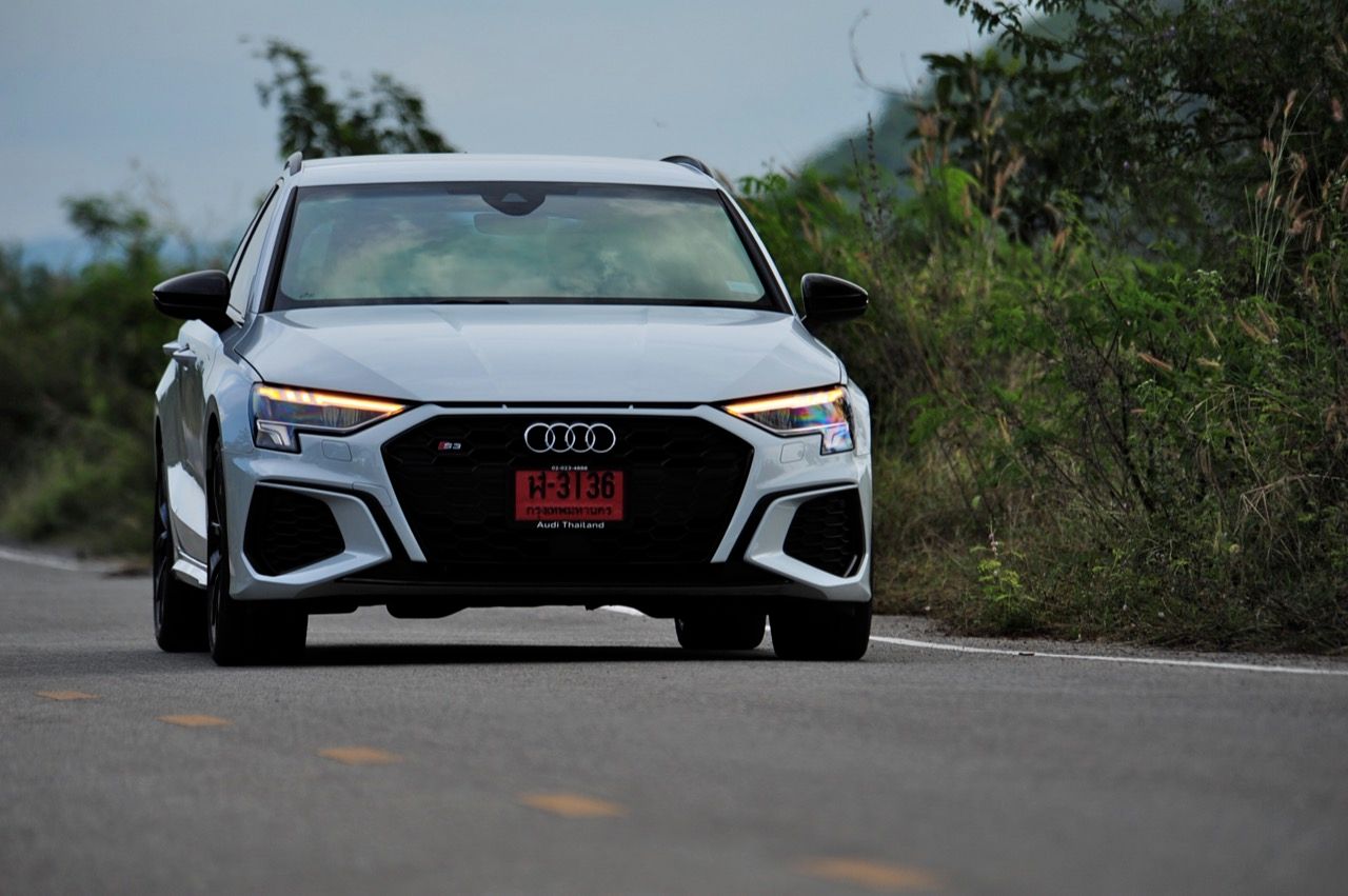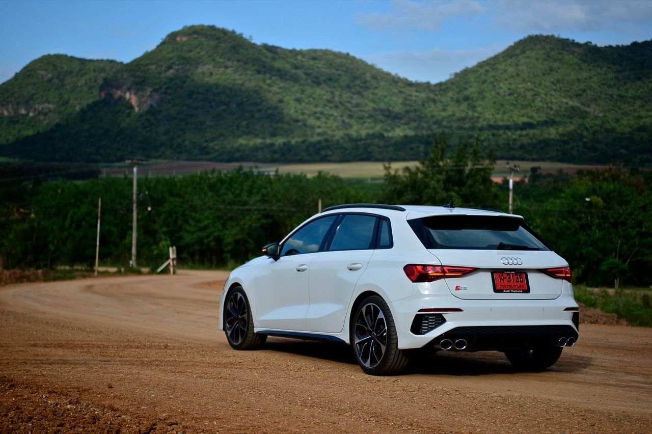Quattro ของ Audi ระหว่างการทดลองขับ จากการควบคุมที่ทำให้รถมีน้ำหนักเบา ทำให้ระบบส่งกำลังไม่ต้องรับภารกรรมมากเกินไป กลายเป็นความกระปรี้กระเปร่า กระตือรือร้น และส่งเสียงดังในโหมด Dynamic ในย่านความเร็วสูง การบังคับเลี้ยวที่หนักหน่วงใน S3 นั้นให้การตอบสนองที่ดี ออกตัวเร็วๆ จากจุดหยุดนิ่งหรือเร่งแซงรถช้ามีอาการเทอร์โบแล็กไม่มากนัก เมื่อขับในโหมดสูงสุดมันเร่งความเร็วคอร์เตอรไมล์ใน 12.9 วินาที ที่ 173 กิโลเมตรต่อชั่วโมง ด้วยความเร็วขนาดนั้นส่วนหน้าของรถก็ยังนิ่งสนิท อาการโคลงตัวน้อย มันพุ่งเข้าหาหัวโค้งด้วยความหิวกระหายและมาดมั่น เหนือชั้นกว่ารถขับหน้าหรือขับหลังพลังสูงทั้งปวงที่เคยเป็นคู่แข่ง เอาเข้าจริงๆ ผมชอบมันมากกว่า TT RS ที่มีพลังงานมากกว่า แต่ก็ควบคุมได้ไม่เนียนตาเท่า S3 Sportback อาจเป็นเพราะแรงม้าแรงบิดที่มีความสมดุลกับขนาดตัวถังและน้ำหนักมวลรวม รวมถึงการจูนระบบรองรับที่เฉียบคมเพื่อสอดรับกับการทำความเร็ว