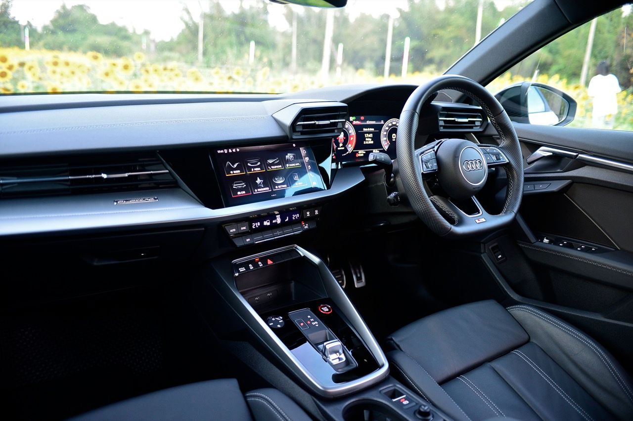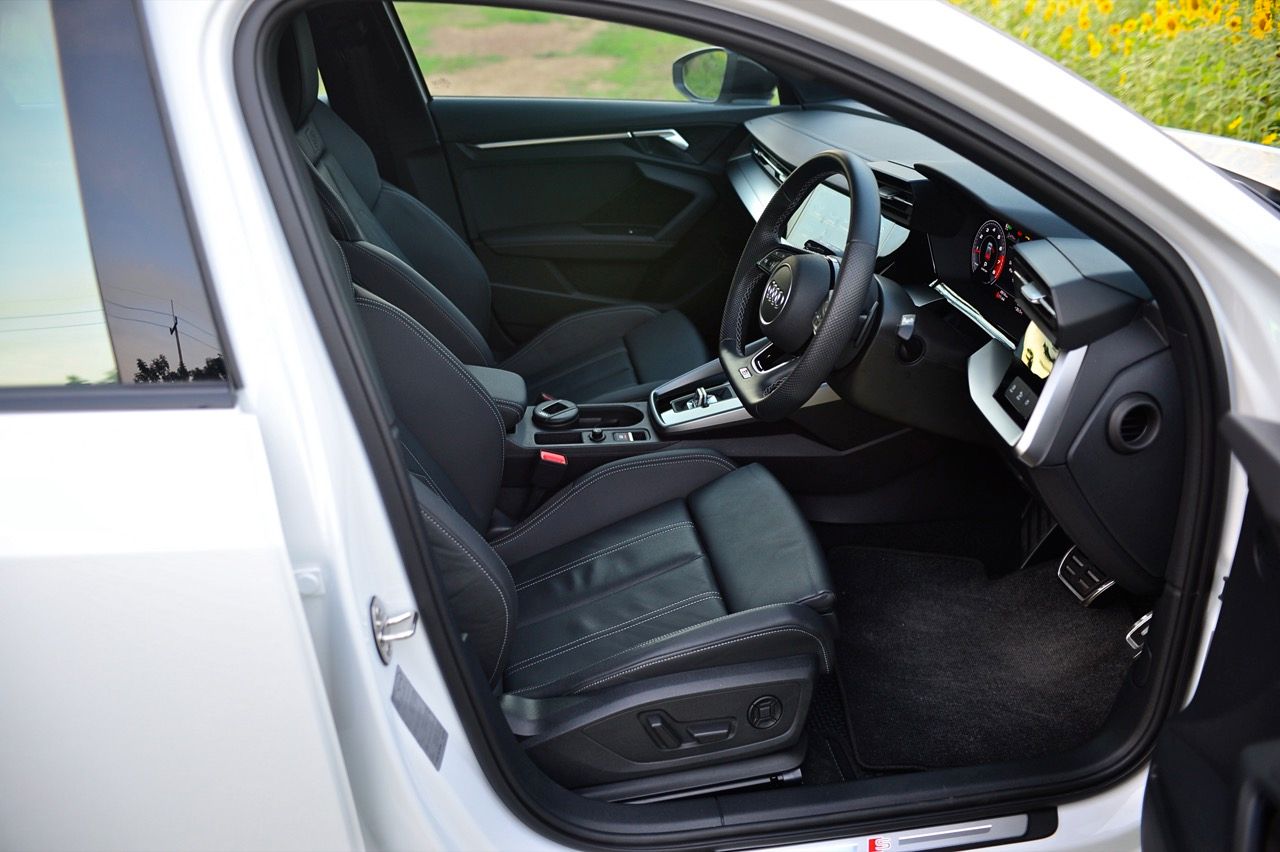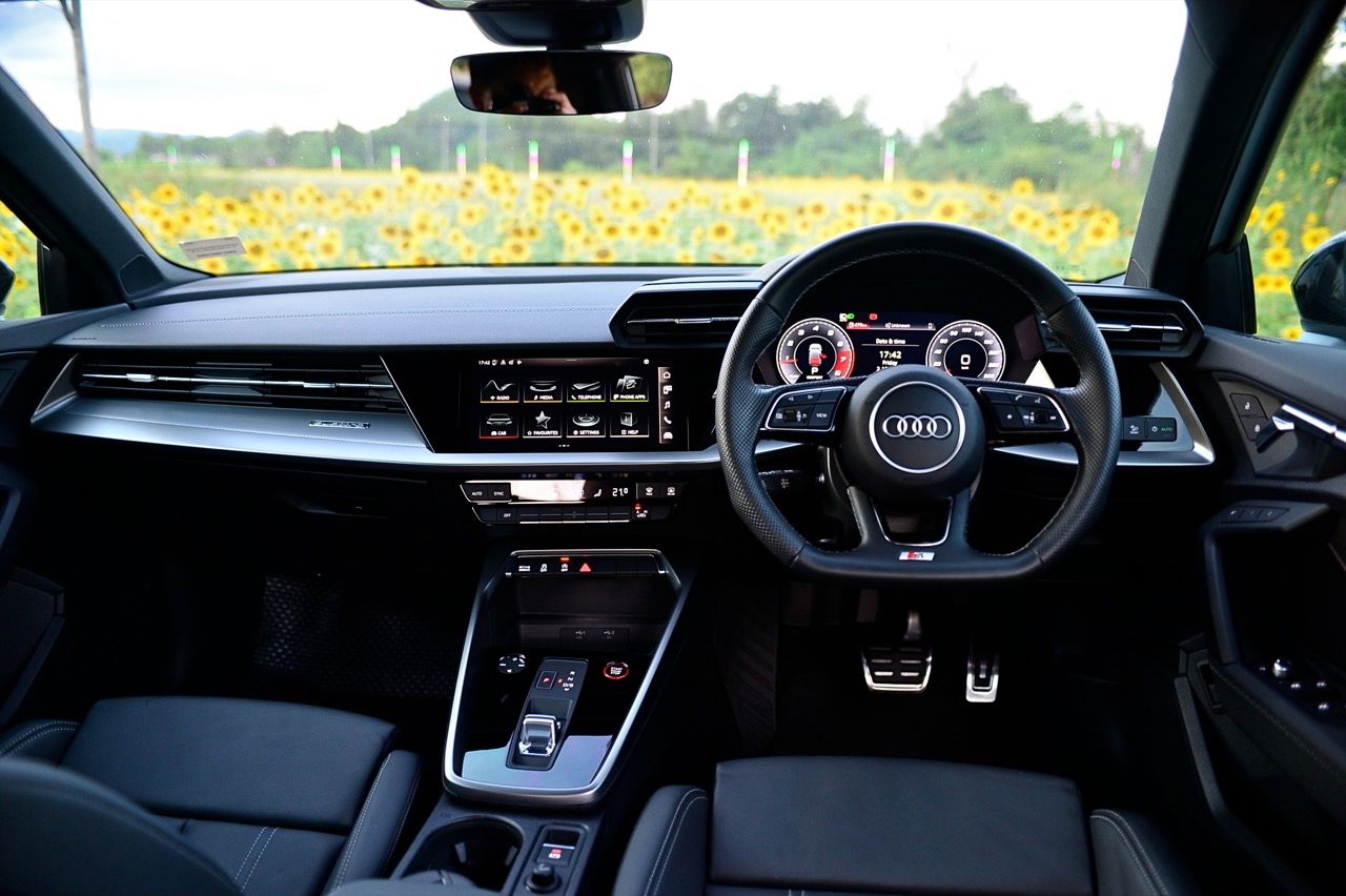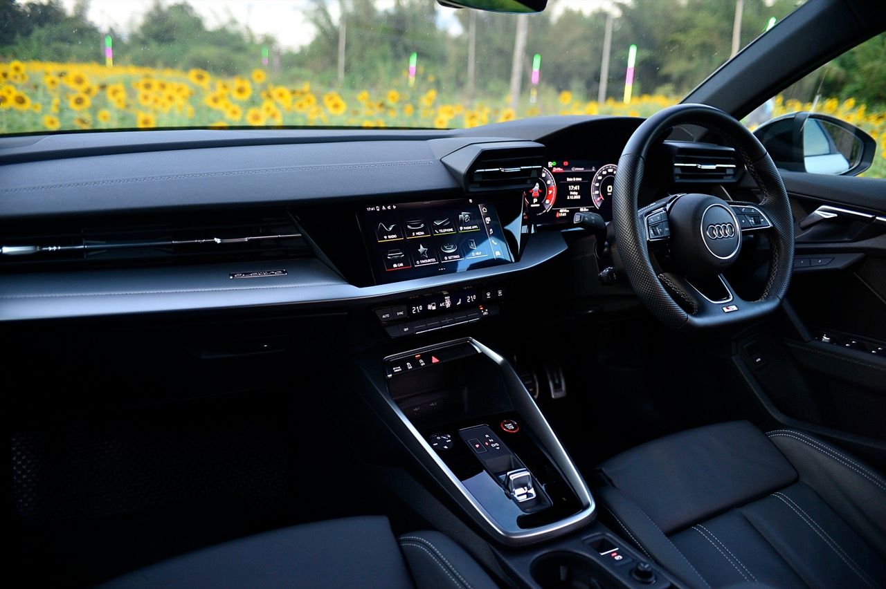 ตำแหน่งนั่งขับนั้นสุดยอด ไม่ว่าจะตัวเตี้ยหรือสูงโย่ง เบาะไฟฟ้าก็ยังปรับได้อย่างครอบคลุมทุกสรีระ หนังและวัสดุพวกฟองน้ำภายในเบาะนั่งให้การรองรับที่สมดุล สำหรับการเดินทางไกลหรือสร้างความกระชับเมื่อคุณขับแบบเร่งรีบ แผงหน้าปัดดิจิตอลความละเอียดสูงซึ่งใหญ่กว่ารุ่น A3 ปกติเล็กน้อย สามารถแสดงผล Google Maps, ข้อมูลเกี่ยวกับสื่อ หรือแสดงผลมาตรวัดความเร็วและมาตรวัดรอบแบบคลาสสิกที่อ่านค่าได้ง่าย หน้าจอสัมผัสกลางมีการทำงานที่ลื่นไหล ให้การตอบสนองรวดเร็วแบบเดียวกับ A6 และ Q7 ที่ใหญ่และแพงกว่า การเชื่อมต่อ Apple CarPlay แบบไร้สายอย่างรวดเร็ว การคลิกแบบสัมผัสหลังจากกดไอคอนให้ความรู้สึกดี ด้านล่างหน้าจอสัมผัสเป็นพ็อดควบคุมอุณหภูมิภายในห้องโดยสารแบบเรียบง่าย พร้อมปุ่มแต่ไม่มีแป้นหมุน
