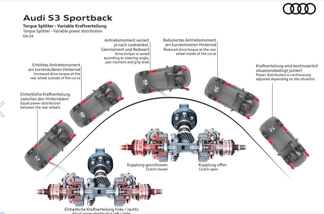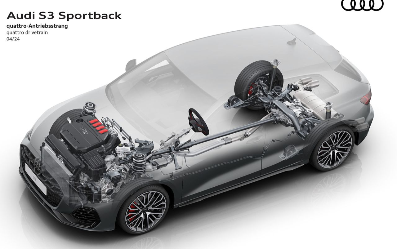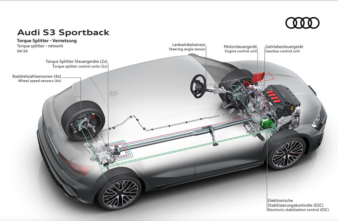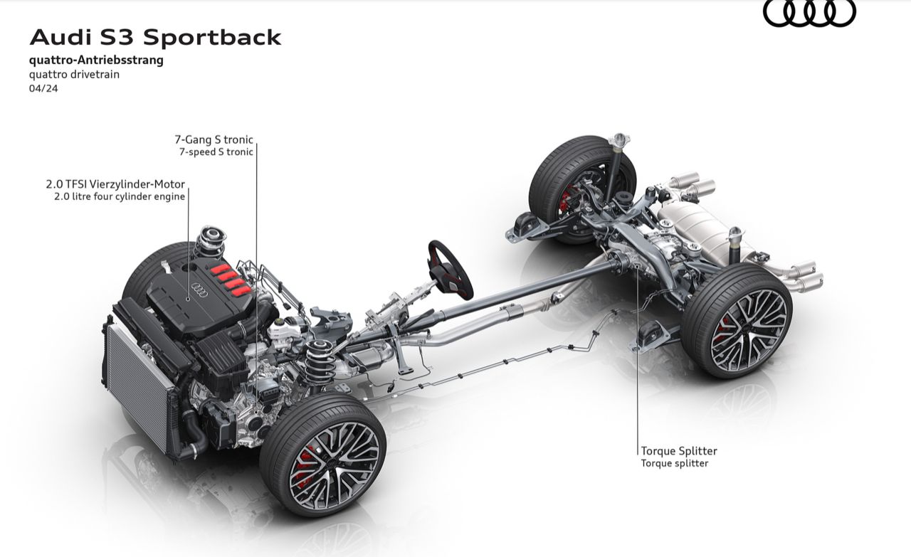 ตราสัญลักษณ์ S มาพร้อมกับศักยภาพที่แตกต่างจากรถยนต์รุ่นมาตรฐานของ Audi ระบบขับเคลื่อนสี่ล้อ quattro ก็เช่นกัน ในกรณีนี้ การทำงานของมันขึ้นอยู่กับคลัตช์แบบหลายแผ่นทับซ้อนกันที่ด้านหน้าของเพลาหลัง ซึ่งจะกระจายแรงบิดในการขับเคลื่อนระหว่างเพลาแบบแปรผันอย่างเต็มที่ตามต้องการ ความรับผิดชอบในการจัดการขึ้นตรงกับระบบควบคุมชุดใหม่ นั่นคือการควบคุมการจัดการไดนามิกแบบโมดูลาร์ ซึ่งเชื่อมโยงชุดขับเคลื่อนสี่ล้อ quattro กับระบบควบคุมเสถียรภาพทางอิเล็กทรอนิกส์ (ESC) รวมกับโช้คอัพไฟฟ้าใน S3 รุ่น Vorsprung ระบบเบรกสำหรับรถยนต์ที่ให้สมรรถนะระดับ 300 แรงม้า จานเบรกทั้งสี่ของ S3 มีช่องระบายอากาศภายใน คาลิปเปอร์ด้านหน้ามีสีดำหรือแดงเป็นอุปกรณ์มาตรฐาน (คันทดสอบมีคาลิปเปอร์เบรกสีแดง) ล้อสีดำสลับสีเงินเงาแวบขนาด 19 นิ้ว ลาย 10 ก้านคู่