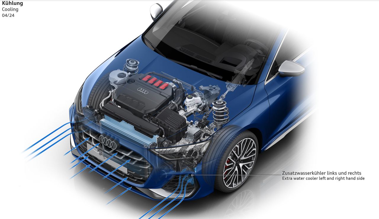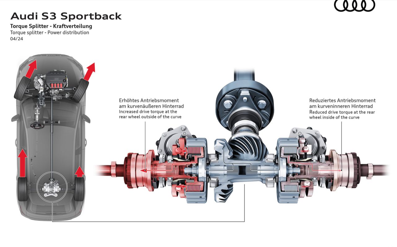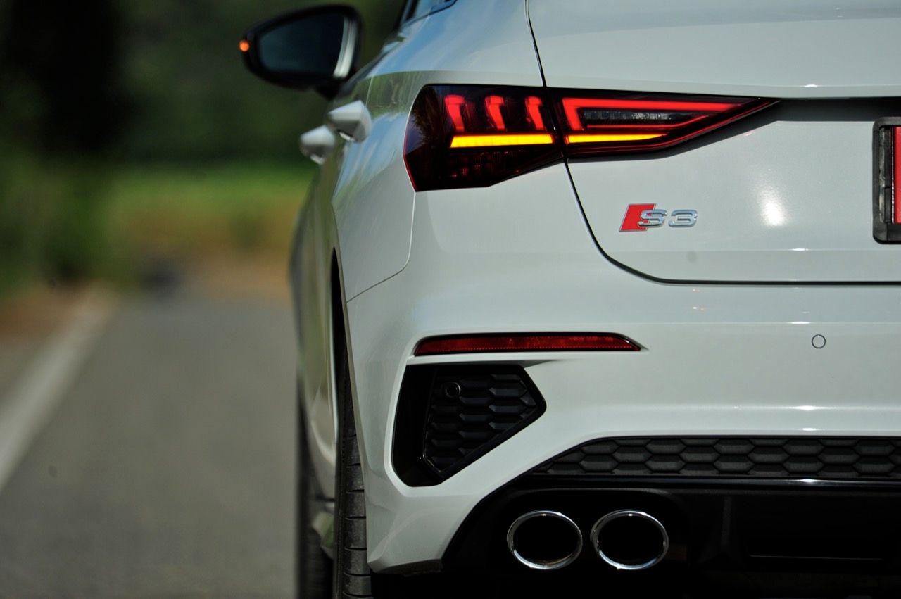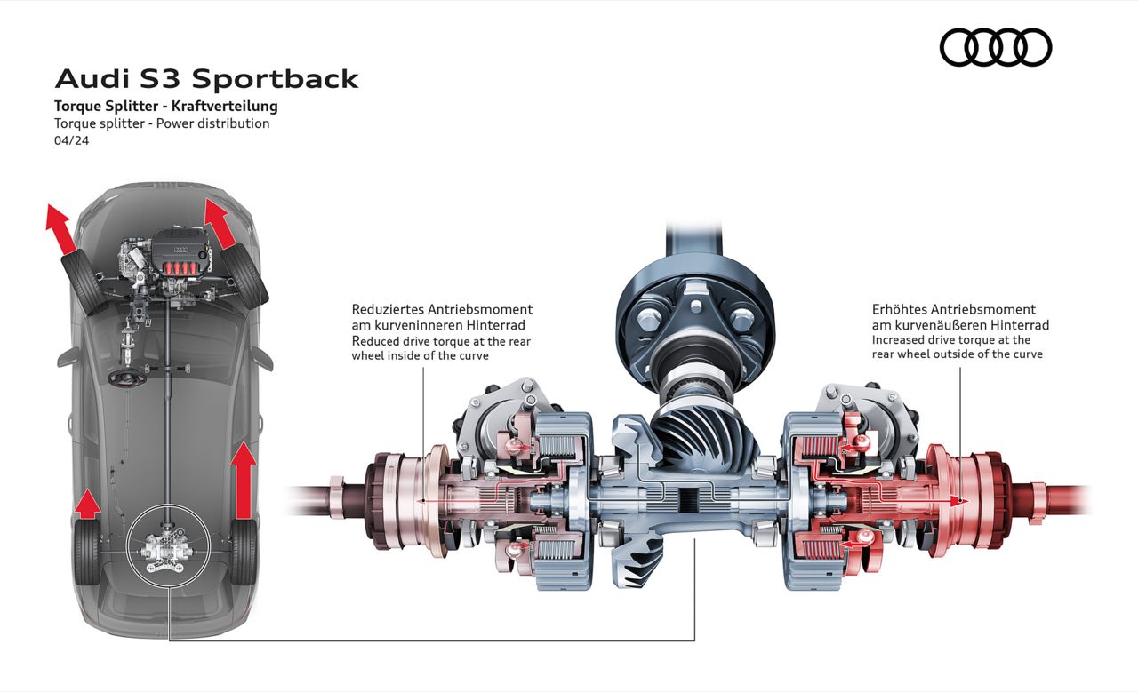 ตราสัญลักษณ์ S มาพร้อมกับศักยภาพที่แตกต่างจากรถยนต์รุ่นมาตรฐานของ Audi ระบบขับเคลื่อนสี่ล้อ quattro ก็เช่นกัน ในกรณีนี้ การทำงานของมันขึ้นอยู่กับคลัตช์แบบหลายแผ่นทับซ้อนกันที่ด้านหน้าของเพลาหลัง ซึ่งจะกระจายแรงบิดในการขับเคลื่อนระหว่างเพลาแบบแปรผันอย่างเต็มที่ตามต้องการ ความรับผิดชอบในการจัดการขึ้นตรงกับระบบควบคุมชุดใหม่ นั่นคือการควบคุมการจัดการไดนามิกแบบโมดูลาร์ ซึ่งเชื่อมโยงชุดขับเคลื่อนสี่ล้อ quattro กับระบบควบคุมเสถียรภาพทางอิเล็กทรอนิกส์ (ESC) รวมกับโช้คอัพไฟฟ้าใน S3 รุ่น Vorsprung ระบบเบรกสำหรับรถยนต์ที่ให้สมรรถนะระดับ 300 แรงม้า จานเบรกทั้งสี่ของ S3 มีช่องระบายอากาศภายใน คาลิปเปอร์ด้านหน้ามีสีดำหรือแดงเป็นอุปกรณ์มาตรฐาน (คันทดสอบมีคาลิปเปอร์เบรกสีแดง) ล้อสีดำสลับสีเงินเงาแวบขนาด 19 นิ้ว ลาย 10 ก้านคู่
