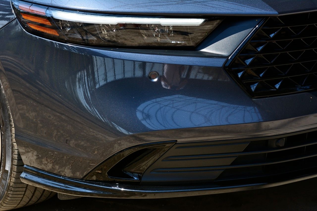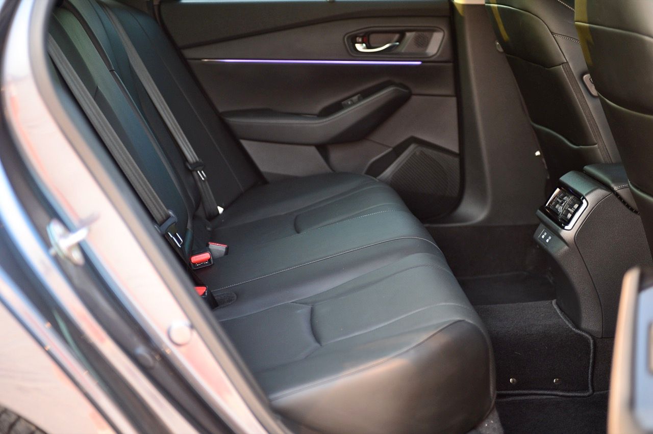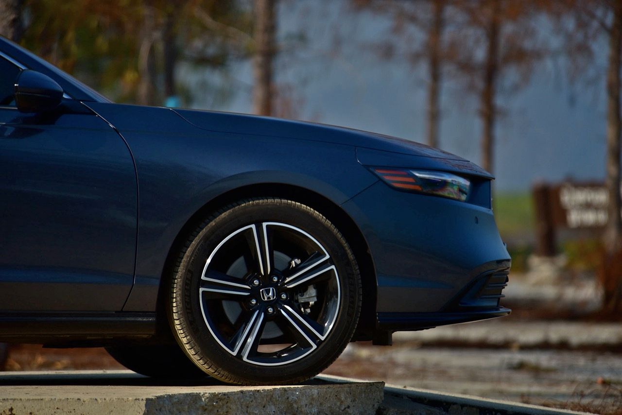 Accord 2024 รุ่นพระรอง EL e:HEV นั้น แตกต่างจากรุ่นท็อป RS e:HEV โดยมีการออกแบบใหม่ทั้งคัน ส่วนหน้าใหม่พร้อมกระจังหน้าทรงเหลี่ยมและไฟหน้า LED เพรียวบาง เส้นสายตัวถังที่ช่วยเสริมหลักอากาศพลศาสตร์ ไฟท้าย LED แบบเชื่อมต่อกันทั้งสองฝั่งซ้าย-ขวา เป็นรูปแบบไฟท้ายที่กำลังได้รับความนิยม ทั้งรถยนต์ไฟฟ้าของจีนและรถยนต์บางรุ่นของยุโรปที่มีดีไซน์ไฟท้ายในลักษณะดังกล่าว ท่อไอเสียคู่ ซึ่งทำให้มีรูปลักษณ์ส่วนท้ายค่อนข้างลงตัว มิติตัวถังมีขนาดใหญ่ขึ้นเล็กน้อย โดยมีความยาว 4,971 มิลลิเมตร กว้าง 1,862 มิลลิเมตร สูง 1,450 มิลลิเมตร ความยาวฐานล้อ 2,830 มิลลิเมตร ยาวกว่า G10 รุ่นที่ผ่านมา 71 มิลลิเมตร ล้ออัลลอย ขอบ 18 นิ้ว ยาง Michelin e Primacy 235/45R18 ขนาดล้อและยางเท่ากับ RS e:HEV ดูที่ความยาวระดับใกล้เคียง 5 เมตร บวกความกว้างอีกเฉียดๆ 2 เมตร (ยังไม่รวมกระจกมองข้าง) ไม่ต้องสงสัยในเรื่องของความโปร่งโล่งในห้องโดยสารกันเลยทีเดียว ถือเป็น Accord ที่ตัวโตที่สุดเท่าที่ Honda เคยผลิตออกมาขายถึง 10 รุ่น