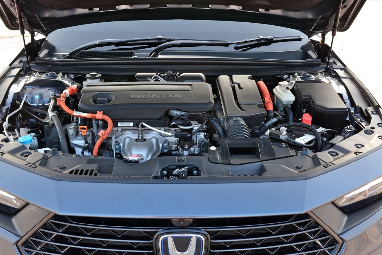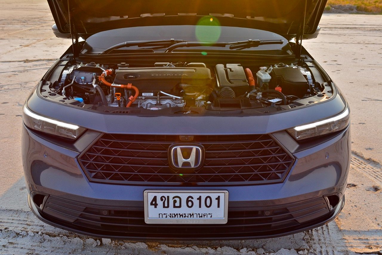 เครื่องยนต์เบนซินแถวเรียงสี่สูบ ความจุ 2.0 ลิตร จับคู่กับมอเตอร์สองตัว ตัวแรกเป็นมอเตอร์เจเนอเรเตอร์หรือเครื่องกำเนิดไฟฟ้า มอเตอร์ตัวที่สองขับเคลื่อนผสมผสานแรงบิดร่วมกับเครื่องยนต์สองลิตรไฮบริด ทำให้ Accord Hybrid e:HEV มีกำลัง 207 แรงม้า อัตราเร่ง 0-100 กิโลเมตรต่อชั่วโมงใน 7.9 วินาที เป็นตัวเลขที่เหมาะสมค่อนข้างไปทางมีประสิทธิภาพ เมื่อพิจารณาถึงขนาดที่ใหญ่โตของรถ เครื่องยนต์และมอเตอร์ขับเคลื่อนมีแรงบิด 335 นิวตันเมตร แรงบิดของทั้งสองระบบโผล่ออกมาแบบฉับพลันทันที ทำให้ Accord e:HEV คล่องตัวและเร่งความเร็วได้ดีขึ้นจนรู้สึกได้ ขุมกำลังพลังงานผสม e:HEV เครื่องยนต์มีกำลัง 147 แรงม้า แรงบิด 182 นิวตันเมตร ผสานการส่งแรงบิดเสริมของมอเตอร์มอบอัตราเร่งที่ดี ส่งผลทำให้ Accord RS e:HEV เร็วกว่า Toyota Camry 2.5 Hybrid