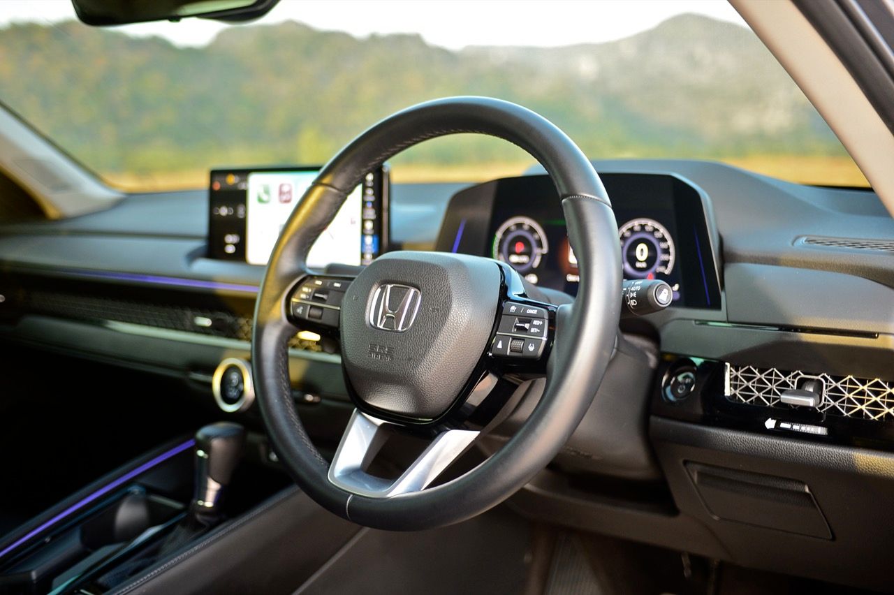 พวงมาลัยมีน้ำหนักดี ให้ความรู้สึกแม่นยำและตอบสนองต่อการหักเลี้ยวได้ราวกับ Civic RS e:HEV โหมดขับขี่ มีให้เลือก 4 โหมด ได้แก่ Normal, Econ, Sport และ EV ซึ่งถ้าเลือกโหมดขับเคลื่อนแบบไฟฟ้า หากมีไฟมากพอในแบตเตอรี่ไฮบริด คุณสามารถขับเจ้า Accord ด้วยความเร็วต่ำแบบไร้มลพิษได้ไกล 2-3 กิโลเมตร ที่ความเร็ว 30-40 กิโลเมตรต่อชั่วโมง โหมดสปอร์ต ทำให้น้ำหนักของพวงมาลัยไฟฟ้าหนักขึ้นเล็กน้อย เป็นการเตรียมความพร้อมสำหรับการปรับน้ำหนักของพวงมาลัยให้สมดุลในย่านความเร็วสูง นั่นก็คือไม่เบาจนทำให้หน้ารถไวมากเกินไปจากการขยับพวงมาลัยเพียงเล็กน้อย ในโหมดสูงสุด ECU จะสั่งงานให้ระบบส่งกำลังตอบสนองดีขึ้น (เล็กน้อย) ในขณะที่โหมด Econ สมองกลของระบบจะผ่อนคลายการตอบสนองลง เพื่อเน้นประหยัดน้ำมันเชื้อเพลิง โหมด EV มีไว้เหมือนจะฟุ้งว่า มอเตอร์ไฟฟ้าเพียวๆนั้นวิ่งได้นะ แต่อย่าลืมว่าแบตเตอรี่ไฮบริดของ Accord e:HVE มีขนาดเล็ก ทำให้การวิ่งด้วยมอเตอร์เพียวๆ ไปได้ไม่ไกลมากนัก เหมาะกับการขับในเมืองท่ามกลางการจราจรที่เดี๋ยวหยุด เดี๋ยวเคลื่อนตัวมากกว่า