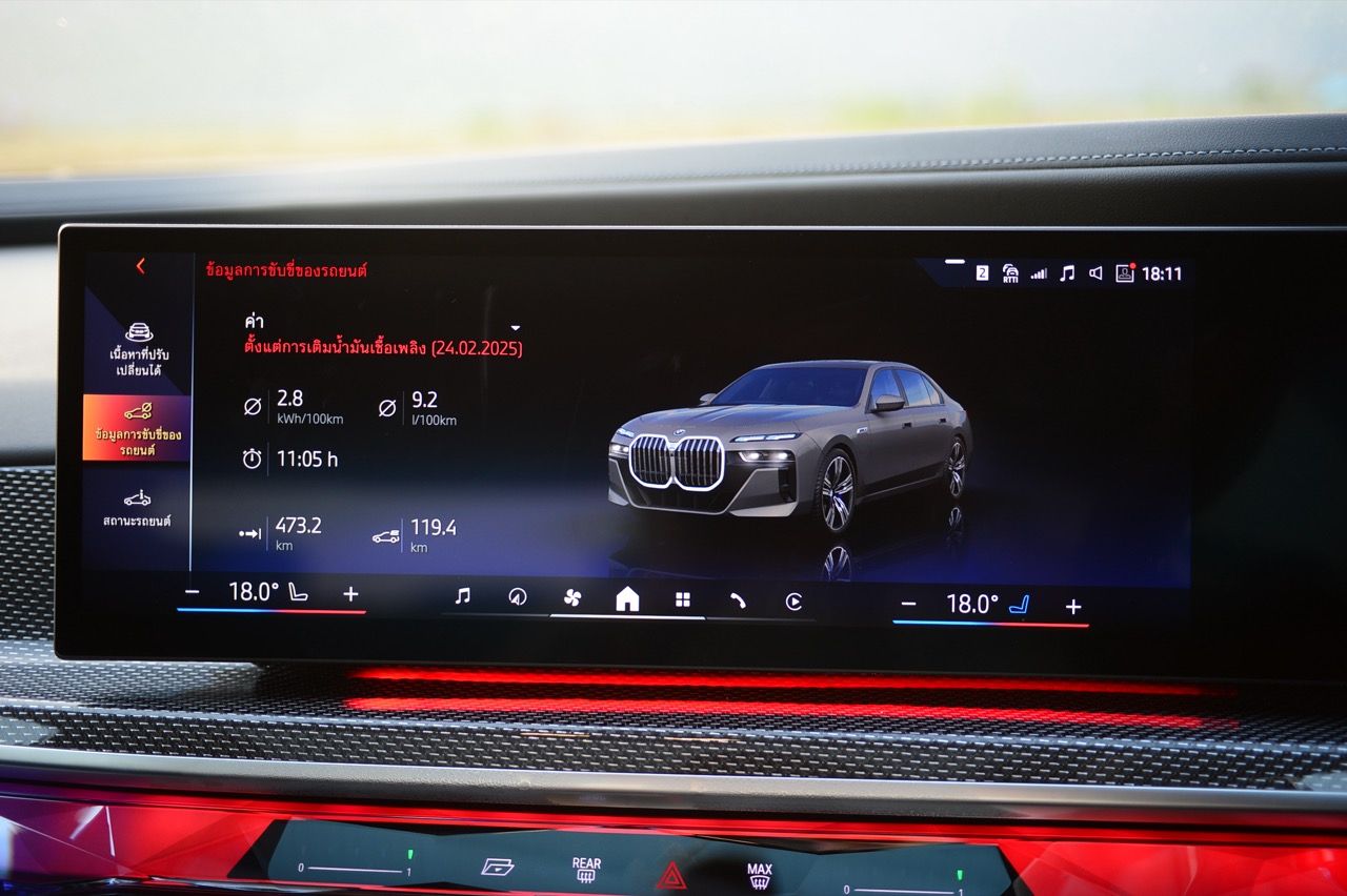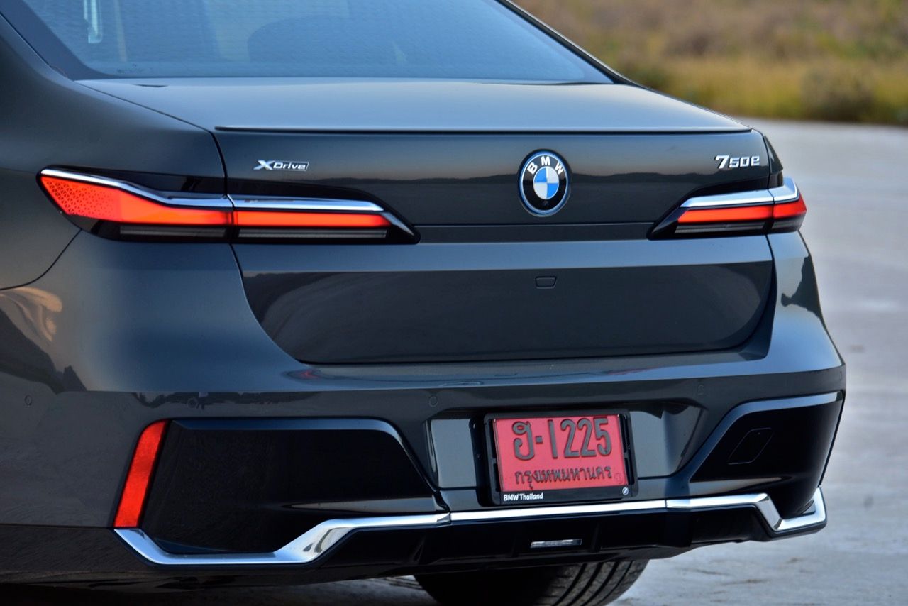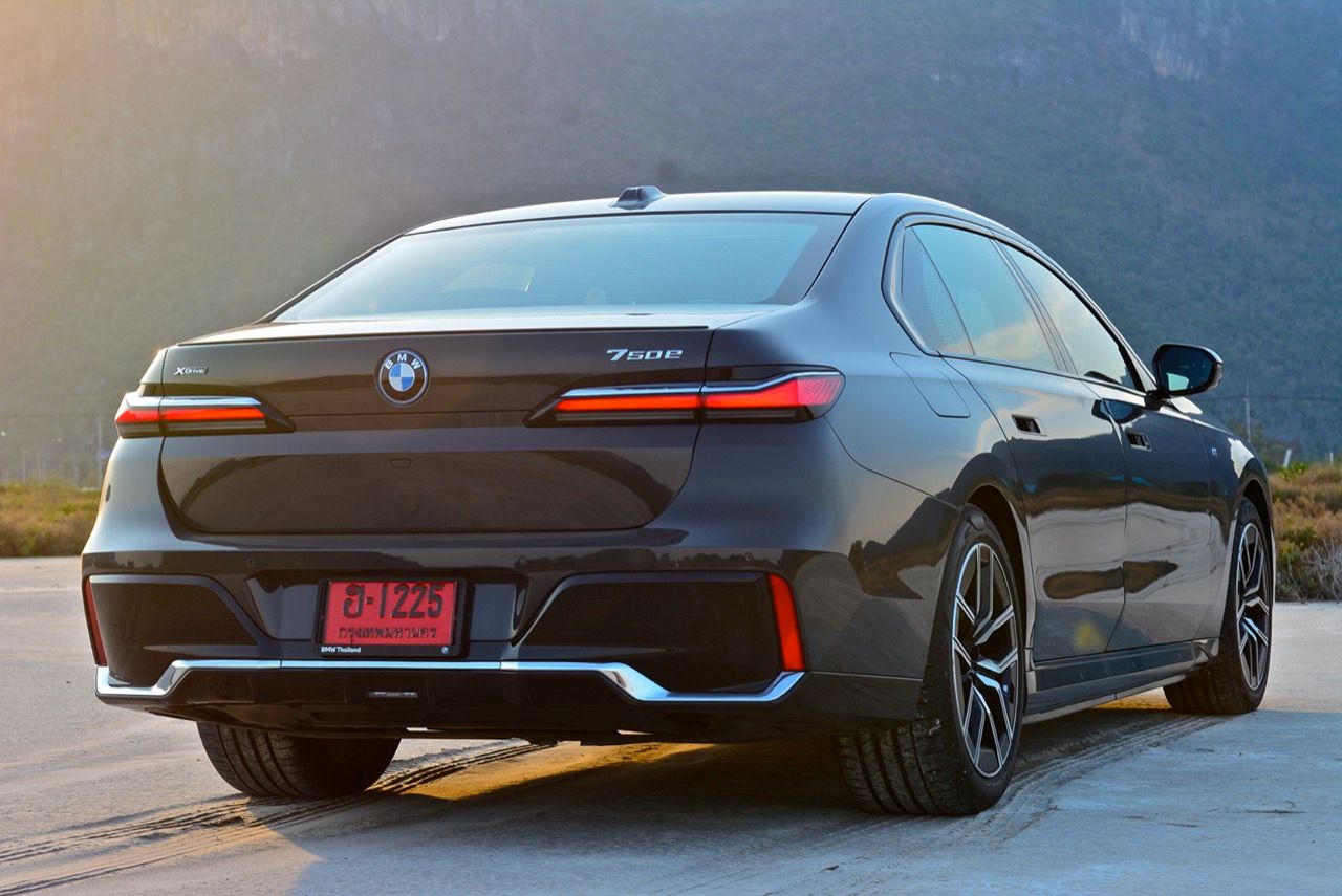 BMW กำหนดนิยามใหม่ของรถยนต์ในเซกเมนต์พรีเมียมรหัส G70 ด้วยระบบขับเคลื่อนพลังงานผสม เครื่องยนต์ผสานมอเตอร์ไฟฟ้าในระบบปลั๊กอินไฮบริด PHEV ที่เน้นความหรูหราสะดวกสบาย ระบบดิจิทัลแบบใหม่ ระบบความปลอดภัยครอบคลุมการใช้งาน BMW 750e xDrive M Sport 2025 ราคา 7,039,000 บาท บาท มิติตัวถัง ยาว 5,391 มิลลิเมตร กว้าง 1,950 มิลลิเมตร สูง 1,544 มิลลิเมตร ความยาวฐานล้อ 3,215 มิลลิเมตร ระยะห่างล้อหน้า 1,662 มิลลิเมตร ระยะห่างล้อหลัง 1,684 มิลลิเมตร โอเวอร์แฮงค์หน้า 982 มิลลิเมตร โอเวอร์แฮงค์หลัง 1,194 มิลลิเมตร น้ำหนัก 2,445 กิโลกรัม พื้นที่เก็บสัมภาระส่วนท้ายความจุ 525 ลิตร ล้อ M aerodynamic 20 นิ้ว แบบสลับสี ล้อหน้า 9J × 20 ยาง Pirelli P Zero ไซส์ 255/45 R20 105Y ล้อหลัง 10.5 J × 20 ยาง Pirelli P Zero ไซส์ 285/40 R20 105Y