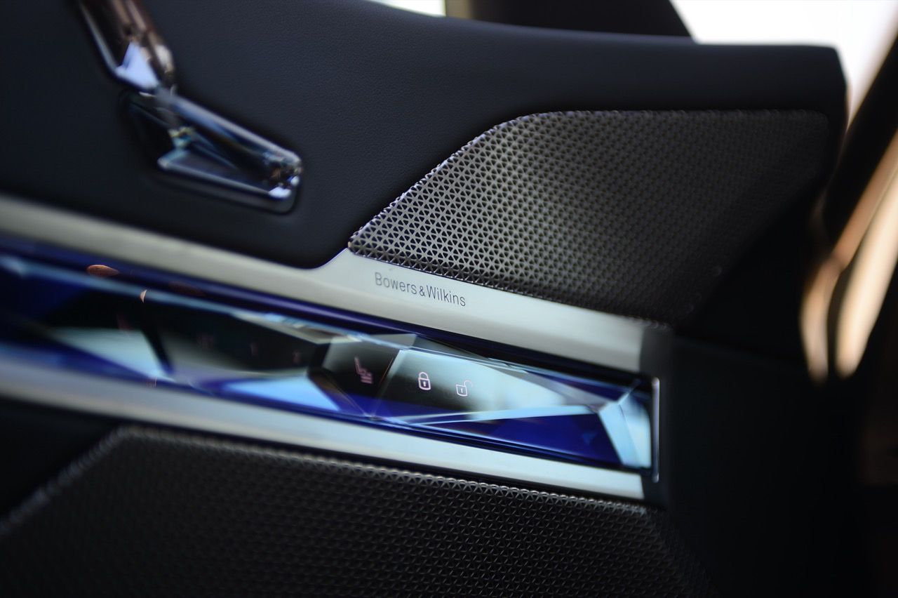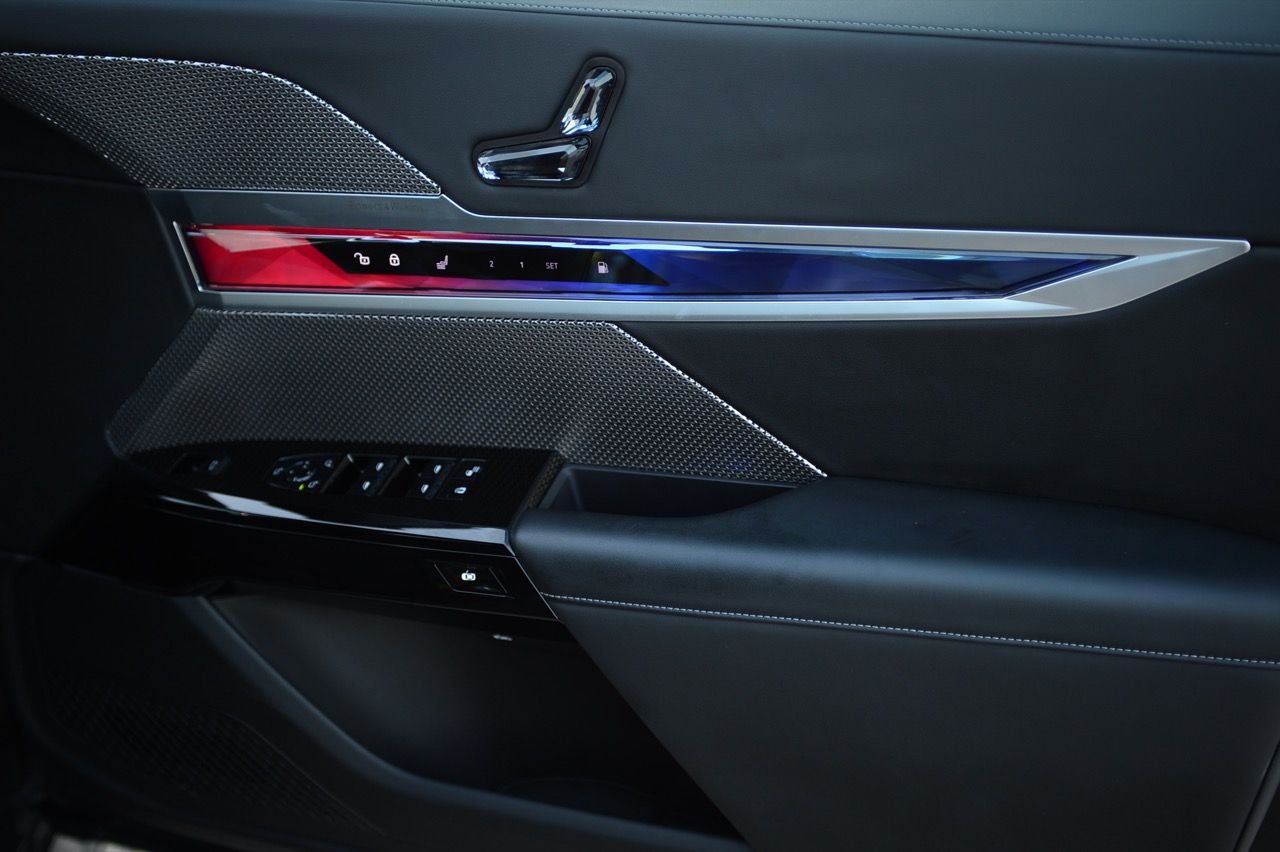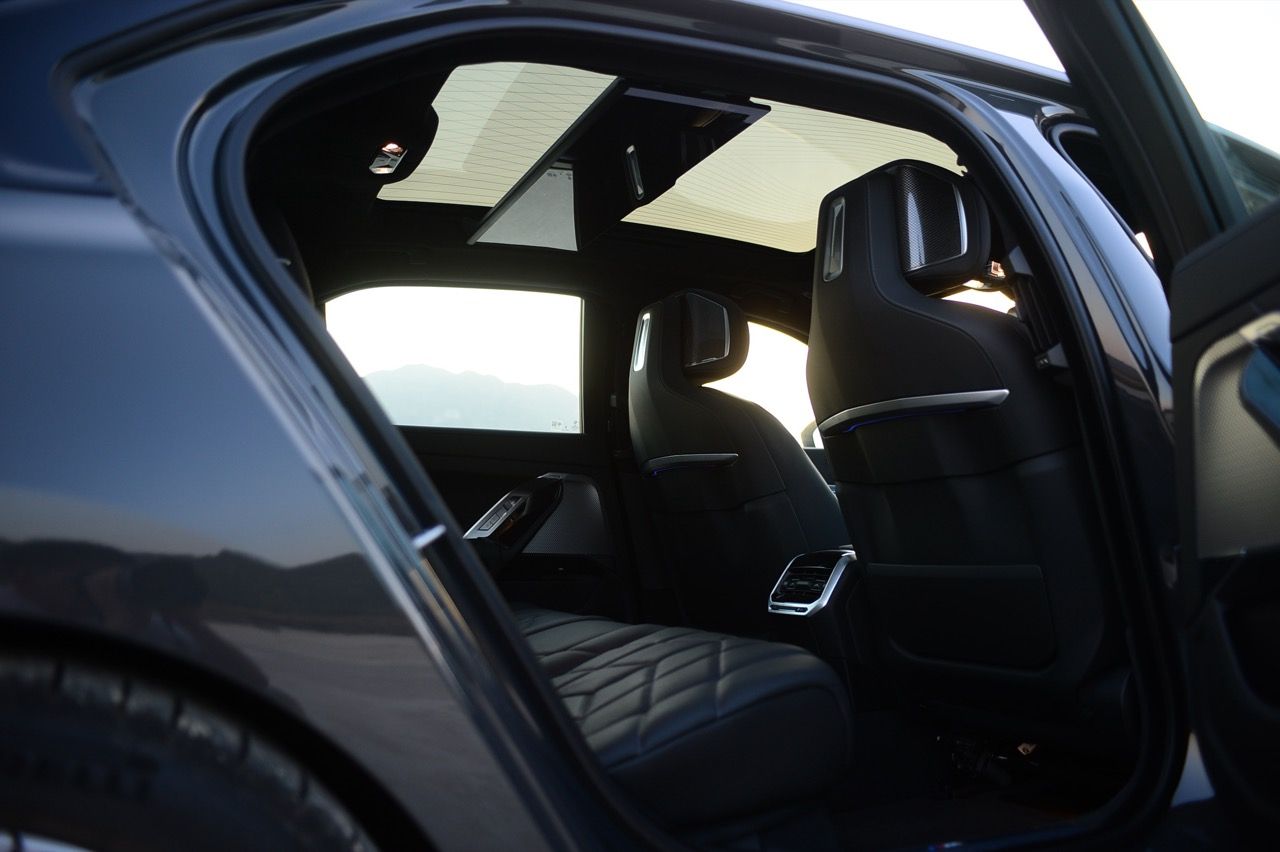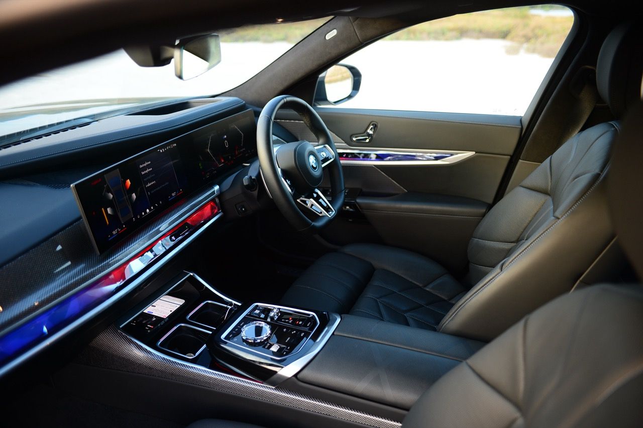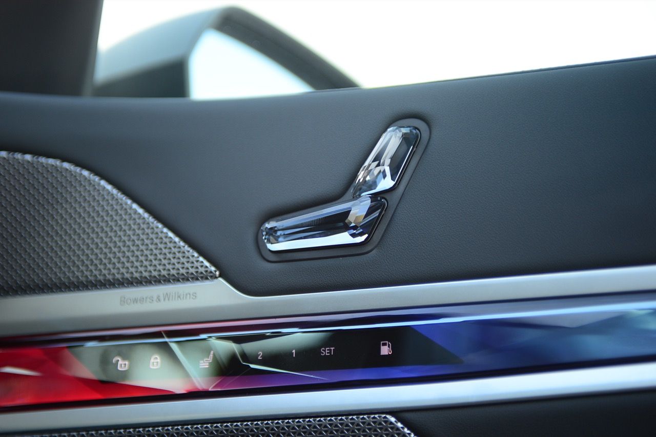 รถทดสอบมาพร้อมกับชุดแต่ง M มีอุปกรณ์หรูหรามากมายมหาศาล เช่น เบาะนั่งด้านหน้าและด้านหลังแบบปรับนวดได้หลายทิศทาง กระจกหลังคาส่องสว่างด้วยเทคนิคพิเศษ, สวิตช์ปรับตั้งต่างๆ ทั้งปรับเบาะ ปุ่ม iDrive สวิตช์คันเกียร์ ทำจากกระจกแก้วคริสตัล, ม่านไฟฟ้า, ระบบเสียง Bowers & Wilkins ที่อัปเกรดกรวยลำโพง และคุณภาพของเสียงจากการปรุงแต่งกำลังขับใหม่หมด รวมถึงประตูอัตโนมัติที่ค่อนข้างหน้าเบื่อดังกล่าวมาข้างต้น จุดเด่นของการโดยสารที่เบาะหลังก็คือ หน้าจอเธียเตอร์ขนาด 31.3 นิ้ว ที่พับซ่อนอย่างแนบเนียนอยู่บนส่วนกลางของผืนหลังคา เพื่อแสดงภาพวิดีโอคมชัดสูงไปยังผู้โดยสารที่นั่งด้านหลังในขณะที่กำลังเดินทาง เป็นแนวทาง Luxury ของรถยนต์สุดหรูที่มักจะขยายขอบเขตการใช้งานด้วยเทคโนโลยีอนาคต และ ณ ตอนนี้ Theater Screen ได้ดึงความสนใจของผู้โดยสารตอนหลัง (ซึ่งส่วนใหญ่เป็นเจ้าของรถ) ให้เพลิดเพลินไปกับภาพยนตร์ใหม่ๆ ใน Netflix